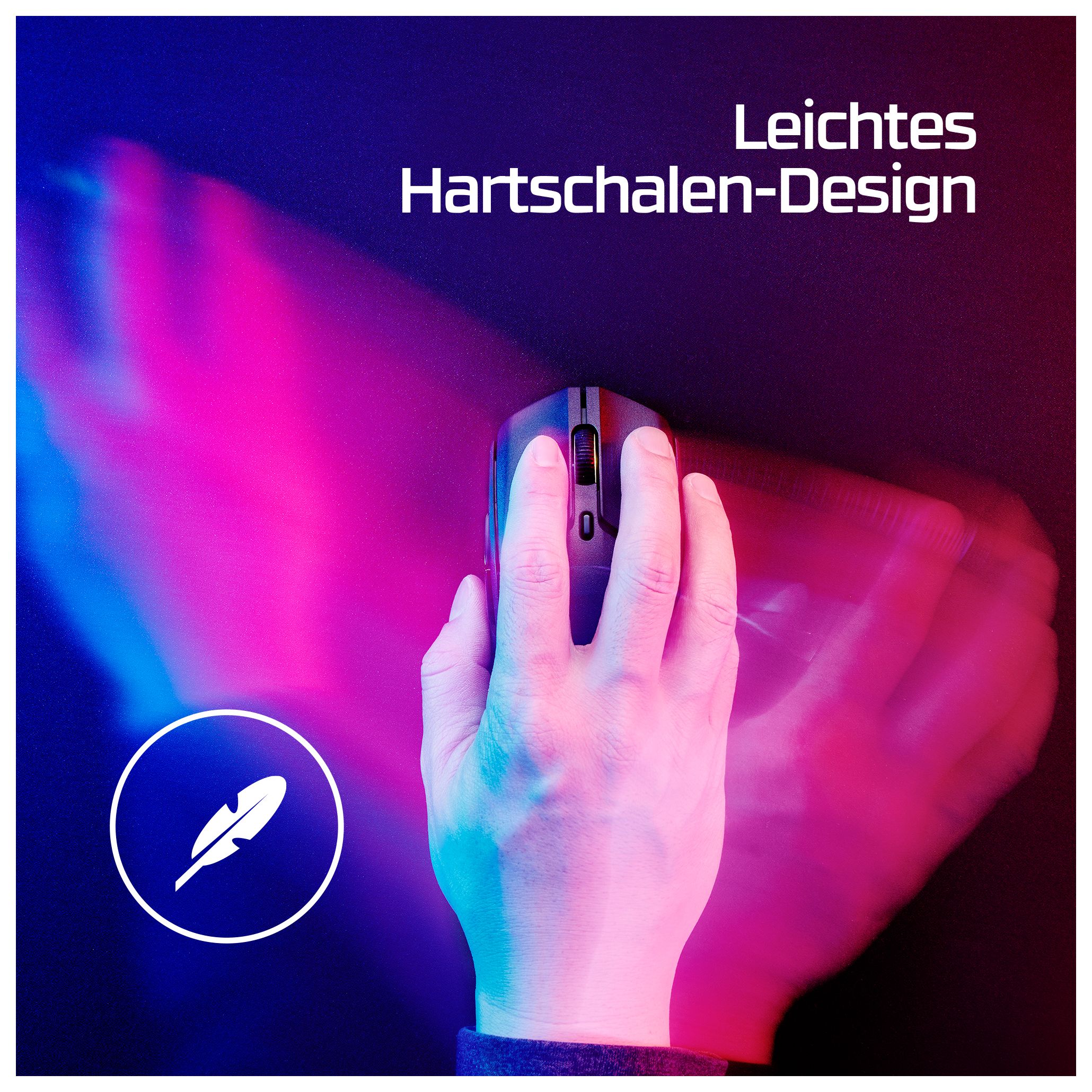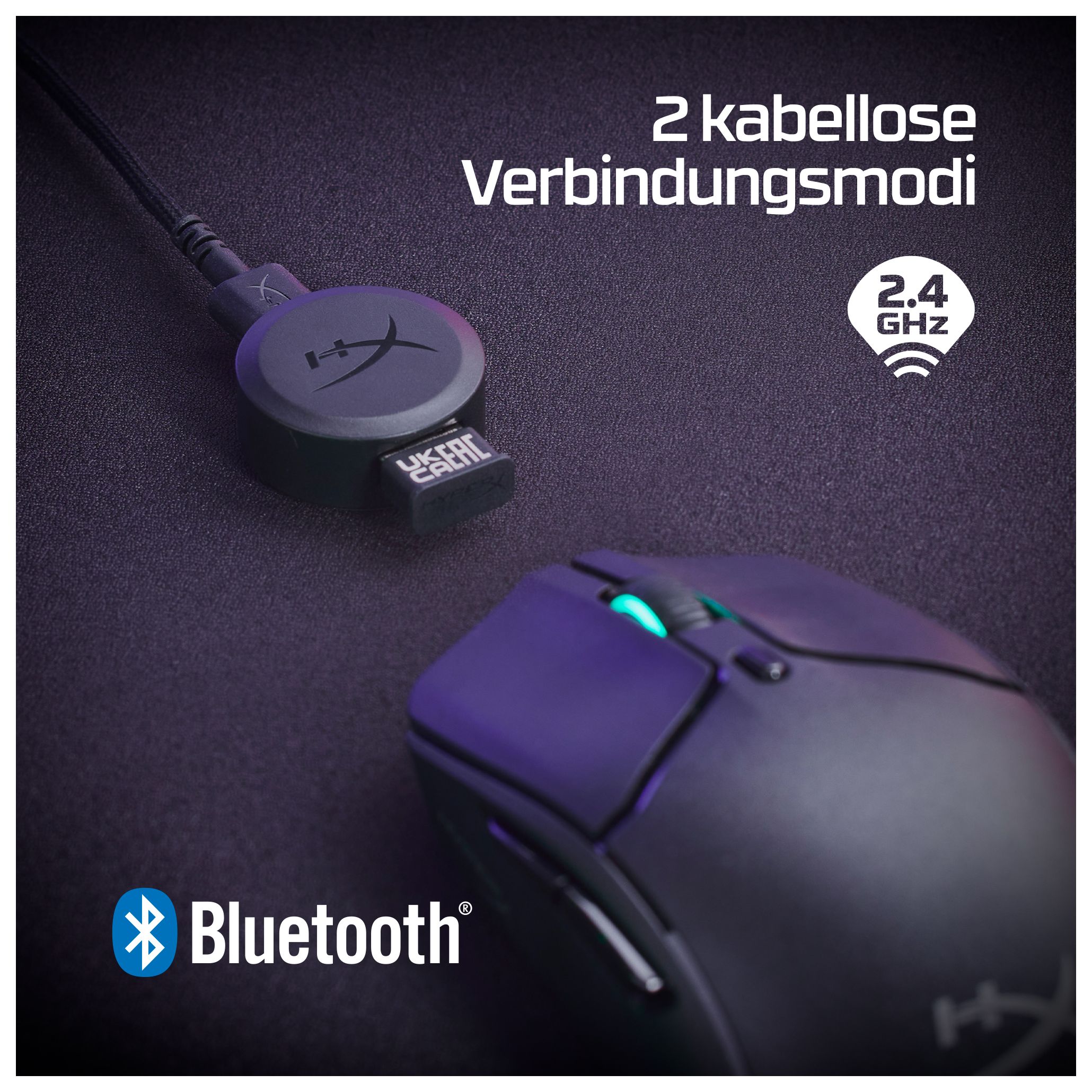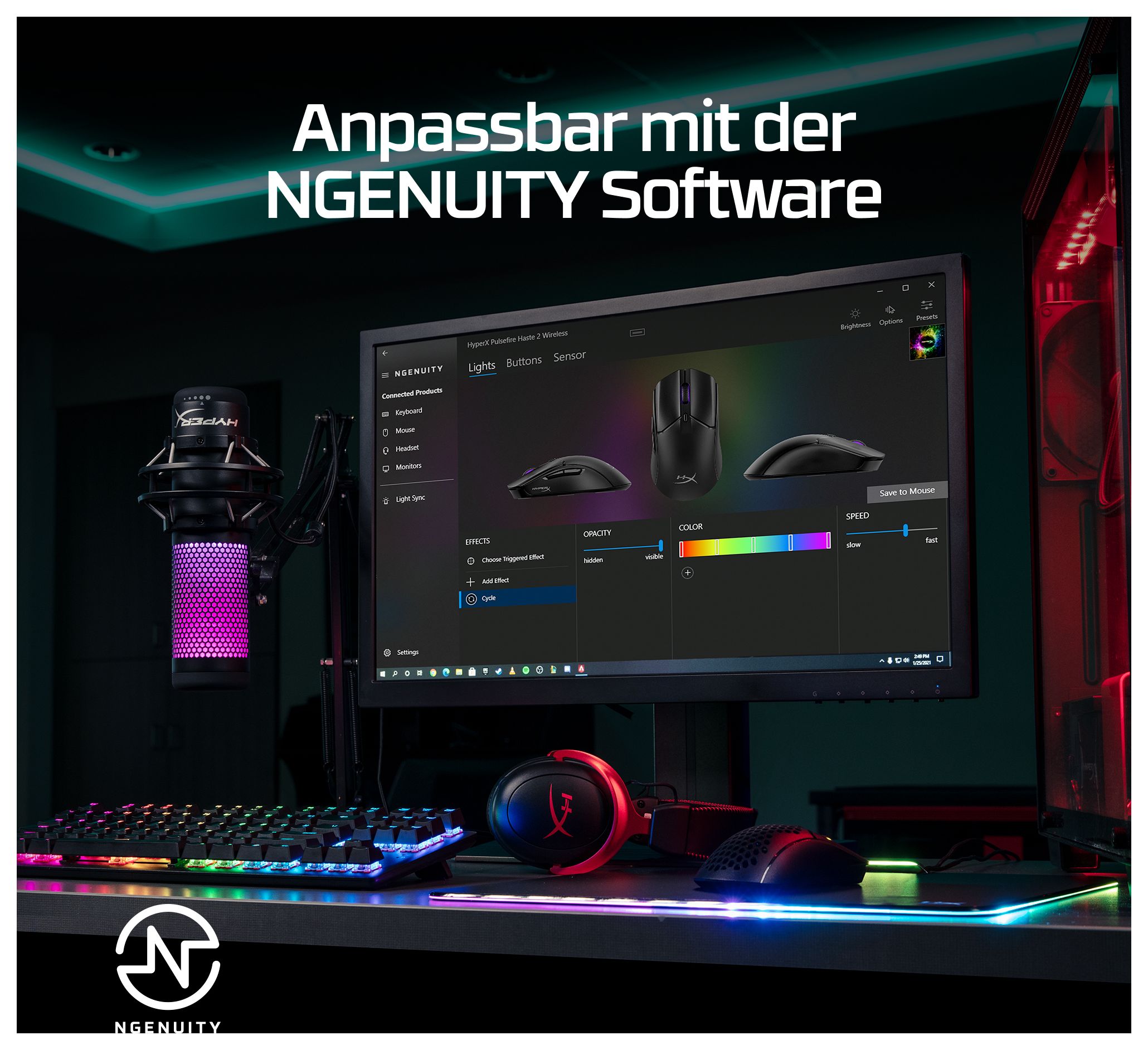 Die HyperX Pulsefire Haste 2 Wireless richtet sich an alle Gamer, die keine Millisekunde verlieren und von der Freiheit einer Wireless-Verbindung profitieren wollen. Dieses Nachfolgemodell verfügt über eine robuste Oberschale. Dabei behält es die 61 g[3] Gewicht und die 100 Stunden[2] Akkulaufzeit der ursprünglichen Pulsefire Haste, bietet aber auch einige Verbesserungen. Die Pulsefire Haste 2 Wireless bietet Dual Mode-Wireless-Konnektivität mit 2,4 GHz Wireless- und Bluetooth-Verbindungen. Über das Ladekabel kannst du sie dabei im kabelgebundenen Modus laden. Außerdem haben wir eine ganze Reihe von speziellen leistungsstarken HyperX Komponenten entwickelt, zum Beispiel den präzisen HyperX 26K- Sensor mit 26.000 dpi nativer Auflösung und einer Tracking-Geschwindigkeit von bis zu 650 IPS. Unsere speziellen HyperX Switches liefern einen überzeugenden Klick nach dem anderen mit haptischem und akustischem Feedback und sind auf eine Lebensdauer von bis zu 100 Millionen Klicks ausgelegt. Mit hochwertigen PTFE-Rollen mit geringer Reibung sowie dem mitgelieferten Grip-Tape profitierst du außerdem von einer erstklassigen Kontrolle deiner Maus. Optimiere mit der HyperX NGENUITY Software jede Mausbewegung, erstelle Makros für die 6 programmierbaren Tasten, passe deine DPI-Einstellungen an und individualisiere die RGB-Beleuchtung.
