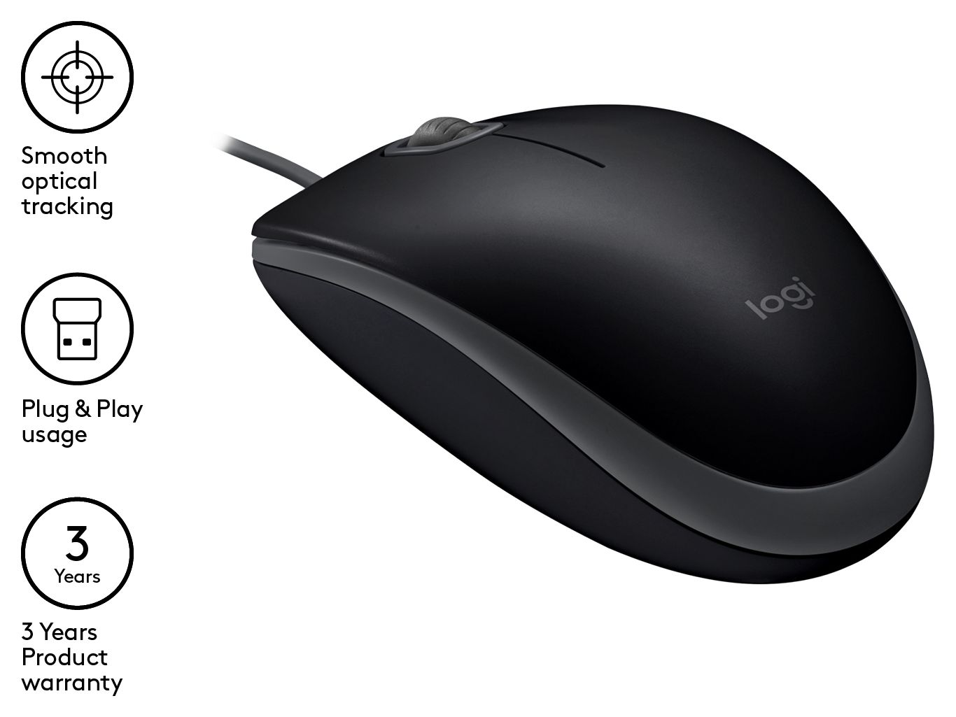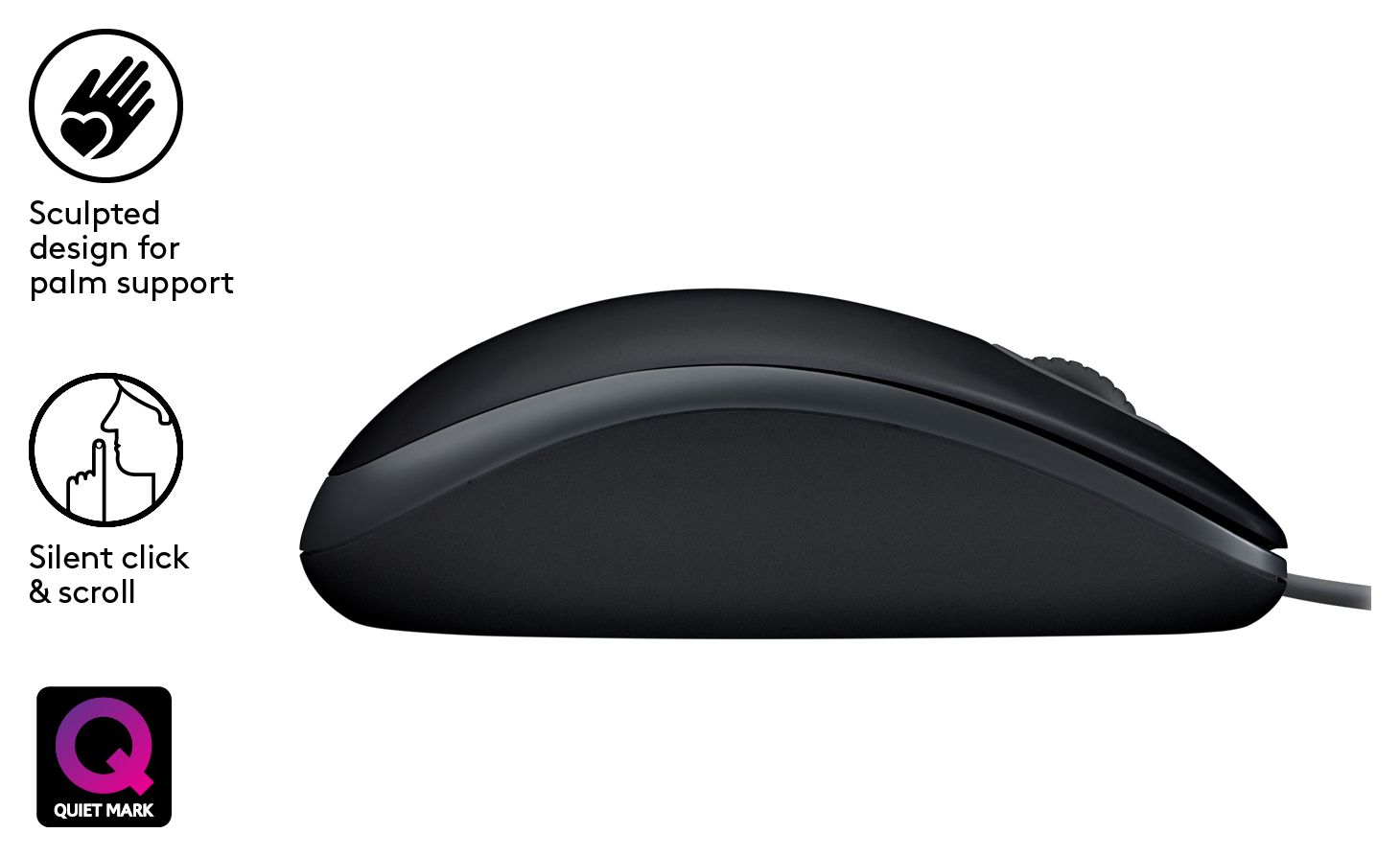 Logitech B110 Silent. Formfaktor: Beidhändig. Bewegungerfassungs Technologie: Optisch, Geräteschnittstelle: USB Typ-A, Bewegung Auflösung: 1000 DPI, Tastentyp: Gedrückte Tasten, Knopfanzahl: 3, Scroll Typ: Rad. Energiequelle: Kabel. Produktfarbe: Schwarz