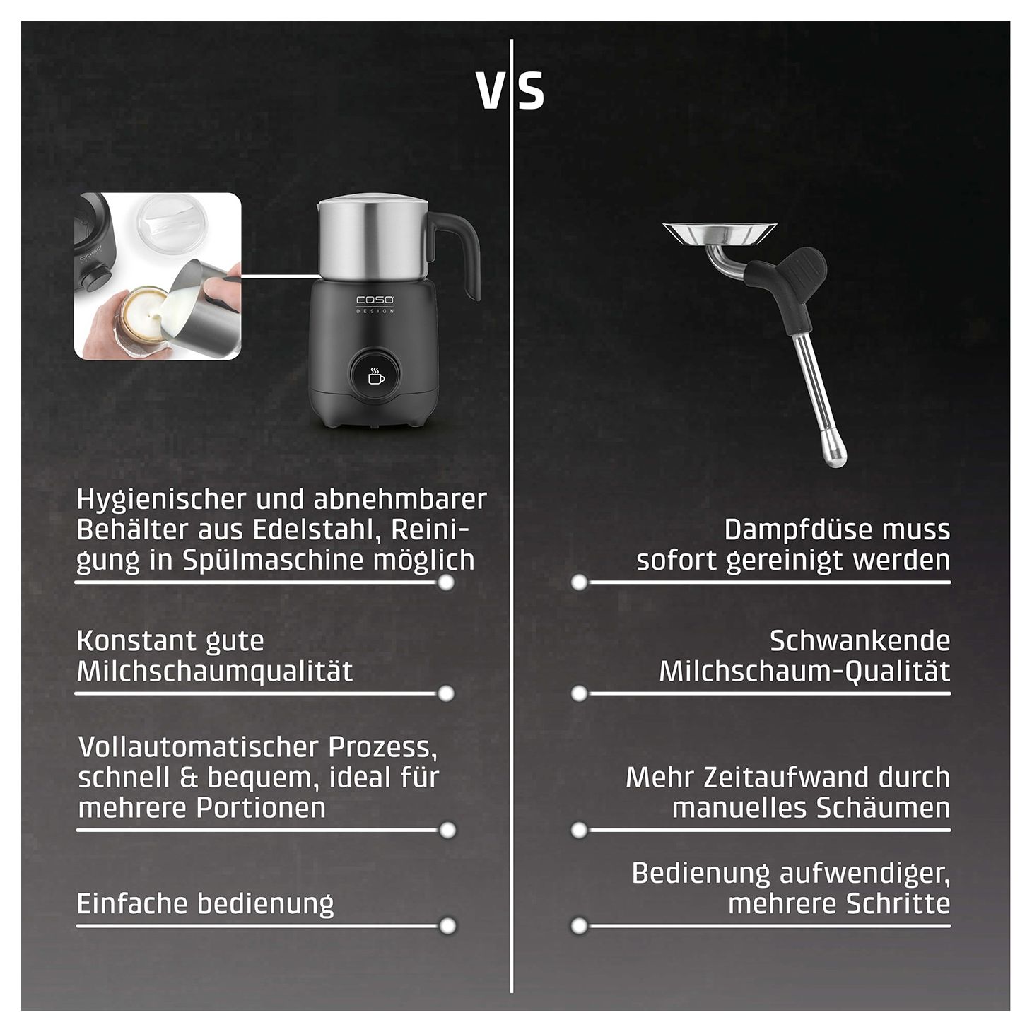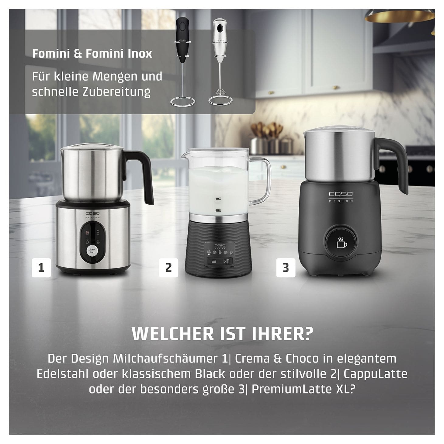 Der PremiumLatte XL von CASO Design bringt professionellen Milchschaumkomfort in Ihre Küche – größer, smarter und vielseitiger als je zuvor. Mit einem besonders großzügigen 1-Liter-Edelstahlbehälter zaubert dieser Milchaufschäumer bis zu 750 ml feinporigen Milchschaum. Damit erzeugt er drei Mal so viel Milchschaum wie viele herkömmliche Geräte – ideal für Familien, Besuch oder ausgedehnten Genussmoment allein. Ob cremiger Cappuccino, luftiger Latte Macchiato oder heiße Schokolade – der PremiumLatte XL macht jeden Schluck zum Erlebnis.