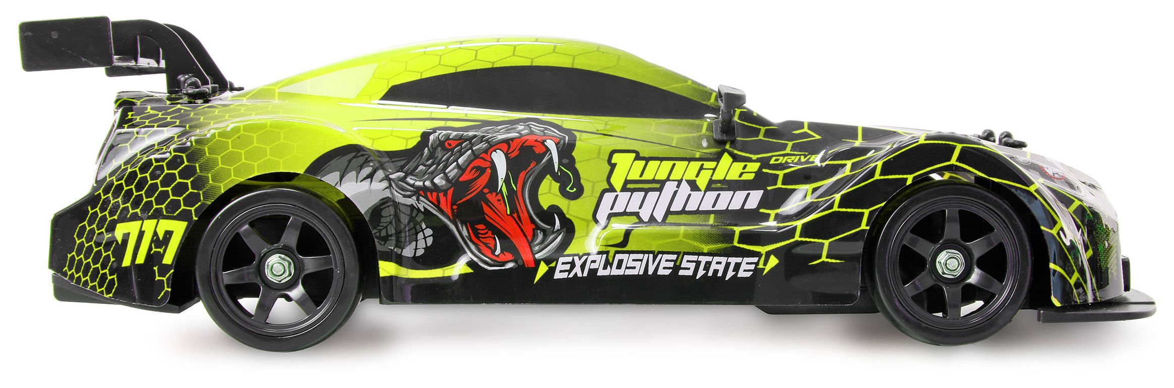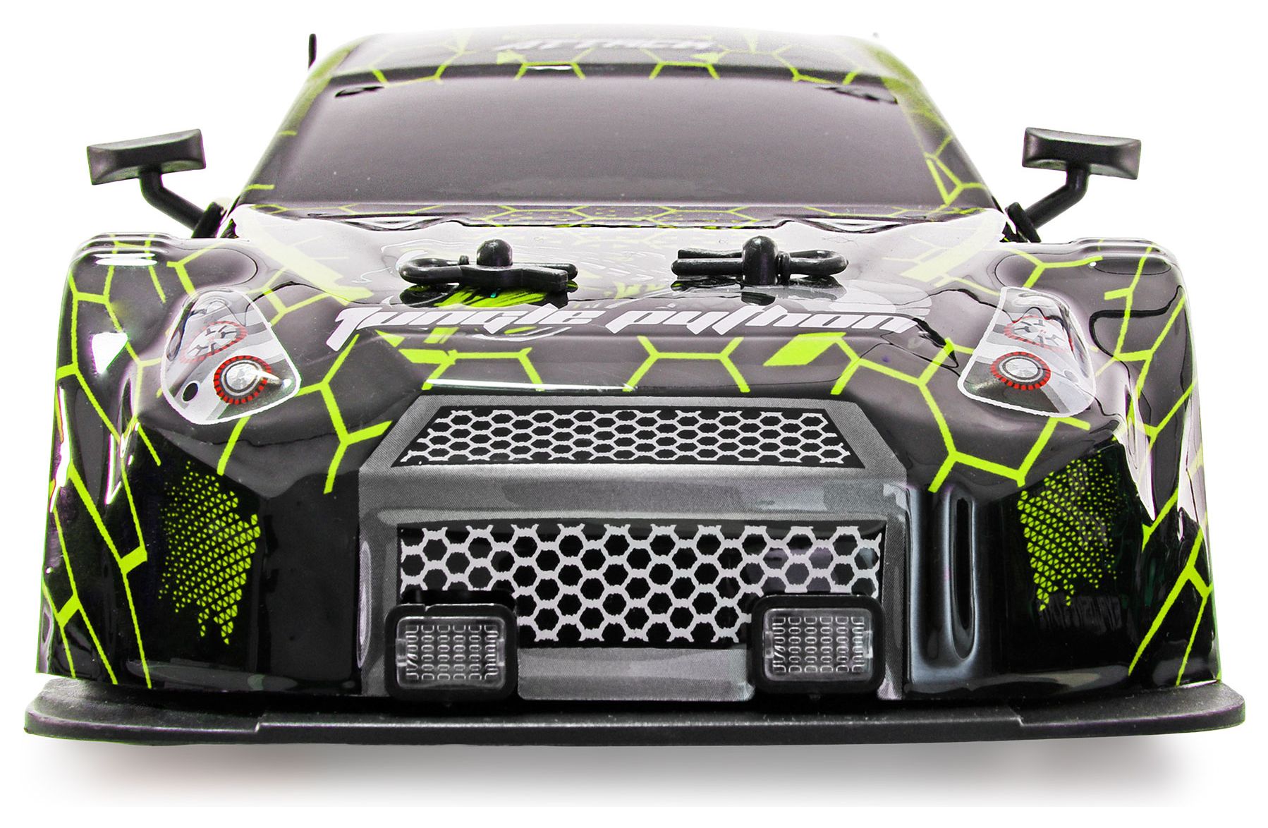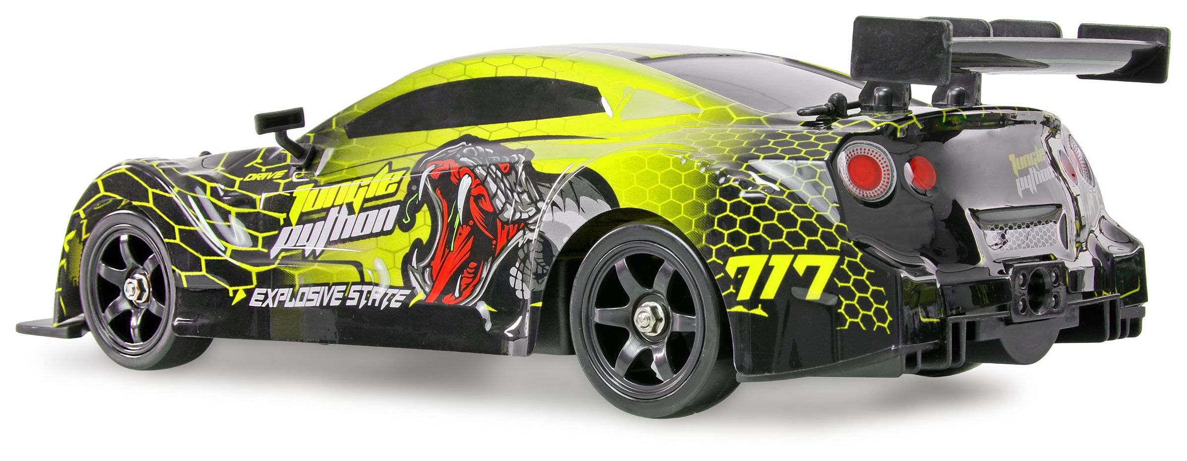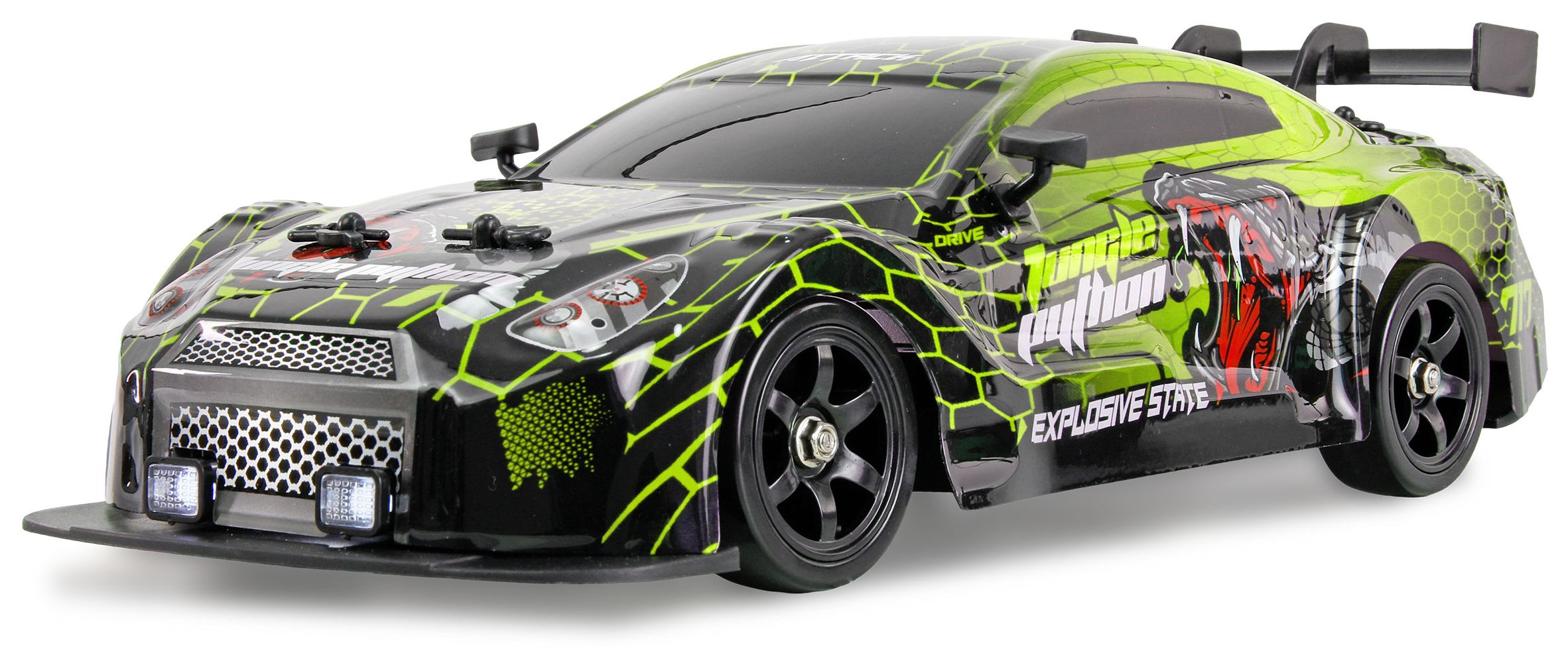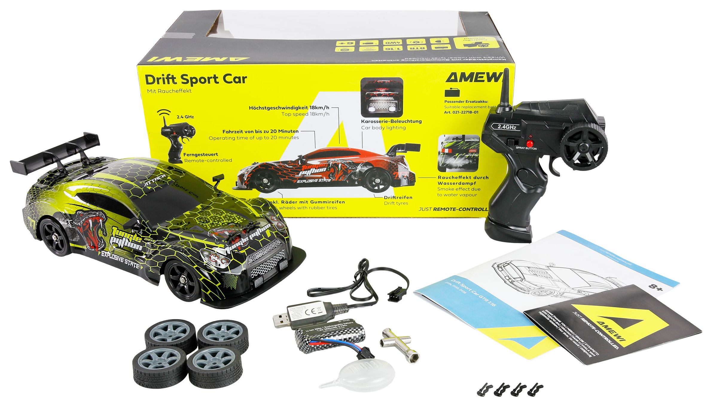 Das Fahrzeug ist mit einem 4WD-Allradantrieb ausgestattet, der für optimale Traktion auf verschiedenen Untergründen sorgt. Durch den einfachen Reifenwechsel kann das Modell von Driftreifen mit Kunststoffauflage auf Zusatzreifen mit Gummiprofil umgerüstet werden, wodurch sich das Fahrzeug im Handumdrehen von einem Drifter zu einem schnellen Rennauto verwandelt. Die Karosserie besteht aus robustem ABS-Kunststoff und wird durch integrierte LED-Beleuchtung eindrucksvoll in Szene gesetzt.