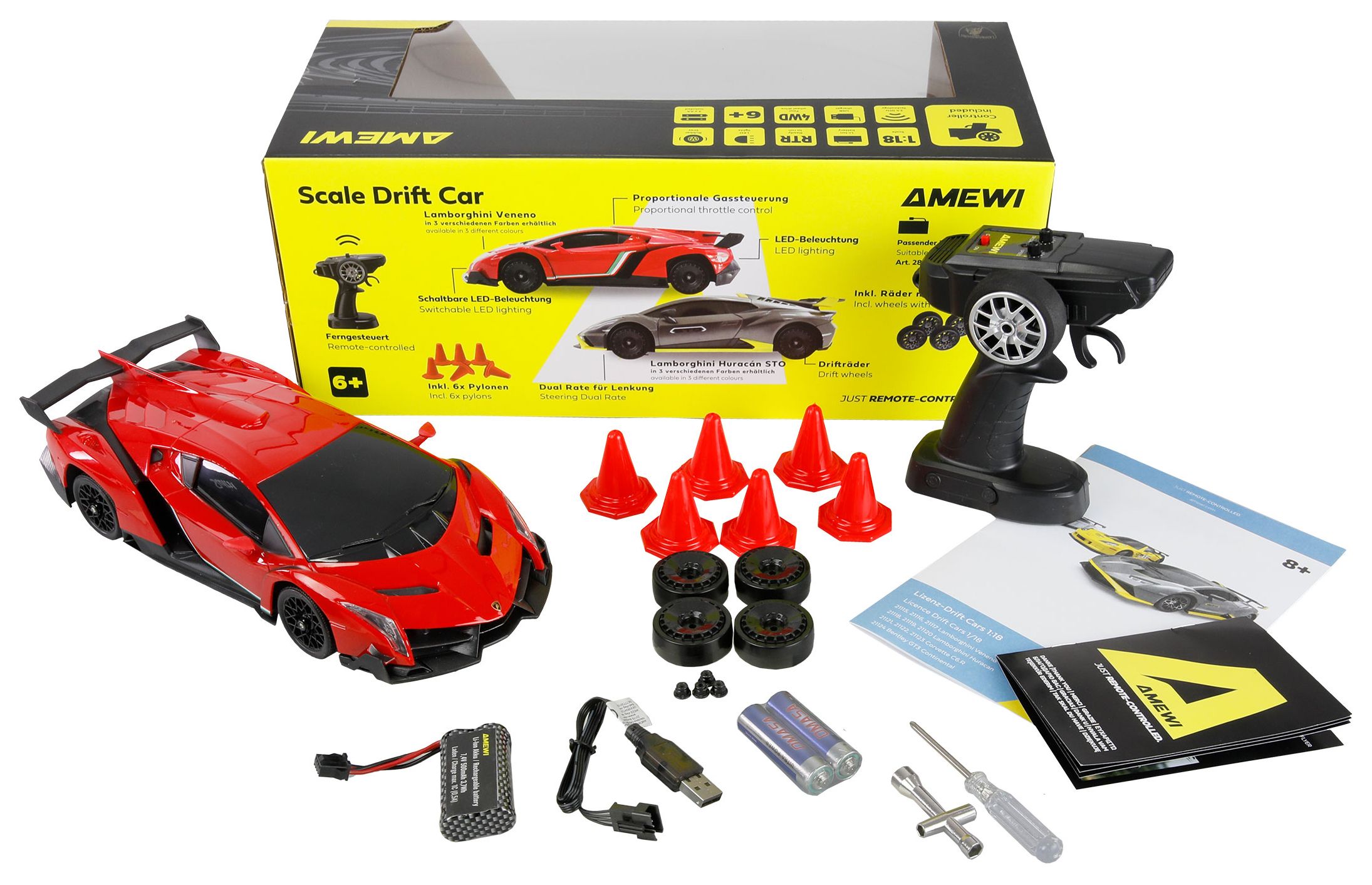 Das Modell kommt als RTR-Ausführung (Ready-to-Run) komplett ausgestattet direkt aus der Box: Fernsteuerung, Akku, USB-Ladekabel, Pylonen, Straßen- und Driftreifen, Ersatzradmuttern sowie ein Werkzeug zum Reifenwechsel sind bereits enthalten - alles, was für den sofortigen Fahrspaß benötigt wird. Die widerstandsfähige ABS-Karosserie verzeiht kleinere Zusammenstöße mühelos, während das moderne 2,4GHz-Funksystem für eine stabile Verbindung ohne Störungen sorgt.