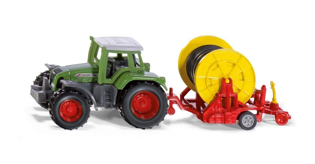 Für Plantagen mit erhöhtem Wasserbedarf oder in trockenen Sommern werden mobile Beregnungsanlagen genutzt. Der SIKU-Fendt Traktor mit Bewässerungshaspel ist die spielerische Umsetzung dieses Teils der Gemüse-Erntekette. Die Verteiler-Spritze ist für den Straßentransport an die Haspel angehängt. Auf dem Feld wird der Schlauch von der Haspel gerollt, an die Spritze gehängt, so dass ein großer Bereich mit Wasser versorgt werden kann. Nach Beendigung der Feldberegnung wird der Schlauch wieder aufgerollt und die Spritze angehängt.