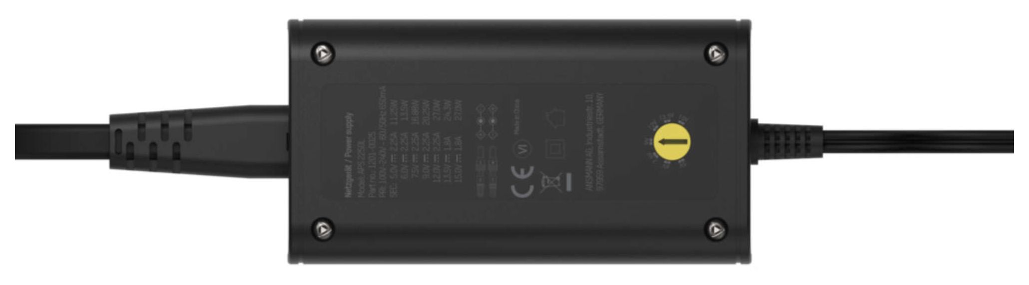 Über einen Drehschalter, auf der Rückseite des Netzteils, kann die Ausgangsspannung eingestellt werden. Das APS 2250L ist kurzschlussfest und spannungsstabilisiert. Geeignet für Verbraucher bis max. 2,25 A, 27 W Leistung.