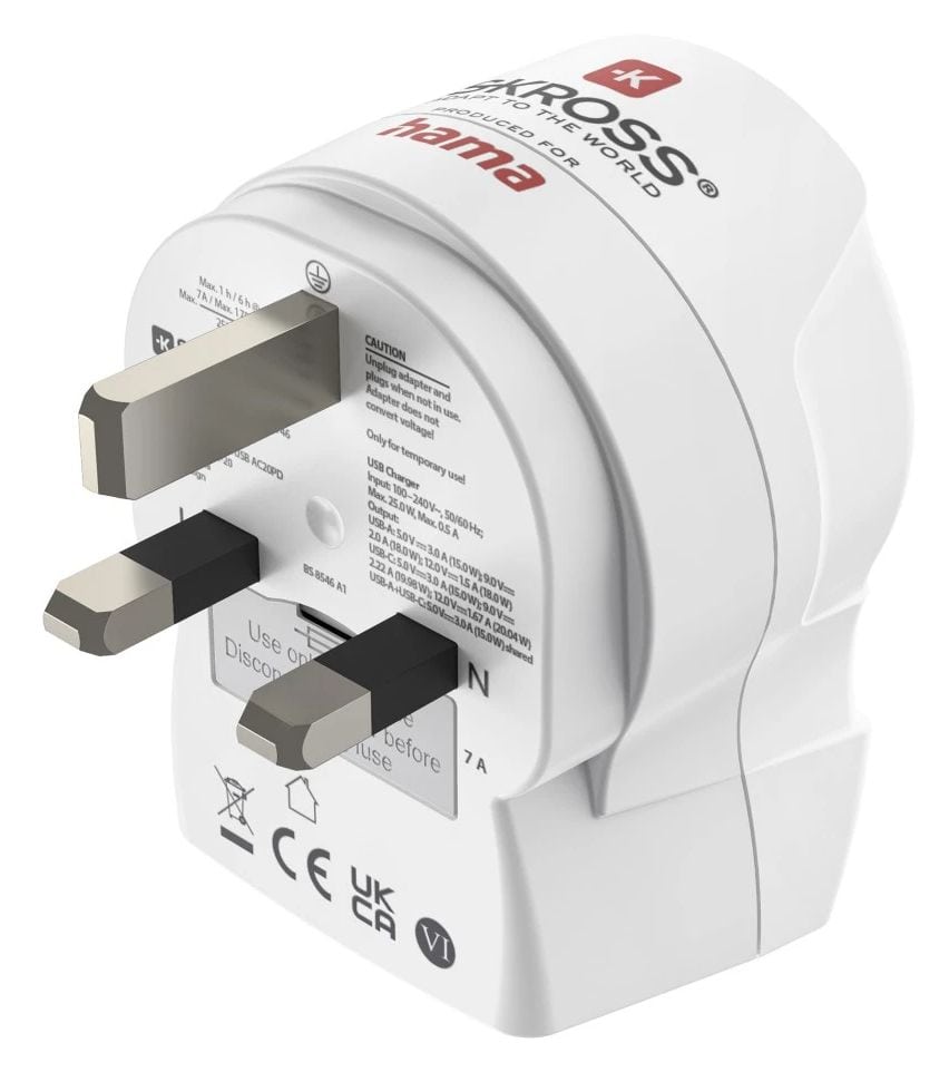 Hama EU to UK. Anschlussstecker-Typ: Typ G (VK), Buchsenstecker-Typ: Typ C (Eurostecker) + Typ F, Anschluss1 Formfaktor: Gerade. Breite: 54 mm, Tiefe: 69 mm, Höhe: 76 mm