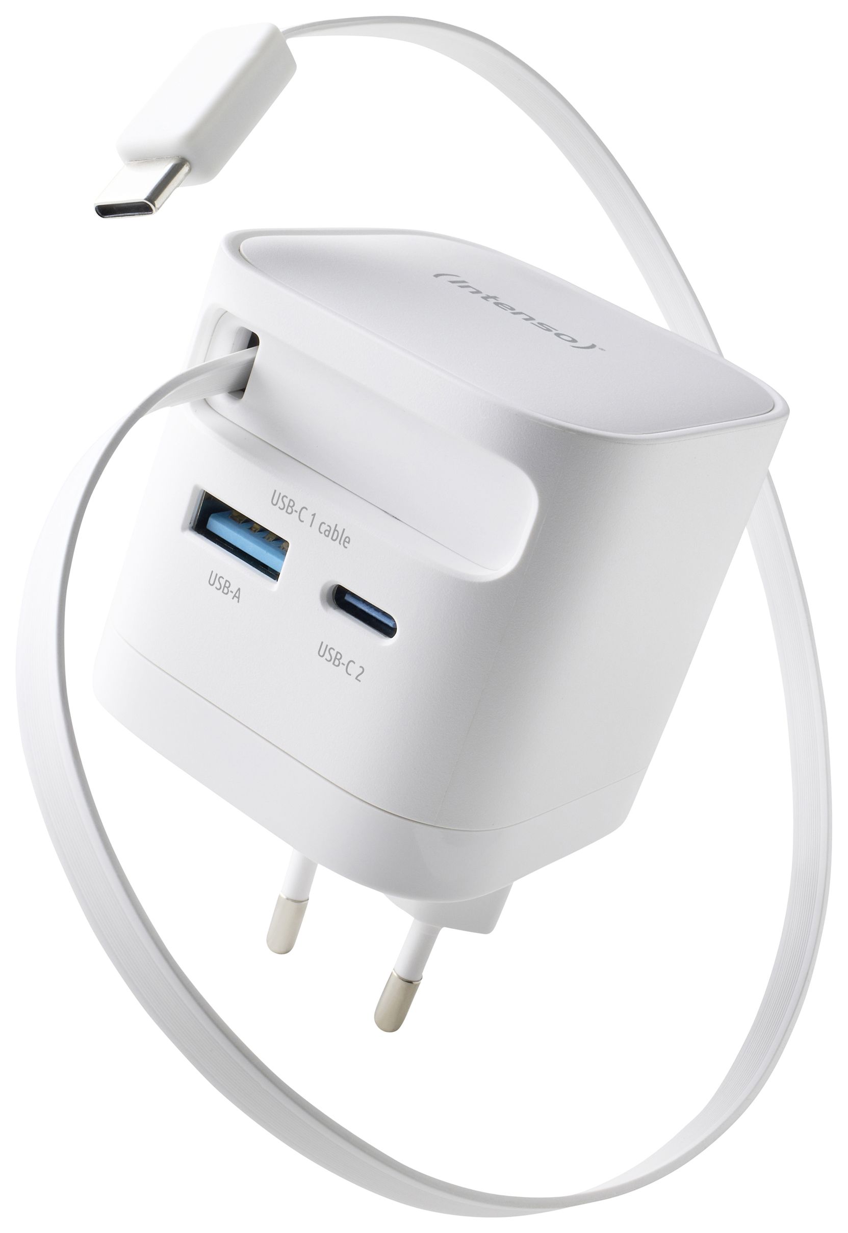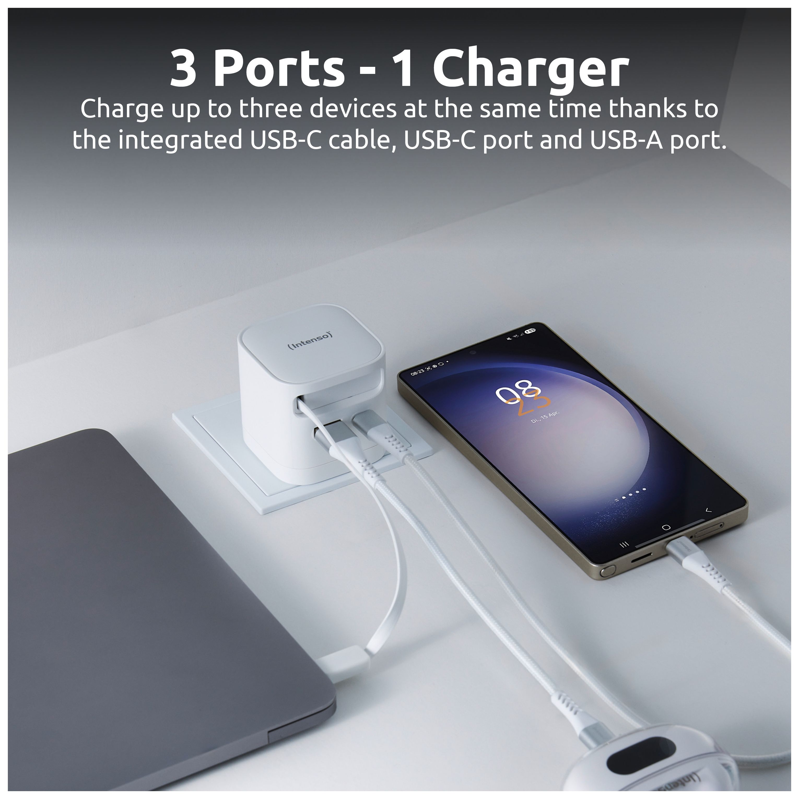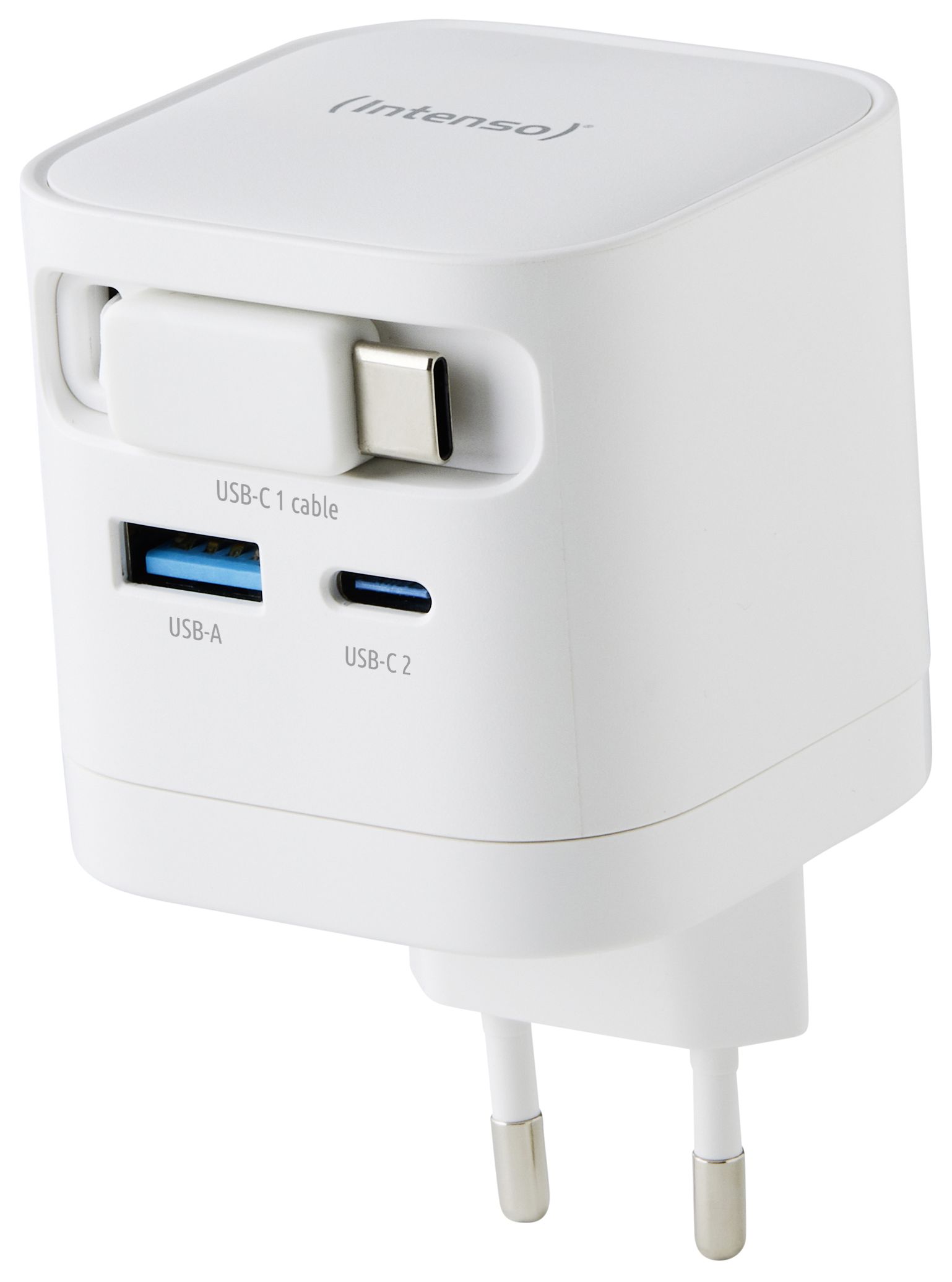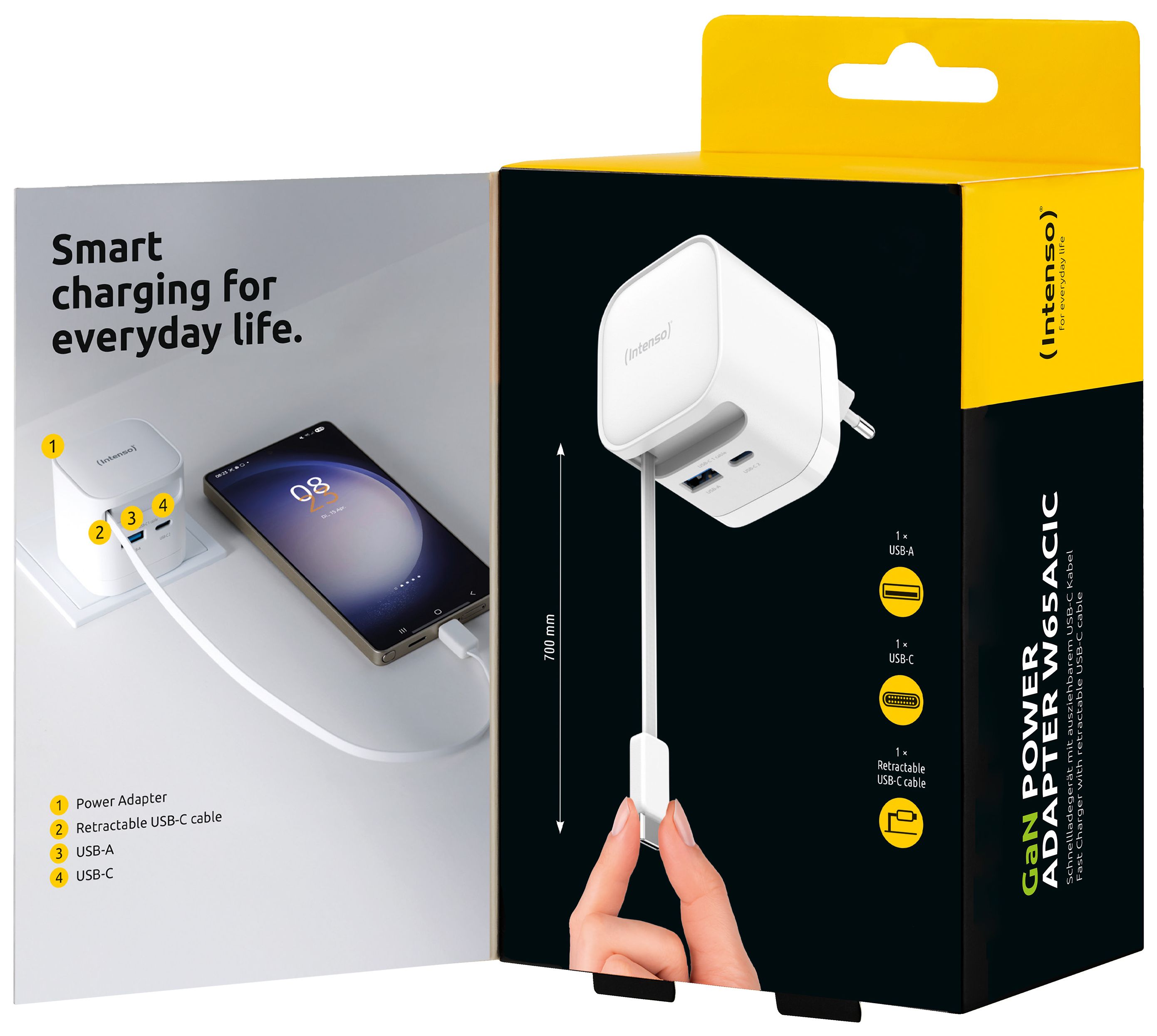 Intenso W65ACIC GaN USB-C Power Adapter 65 W mit integriertem ausziehbarem USB-C Kabel, 2 Zusatzports (USB-C, USB-A), EU-Stecker, weiß