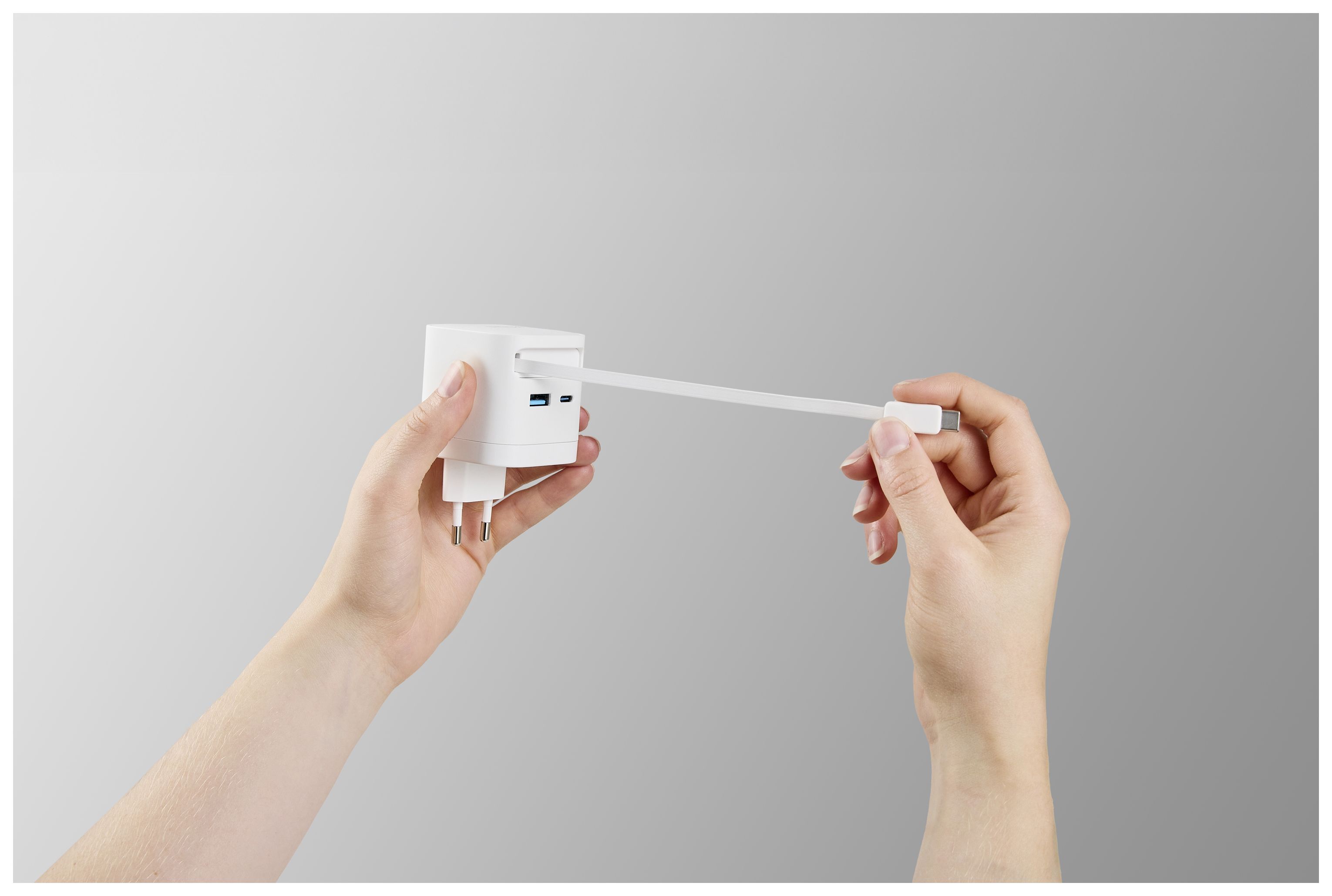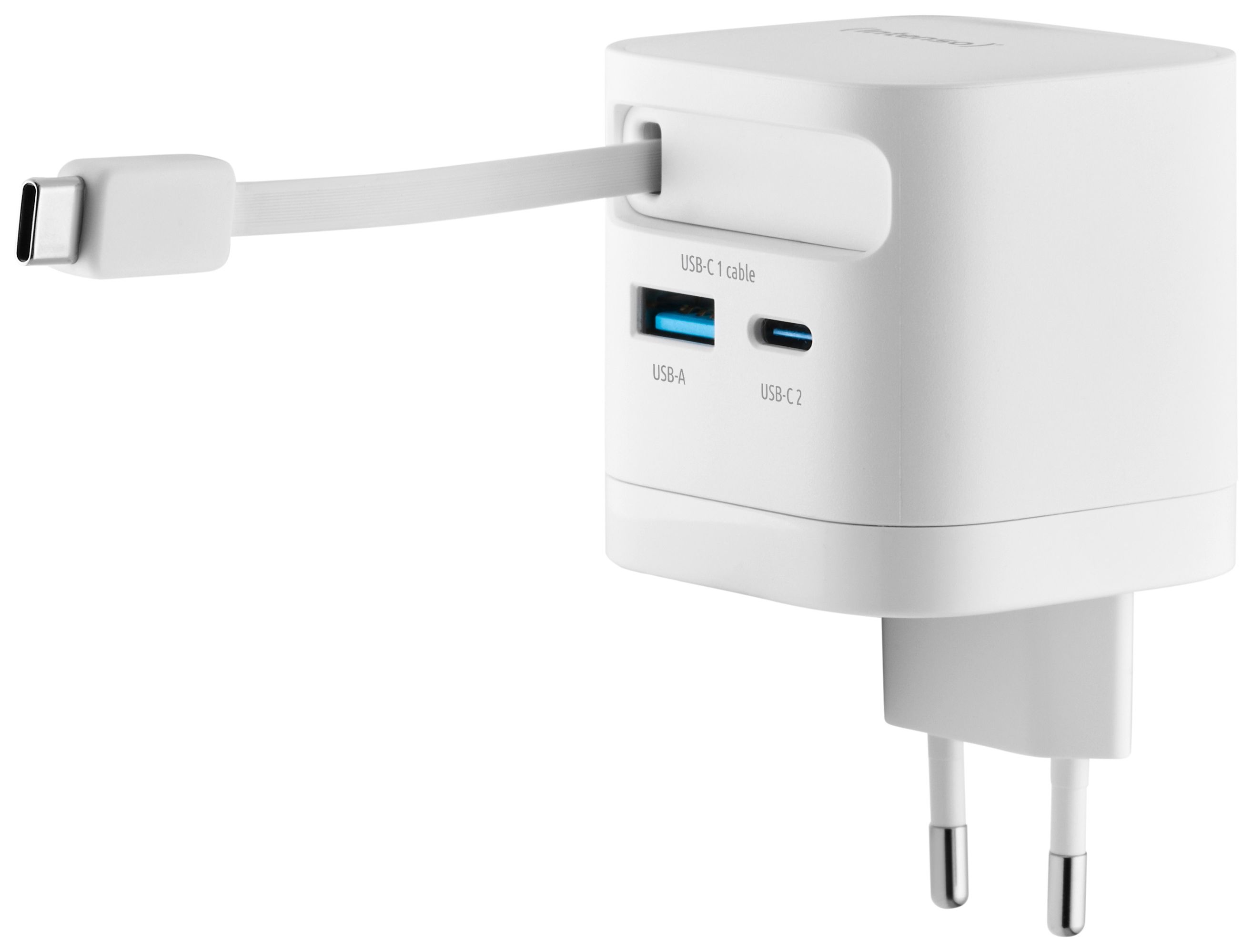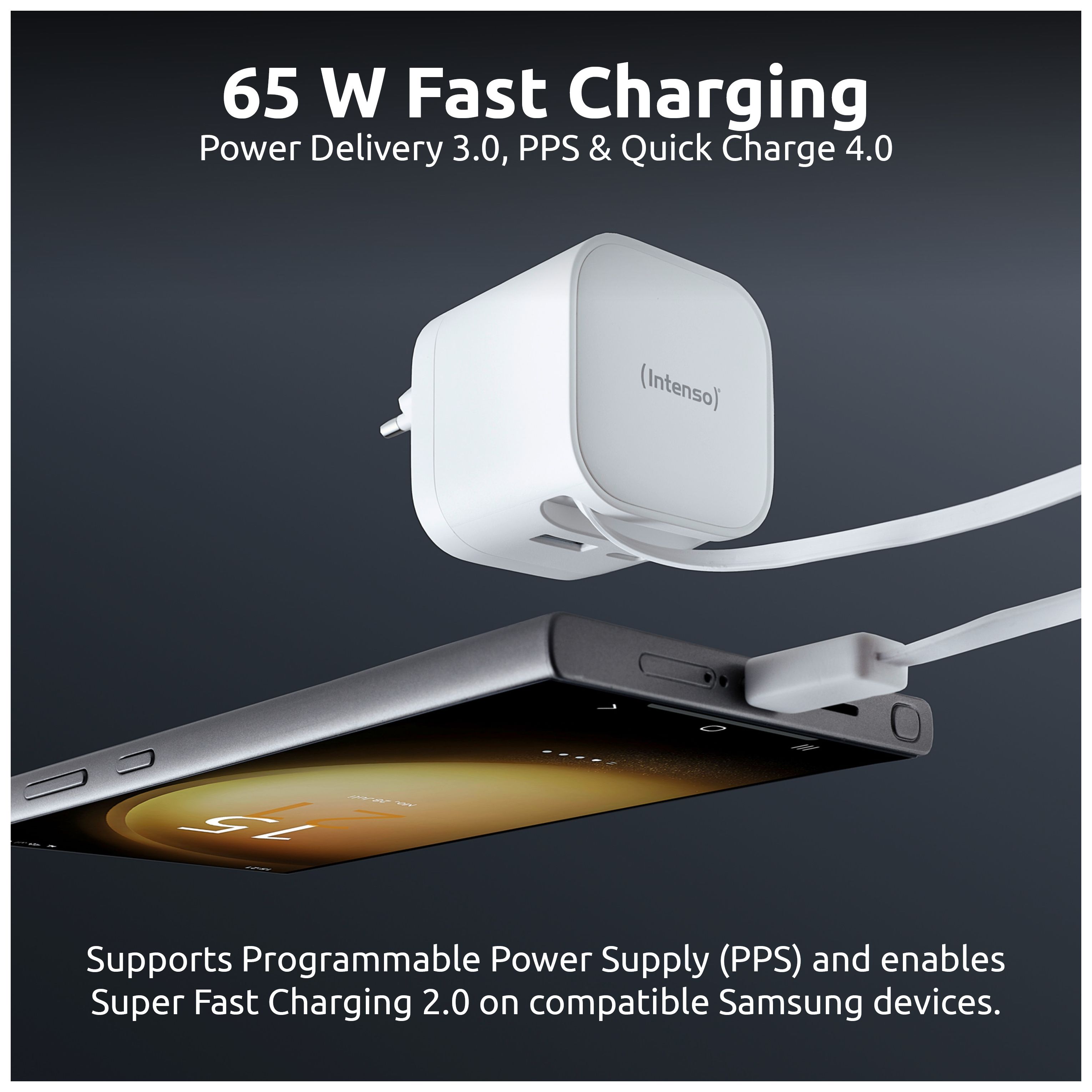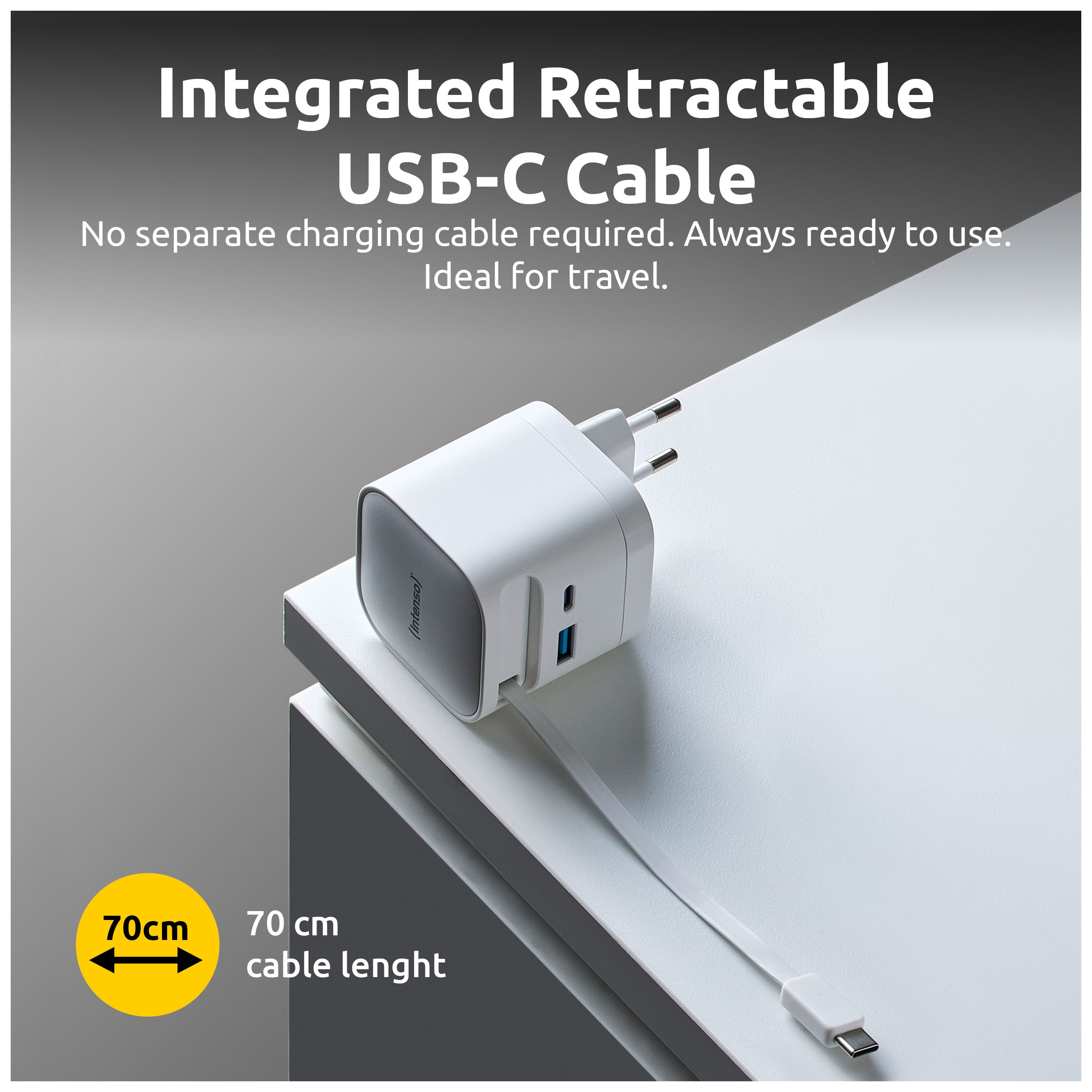 Intenso W65ACIC GaN USB-C Power Adapter 65 W mit integriertem ausziehbarem USB-C Kabel, 2 Zusatzports (USB-C, USB-A), EU-Stecker, weiß