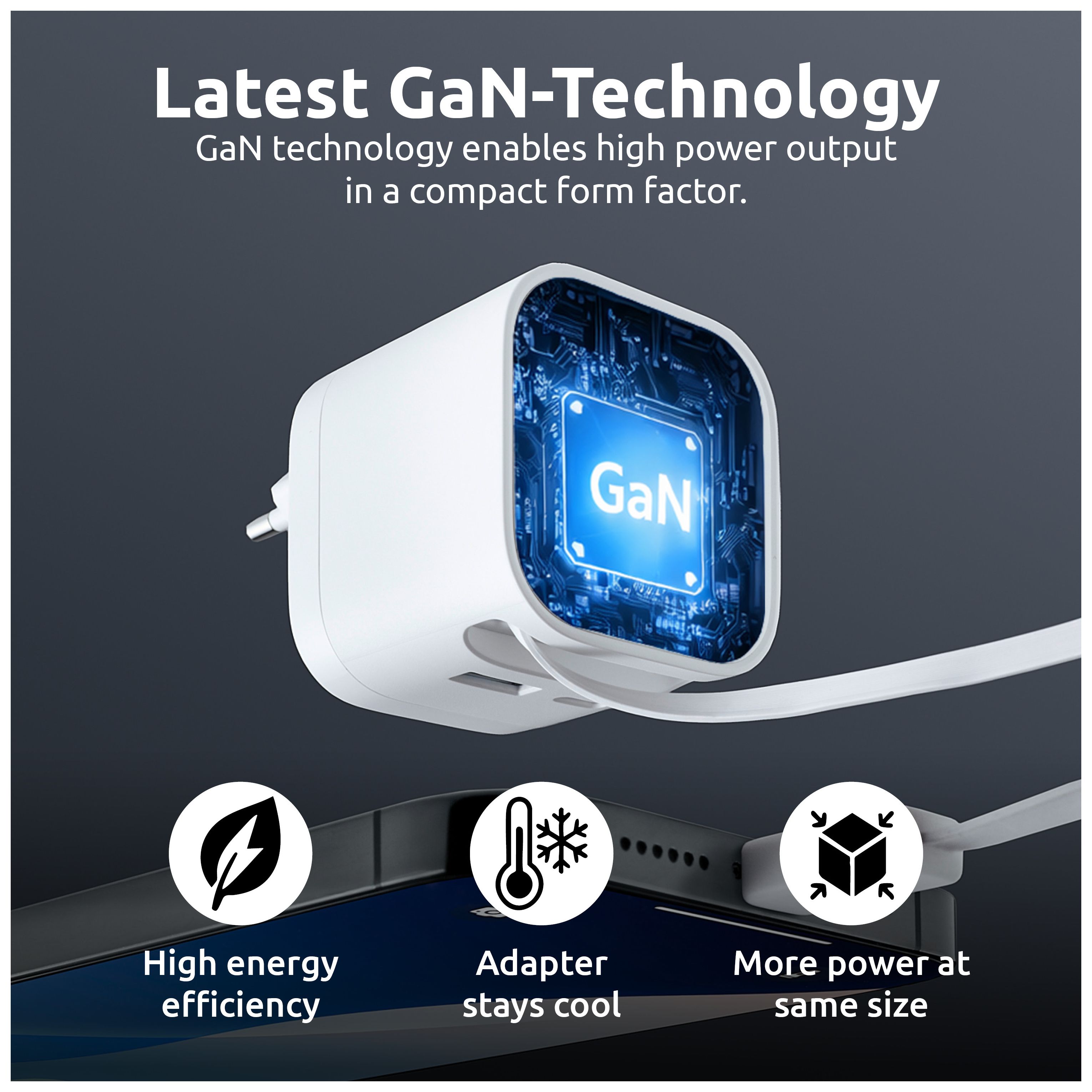Der Intenso W65ACIC ist ein kompakter 65-W-GaN-Power-Adapter mit integriertem, ausziehbarem USB-C-Kabel. Dank USB Power Delivery 3.0, PPS und zusätzlichem USB-C- sowie USB-A-Port eignet sich das Ladegerät zum gleichzeitigen Laden von Smartphones, Tablets und Laptops. Die GaN-Technologie ermöglicht hohe Effizienz bei kompakten Abmessungen und geringer Wärmeentwicklung. Ideal für mobiles Arbeiten, Reisen und den täglichen Einsatz.