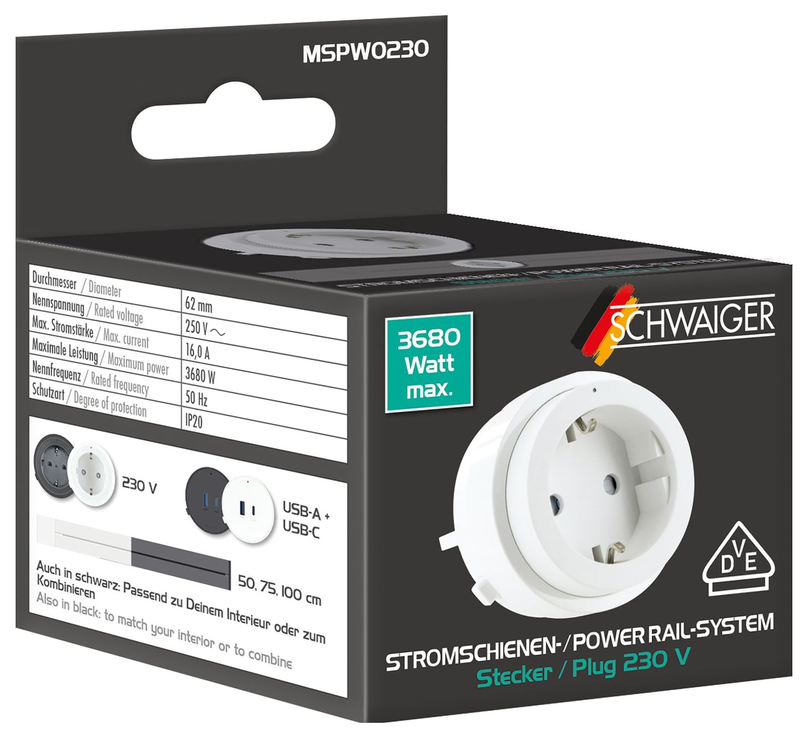 Die SCHWAIGER® USB- und Haushaltssteckdosenadapter für die modulare Stromschiene ermöglichen eine flexible und individuell anpassbare Stromversorgung. Mit dem Click & Twist System lassen sich die Adapter einfach und sicher in die Stromschiene integrieren, ganz ohne Werkzeug an einer beliebigen Stelle auf der Stromschiene. Sie bieten die Möglichkeit, Haushalts-Steckdosen und moderne USB-Ladeanschlüsse zu kombinieren, um Ihren Bedürfnissen gerecht zu werden. Zudem lassen sich die Adapter per Drehregler schnell ein- oder ausschalten und bieten eine Leistung von bis zu 3680 W bzw. 20 W bei USB-Anschlüssen.