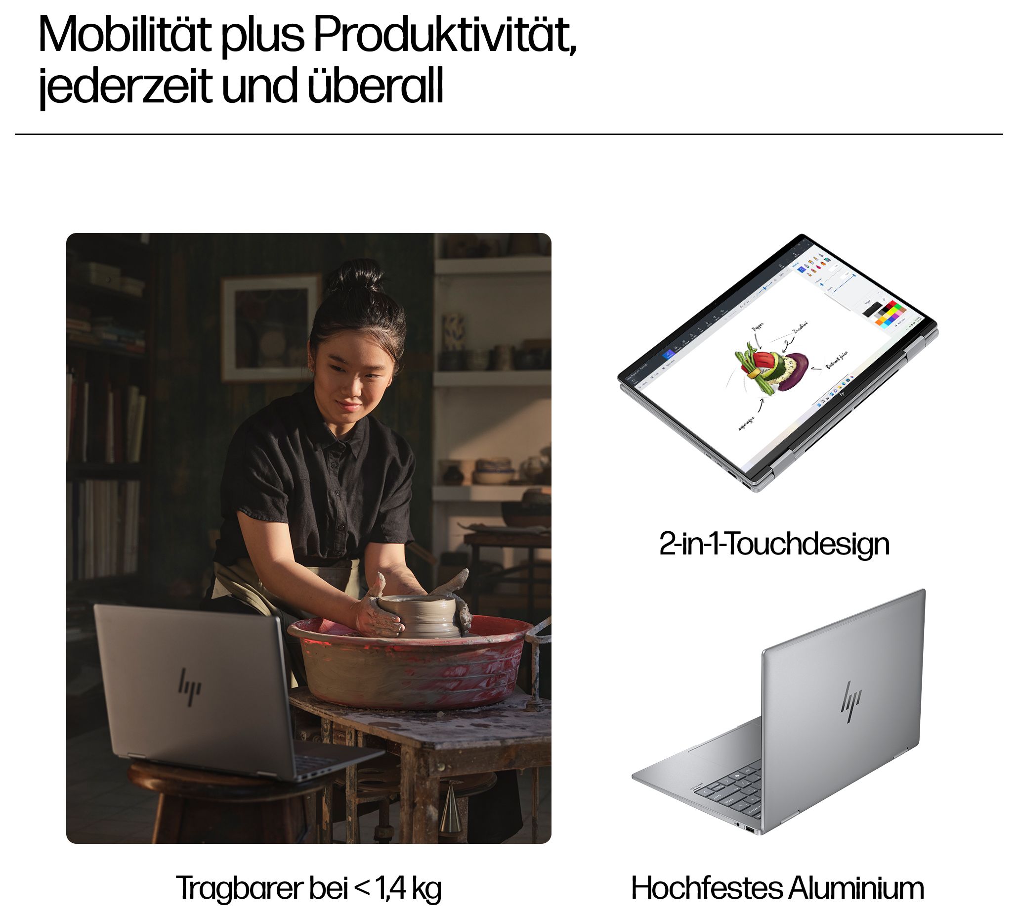 Steigere deine Produktivität mit dem HP Envy x360 14 Zoll 2-in-1-Laptop-PC. Mit einer Kombination aus KI-Technologie und dem neuesten AMD-Prozessor[1] sorgt er für eine bessere Verarbeitungsgeschwindigkeit, Effizienz und Akkulaufzeit. Dank dem 2-in-1-Modell kannst du einfach zwischen Laptop und Tablet wechseln. Dieser Laptop-PC ist aus Recyclingmaterial hergestellt und wird ohne Plastik verpackt – gut für dich und die Umwelt.