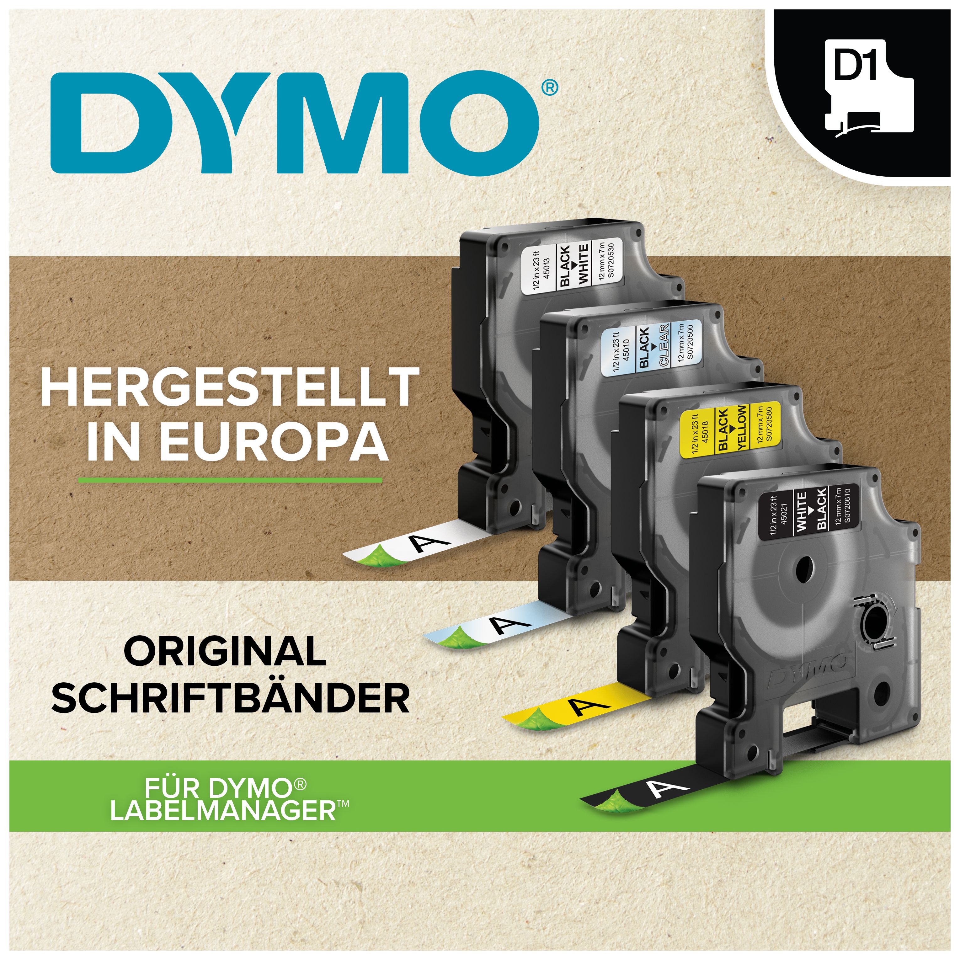 DYMO Original D1 Etikettenband wurden speziell für LabelManager- und LabelWriter Duo-Beschriftungsgeräte entwickelt. Dank der hohen Qualität und der vielseitigen Einsatzmöglichkeiten eignen sie sich für fast alle Etikettierungsarbeiten. Die authentischen DYMO D1-Etiketten haften auf den meisten sauberen, ebenen Flächen, darunter Plastik, Papier, Metall, Holz und Glas, und lassen sich dank der leicht ablösbaren Rückseite einfach anbringen. Das D1-Etikettenkassetten ist strapazierfähig und vielseitig einsetzbar – für eine mühelose Anwendung zu Hause oder im Büro.