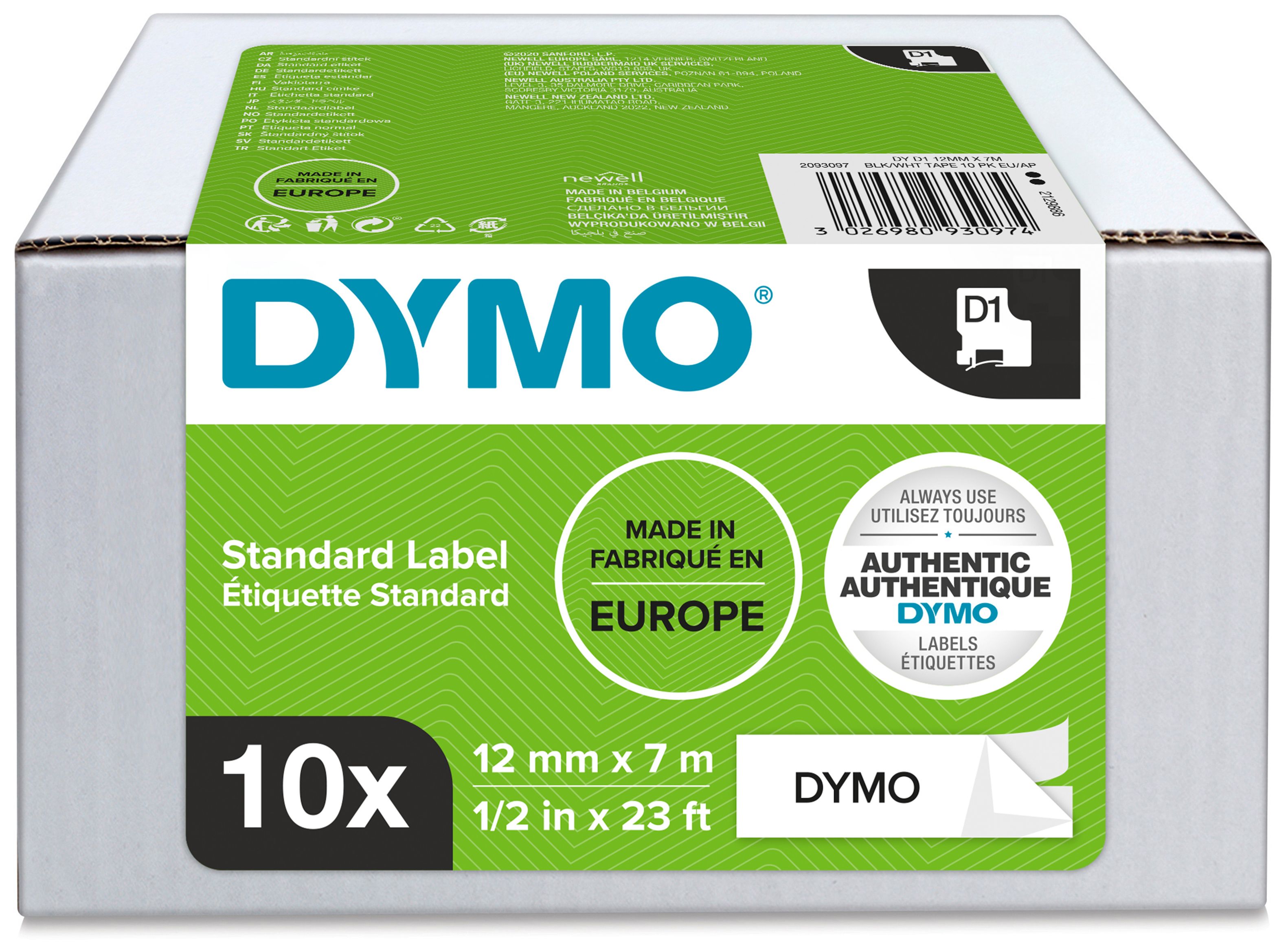 DYMO Original D1-Etikettenband | schwarz auf weiß | 12 mm x 7 m | selbstklebendes Schriftband | für LabelManager-Beschriftungsgerät | 10 Etikettenkassetten (Schwarz)
