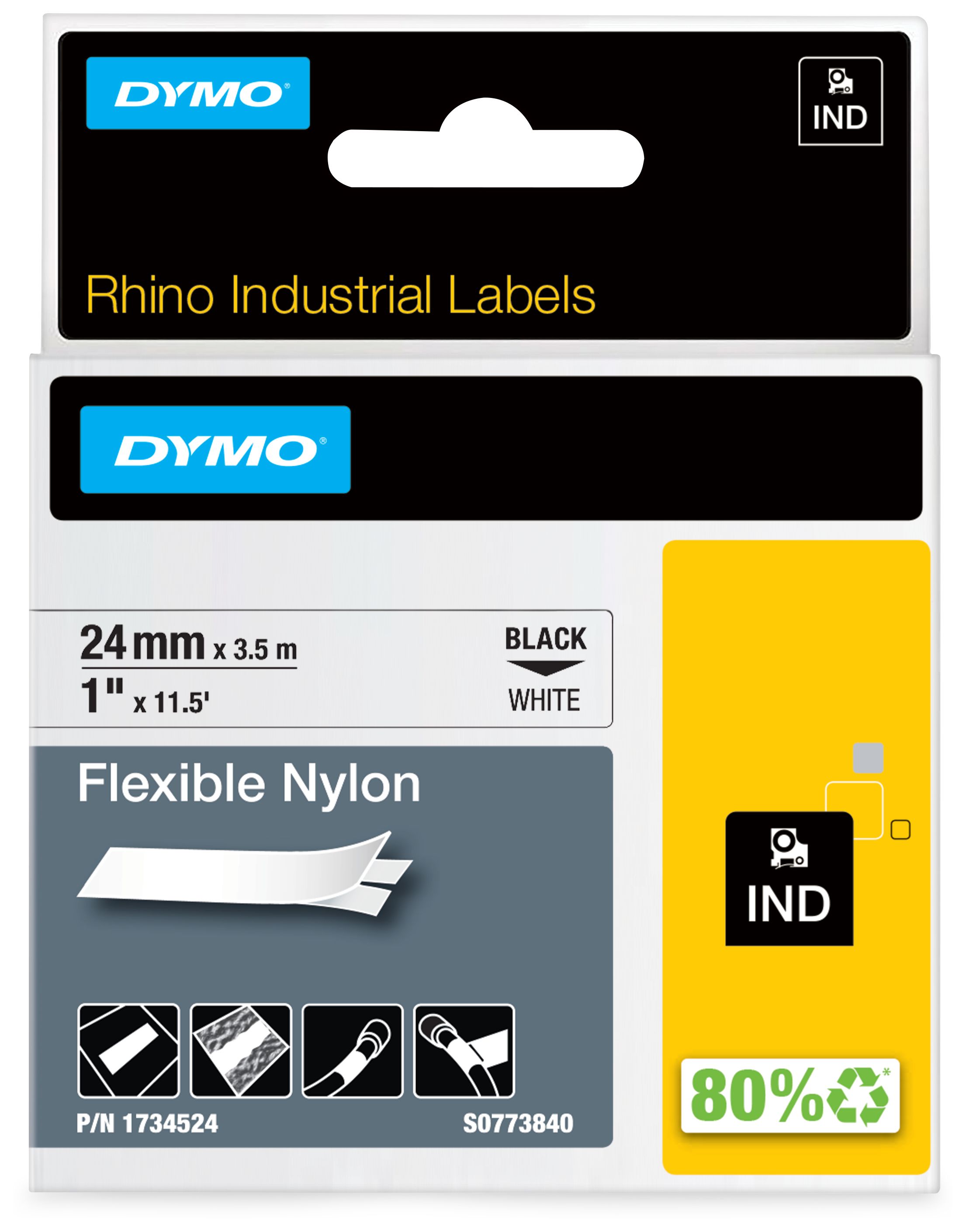 DYMO Rhino Industrie Nylonetiketten | flexibel | 24 mm x 3,5 m | schwarze Schrift auf weißem Untergrund | selbstklebendes Schriftband