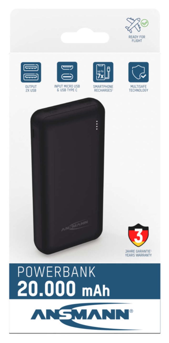 Die Medien warnen immer wieder vor Billig-Produkten, welche ohne jede Vorwarnung explodieren oder beginnen zu brennen. Mit ANSMANN gehen Sie auf Nummer sicher. Der eingebaute Überladeschutz sorgt dafür, dass die Powerbank nach erfolgreicher Ladung den Ladevorgang automatisch beendet. Der Tiefentladeschutz schaltet die PowerBank ab, sobald die Spannung der PowerBank beim Laden eines angeschlossenen Gerätes unter einen bestimmten Wert sinkt und verhindert somit eine Schädigung des Akkus und des Produktes. Der Kurzschlussschutz rundet die Sicherheitsfunktionen ab und sorgt neben der Abschaltautomatik für maximale Sicherheit.