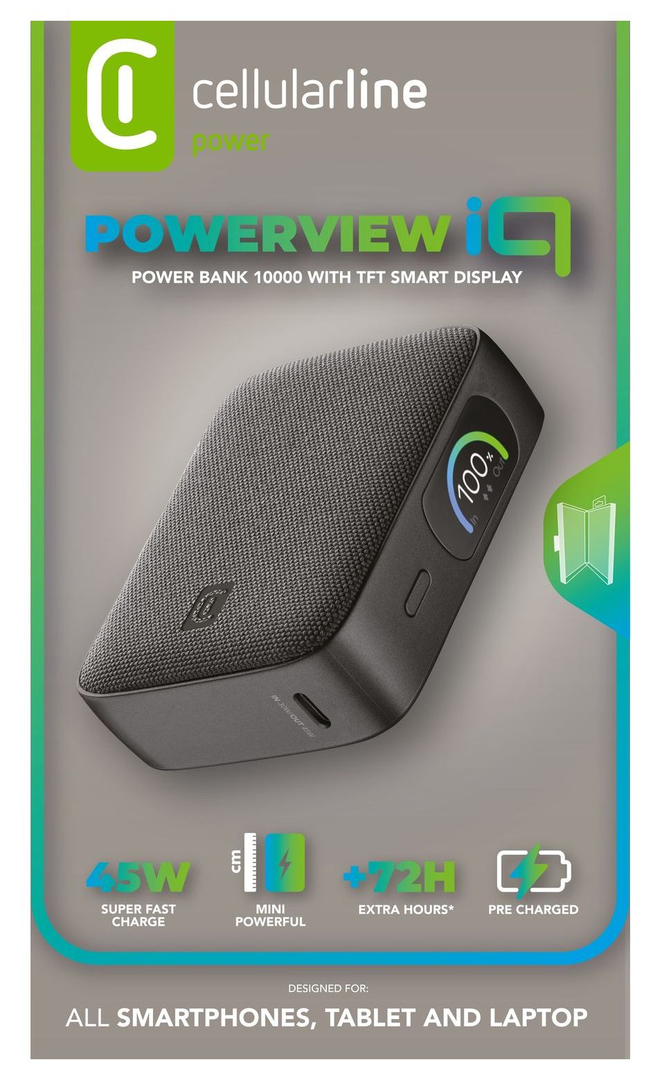 PowerView IQ 10.000 ist die kompakte und leistungsstarke Powerbank für schnelles und vielseitiges Aufladen. Mit 10.000 mAh Kapazität bietet sie bis zu 72 zusätzliche Lade-Stunden. Das intelligente TFT-Display zeigt die Eingangs-/Ausgangsleistung und den Akkustand in Echtzeit. Mit USB-C-Anschluss (30W Input / 45W Output) und USB-A-Port (18W Output) können zwei Geräte gleichzeitig geladen werden. Die elegante Stoffoberfläche verleiht ihr einen modernen Premium-Look.