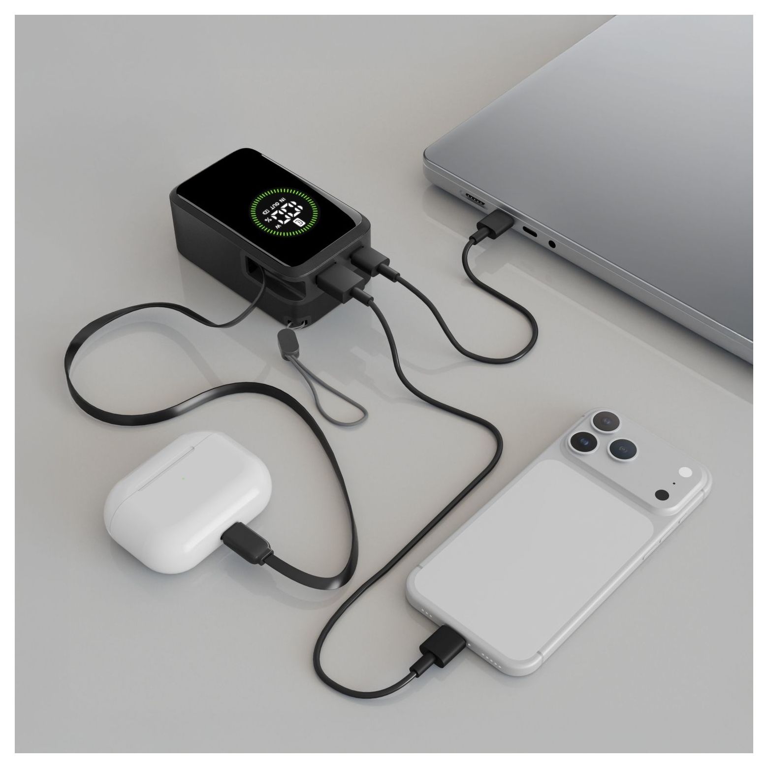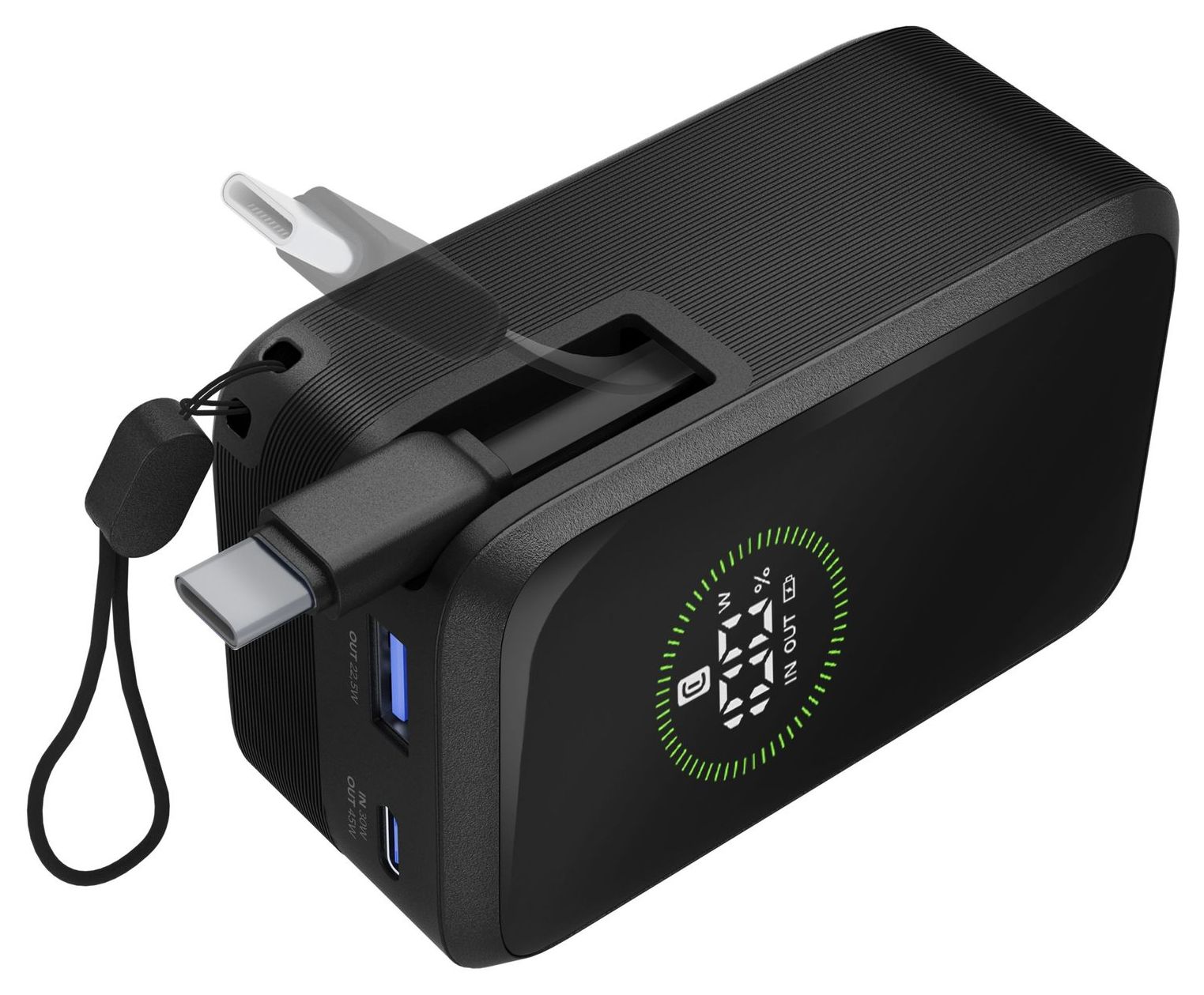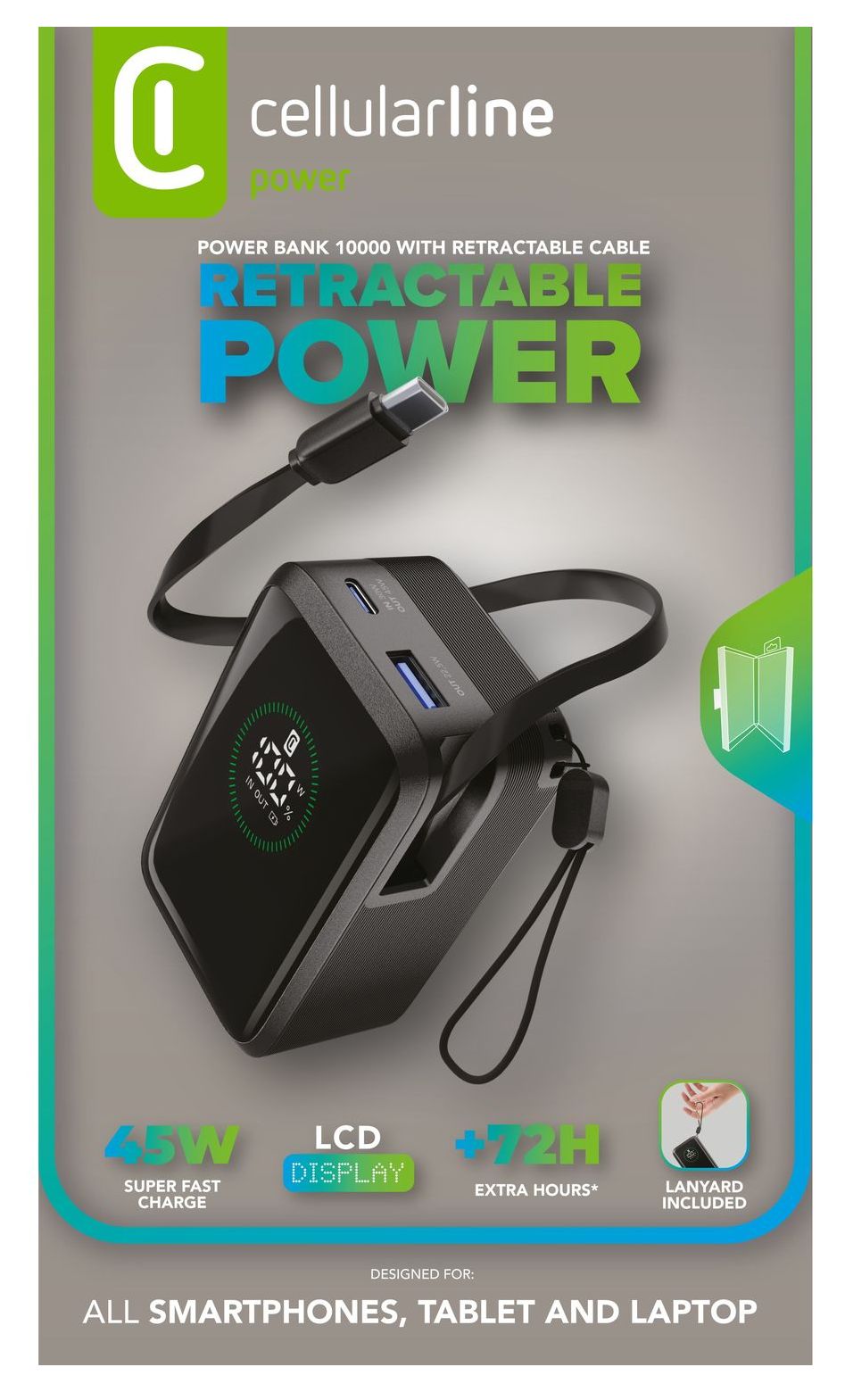 Power Bank Roller 10.000 ist die ideale Lösung für alle, die Leistung und Praktik in einem Gerät suchen. Mit einer Kapazität von 10.000 mAh und bis zu 45W Ausgang liefert sie bis zu 72 Stunden zusätzliche Ladung. Ausgestattet mit einem integrierten, einklappbaren USB‑C‑Kabel, einem USB‑C‑Anschluss (30W Eingang / 45W Ausgang) und einem USB‑A‑Anschluss bis 22,5W ermöglicht sie das gleichzeitige Laden von drei Geräten. Das integrierte LCD‑Display ermöglicht die Echtzeitkontrolle des Ladezustands und der Leistung. Kompakt und tragbar ist sie perfekt für Smartphones, Tablets und Laptops. Der mitgelieferte Tragegriff erleichtert den Transport überallhin.