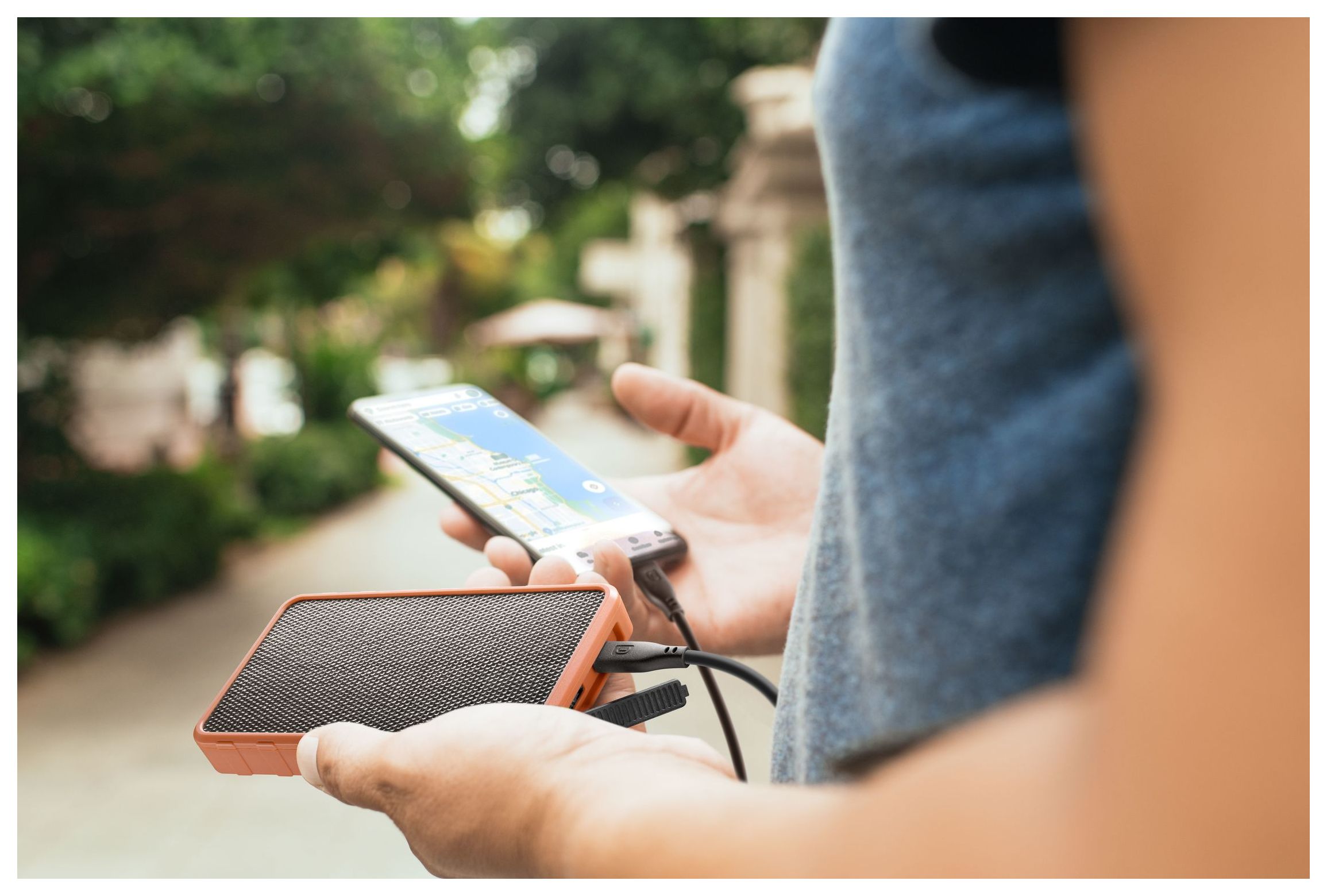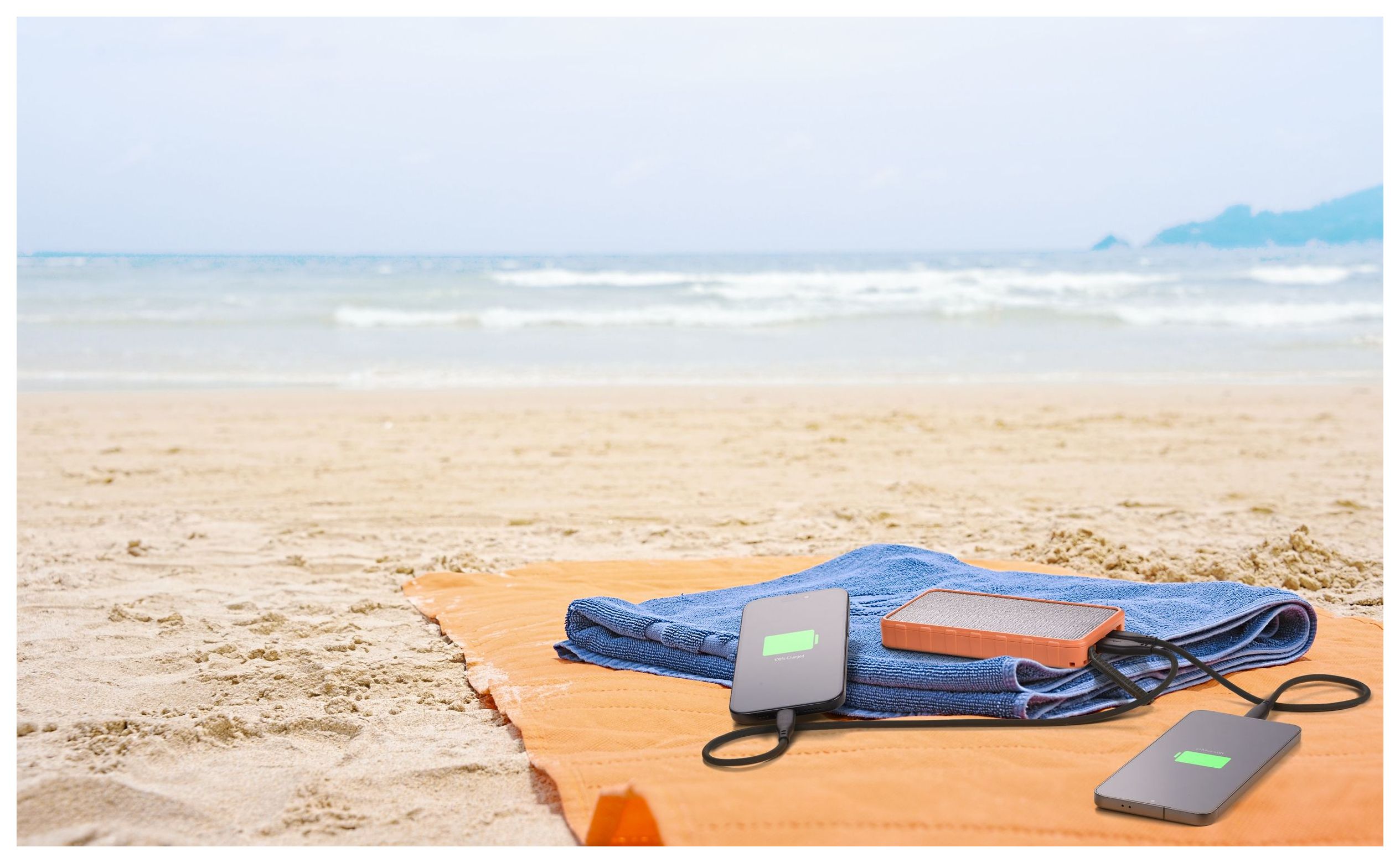 10000mAh Tragbares Ladegerät, ausgestattet mit einem ETFE-Technologie-Solarpanel, das eine um 20% schnellere Absorptionsrate von Solarenergie garantiert, hervorragende Widerstandsfähigkeit gegen Wasser, Staub und hohe Temperaturen sowie eine längere Lebensdauer. Dieses Panel ermöglicht das Aufladen des Powerbanks durch direktes Sonnenlicht sowie das Laden mit Standardkabel. Es ermöglicht das gleichzeitige Laden von zwei Geräten dank des USB-C Power Delivery 20W-Anschlusses und des USB 18W QC-Anschlusses.