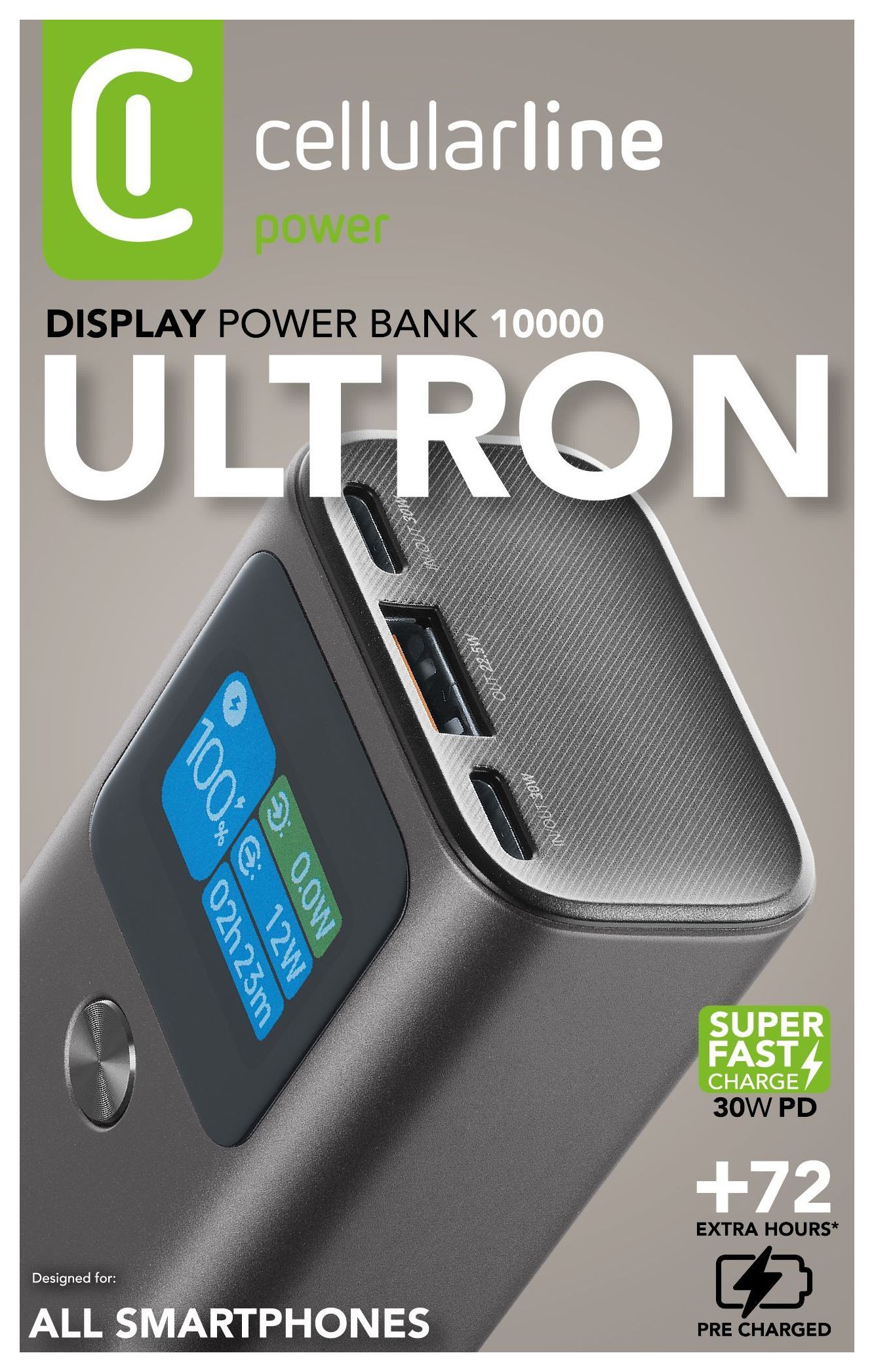 ULTRON 10000 ist die erste multifunktionale Powerbank von Cellularline. Sie ist mit zwei USB-C-Anschlüssen ausgestattet, die jeweils 30W PD liefern, und einem USB-Anschluss, der 22.5W liefert. Kompatibel mit jedem Gerät, liefert sie bis zu 30W Leistung und garantiert 72 zusätzliche Lade-Stunden. Sie verfügt über ein LCD-Display, das neben der Anzeige des Ladeeingangs/-ausgangs in Echtzeit, des Prozentsatzes und der verbleibenden Batteriestunden auch mehrere andere Funktionen der Powerbank anzeigt, wie Wecker, Stoppuhr, Countdown und Thermometer. Kompakt und leicht tragbar, ist ULTRON 10000 der perfekte Begleiter für deine Ladebedürfnisse unterwegs.
