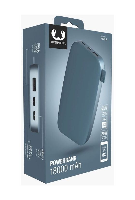 Fresh 'n Rebel 2PB18100DV. Akku-/Batteriekapazität: 18000 mAh. USB-Typ-A-Ausgangsports: 1, USB Typ-C Anzahl Anschlüsse: 2. Produktfarbe: Blau