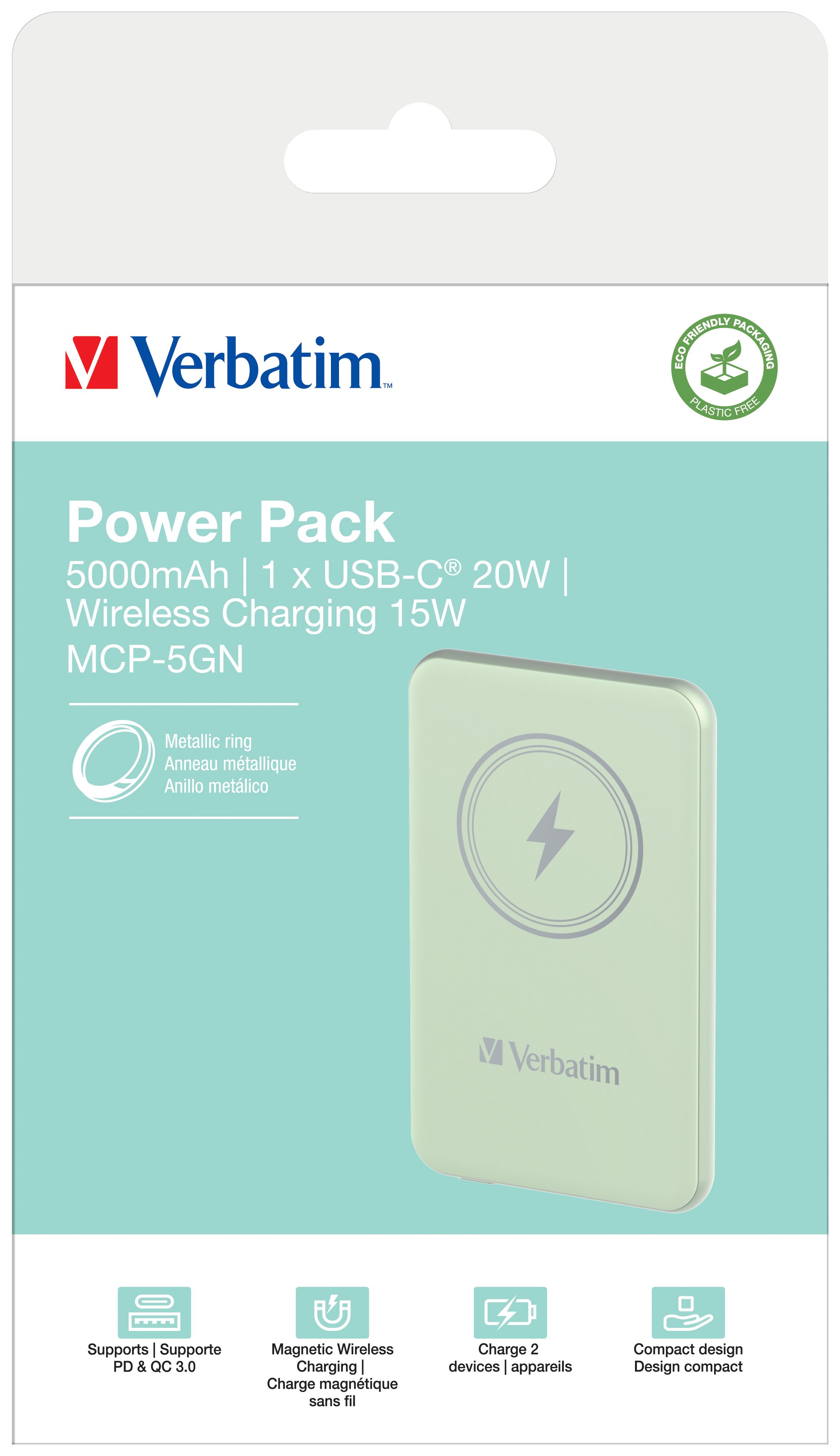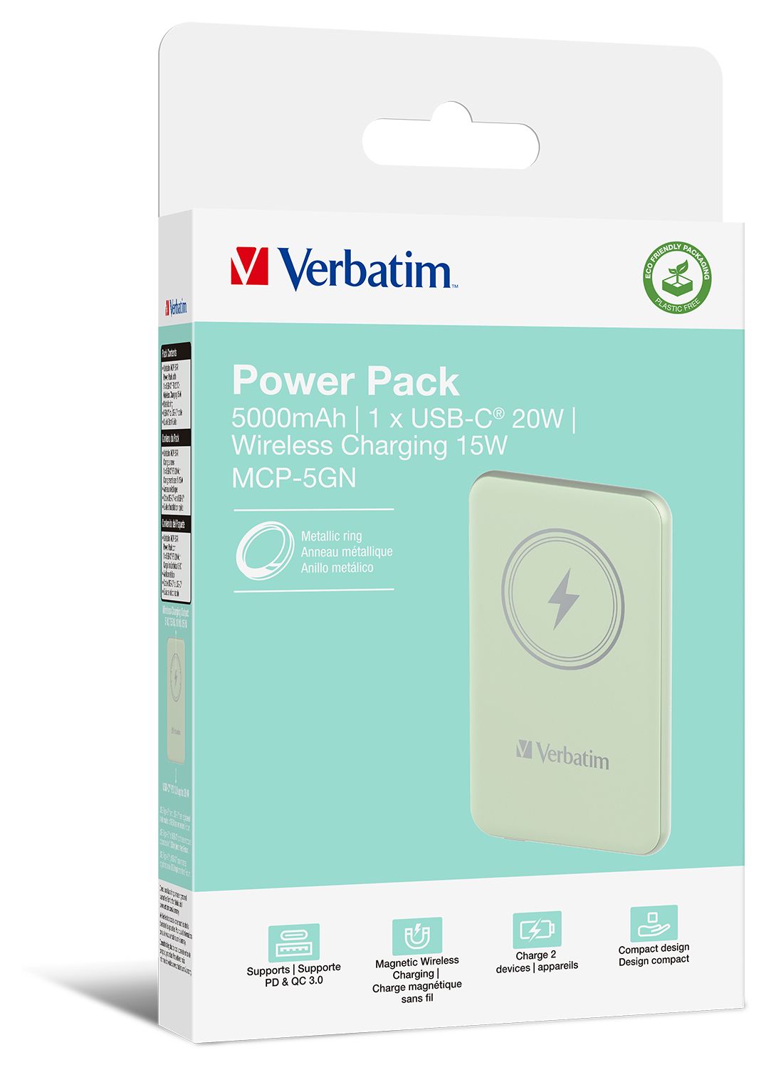 Verbatim Charge 'n' Go. Akku-/Batteriekapazität: 5000 mAh, Akku-/Batterietechnologie: Lithium Polymer (LiPo), Schnellladetechnik: Quick Charge 3.0, Kabelloses Aufladen. Produktfarbe: Grün
