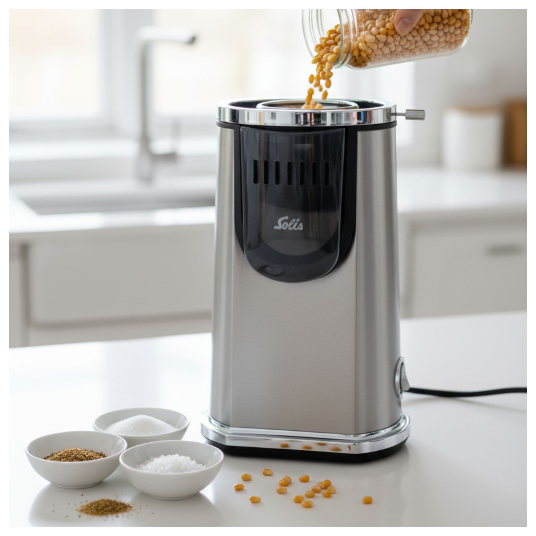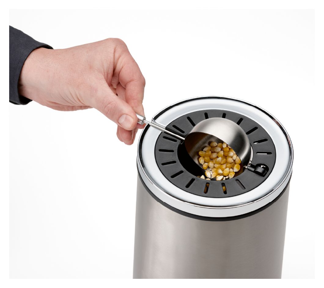 Maiskörner einfüllen, den Messbecher drehen, den Schalter betätigen – und schon geht’s los.