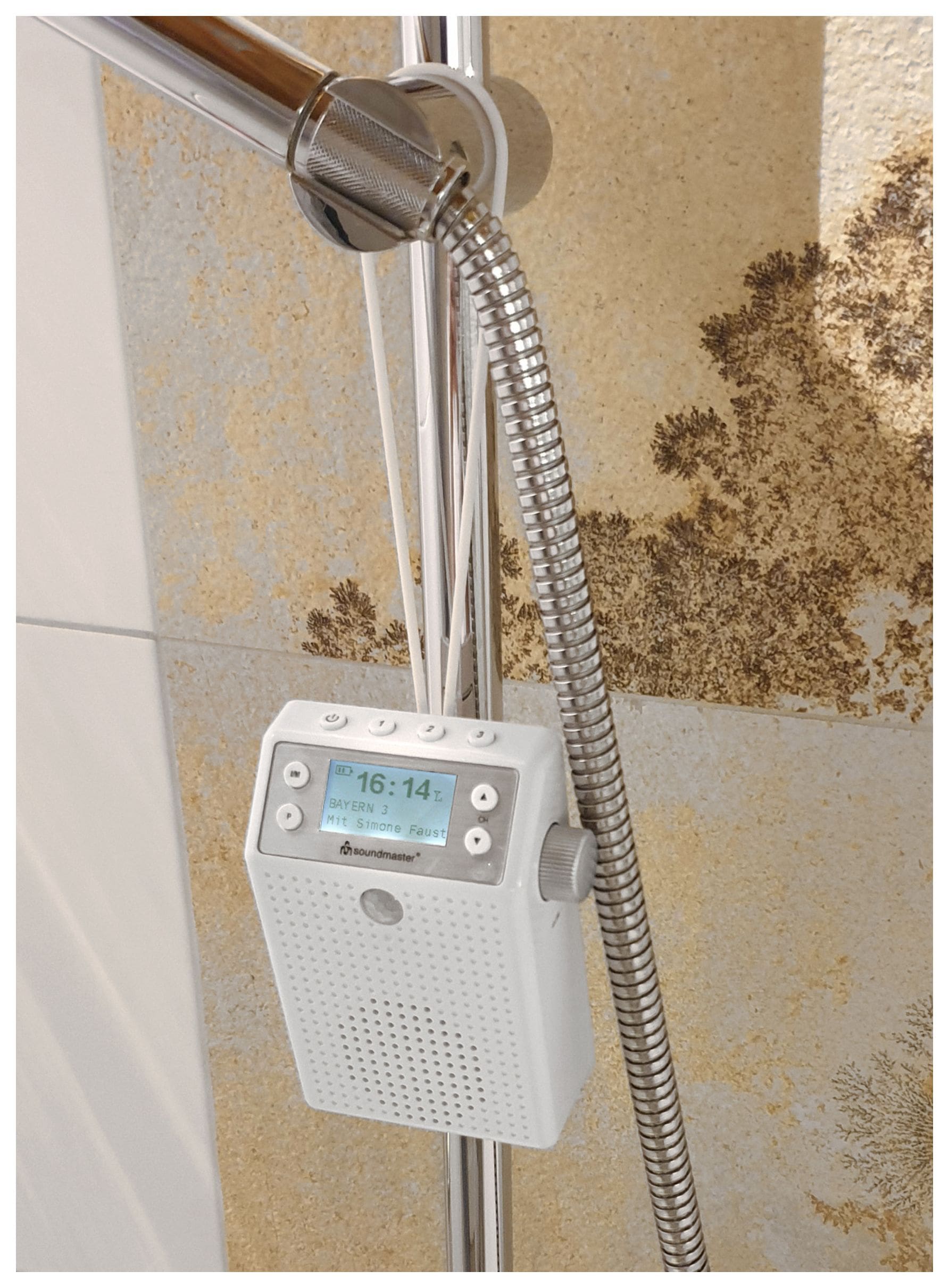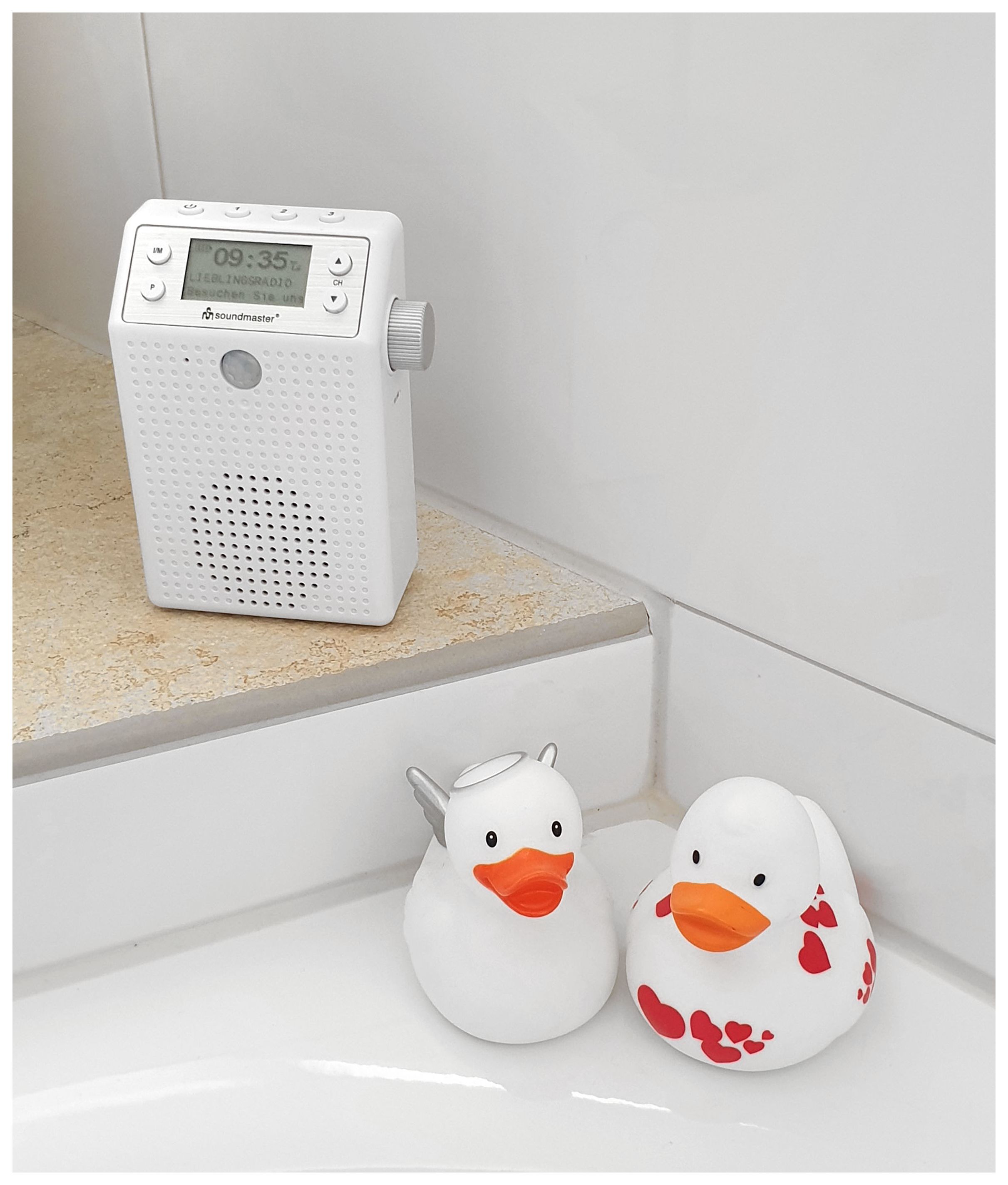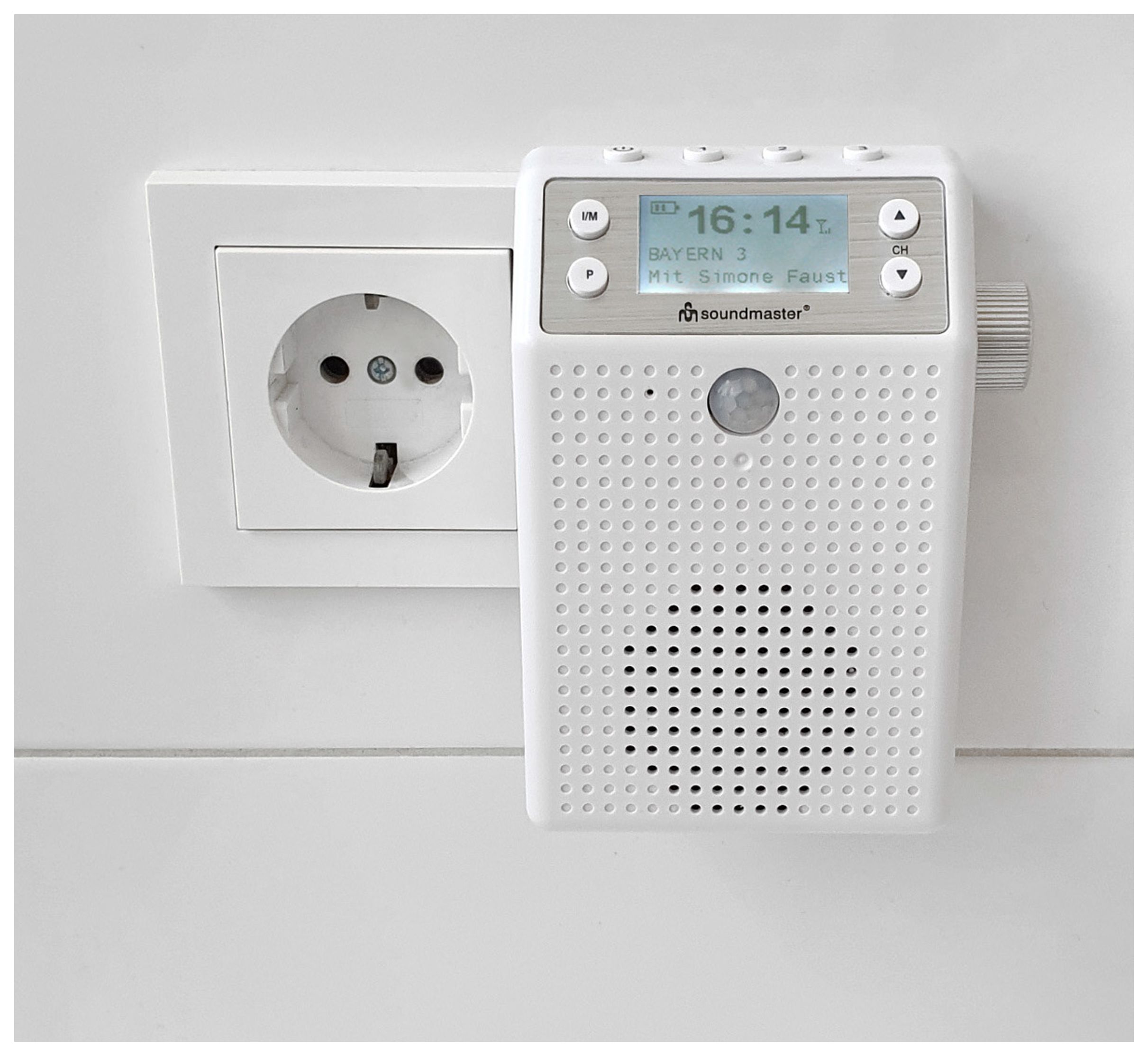 Soundmaster DAB60WE. Radiotyp: Tragbar, Tunertyp: Digital, Unterstützte Bänder: DAB+, FM. RMS-Leistung: 3 W. Farbe der Hintergrundbeleuchtung: Blau. Produktfarbe: Weiß, Lautstärkeregler: Drehregler, Schutzfunktion: Spritzwassergeschützt. Akku-/Batterietechnologie: Lithium-Ion (Li-Ion), Akku-/Batteriekapazität: 1200 mAh, Akku-/Batterietyp: Integrierte Batterie