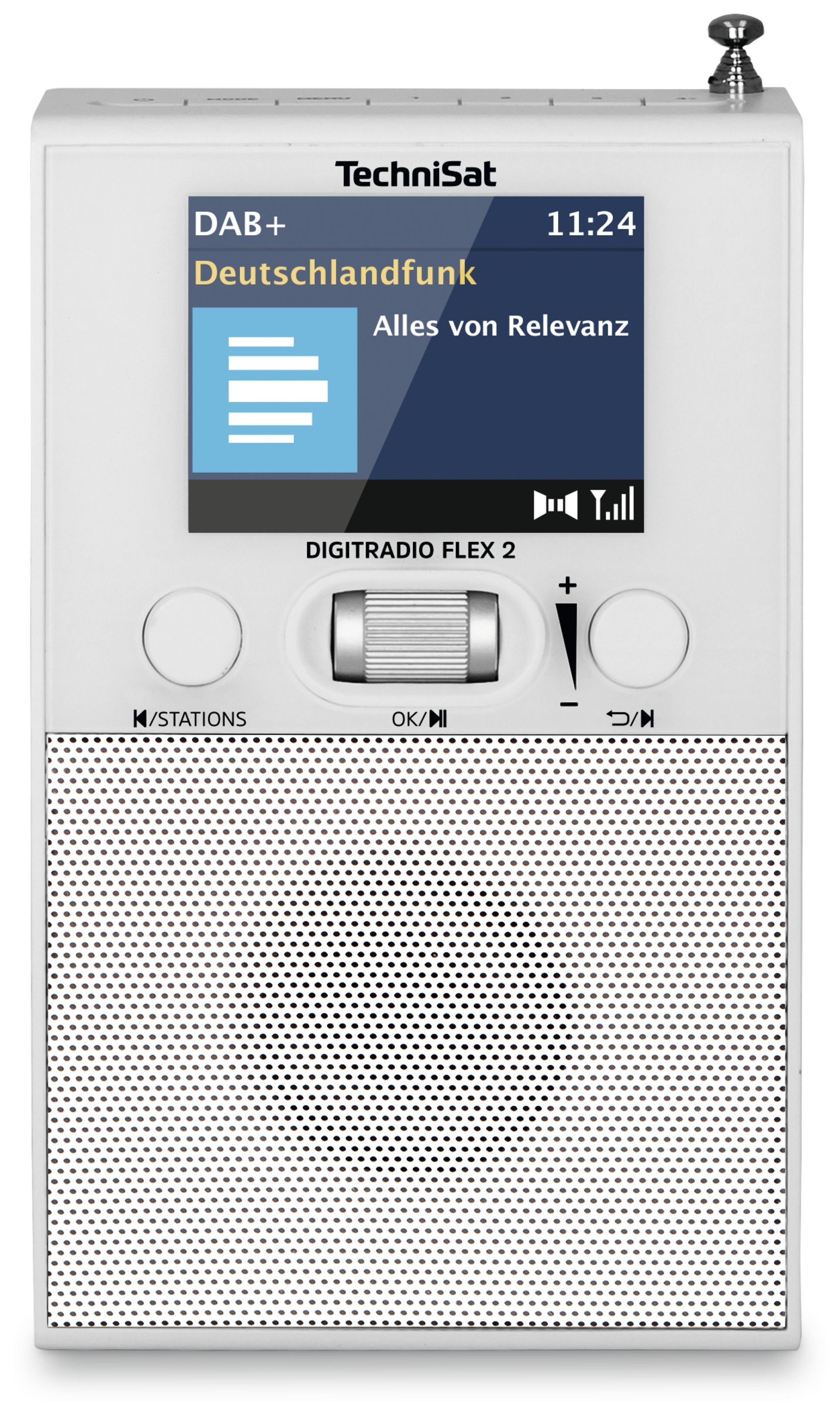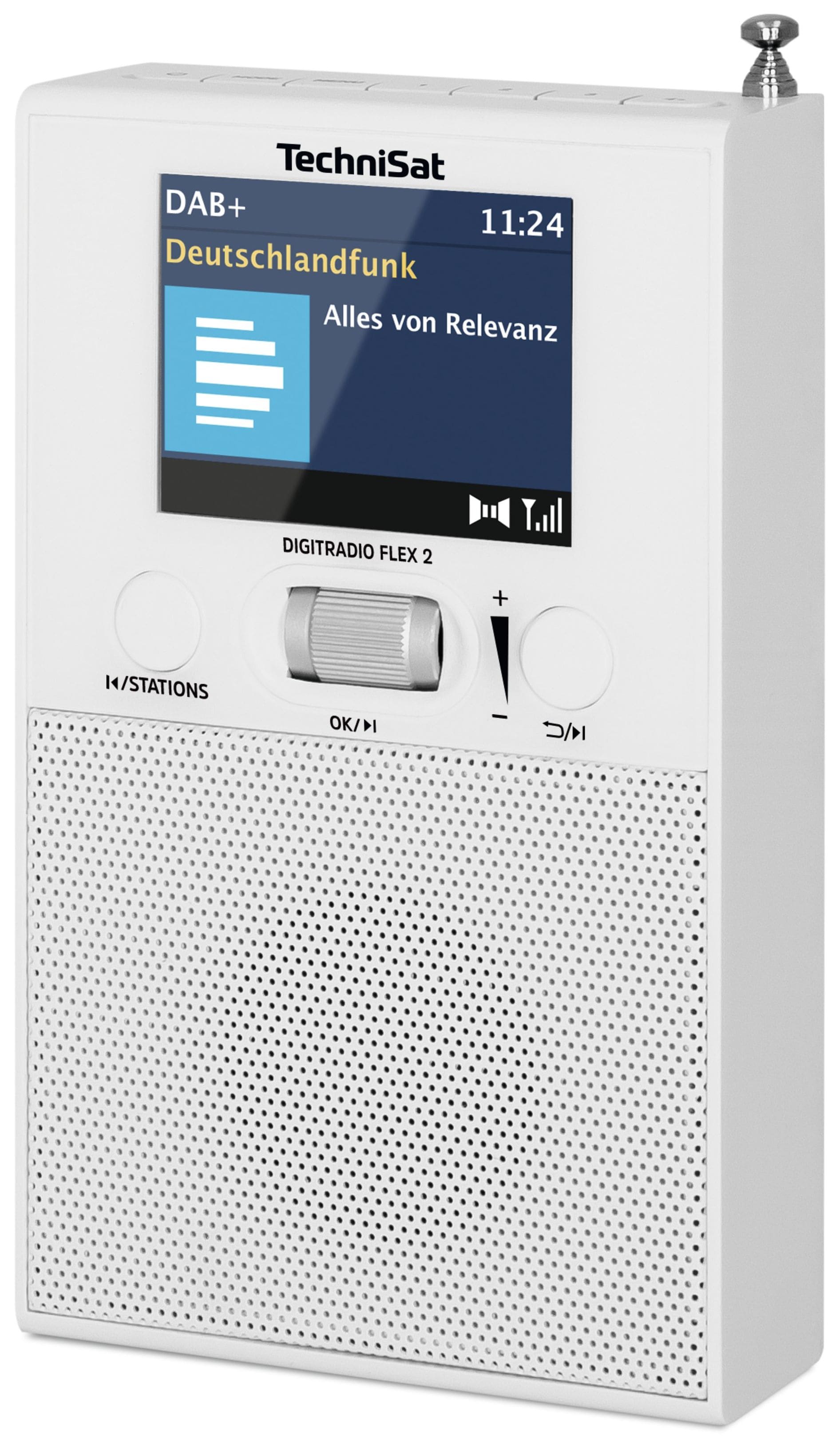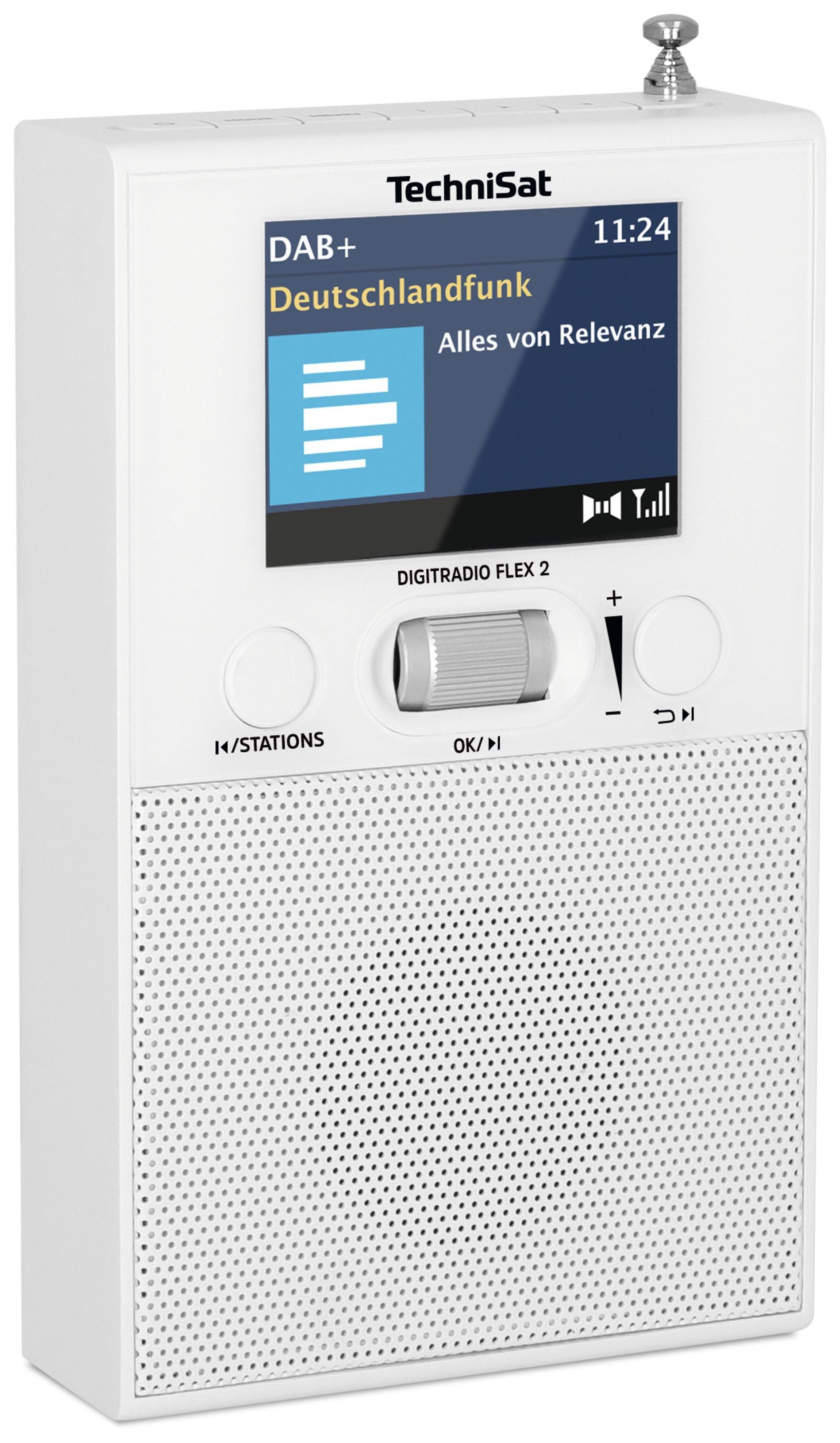 TechniSat DigitRadio Flex 2. Radiotyp: Tragbar, Tunertyp: Digital, Unterstützte Bänder: DAB+, FM. RMS-Leistung: 1,5 W. Bildschirmdiagonale: 6,1 cm (2.4"). Produktfarbe: Weiß, Menüsprachen: Dänisch, Deutsch, Niederländisch, Englisch, Spanisch, Französisch, Italienisch. AC Eingangsspannung: 230 V, AC Eingangsfrequenz: 50 Hz
