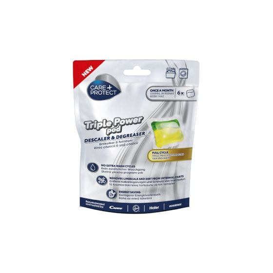 Dank der CARE + PROTECT Triple Power Pods können Sie die Leistung Ihrer Wasch- und Spülmaschinen jetzt mühelos erhalten und ihre Lebensdauer verlängern, ohne zu warten!