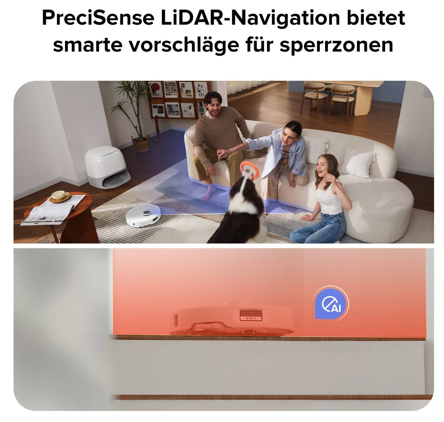 LiDAR-basierte Navigation erstellt detaillierte und präzise Karten in Echtzeit, um eine optimale Route für die Reinigung deines Zuhauses zu finden.