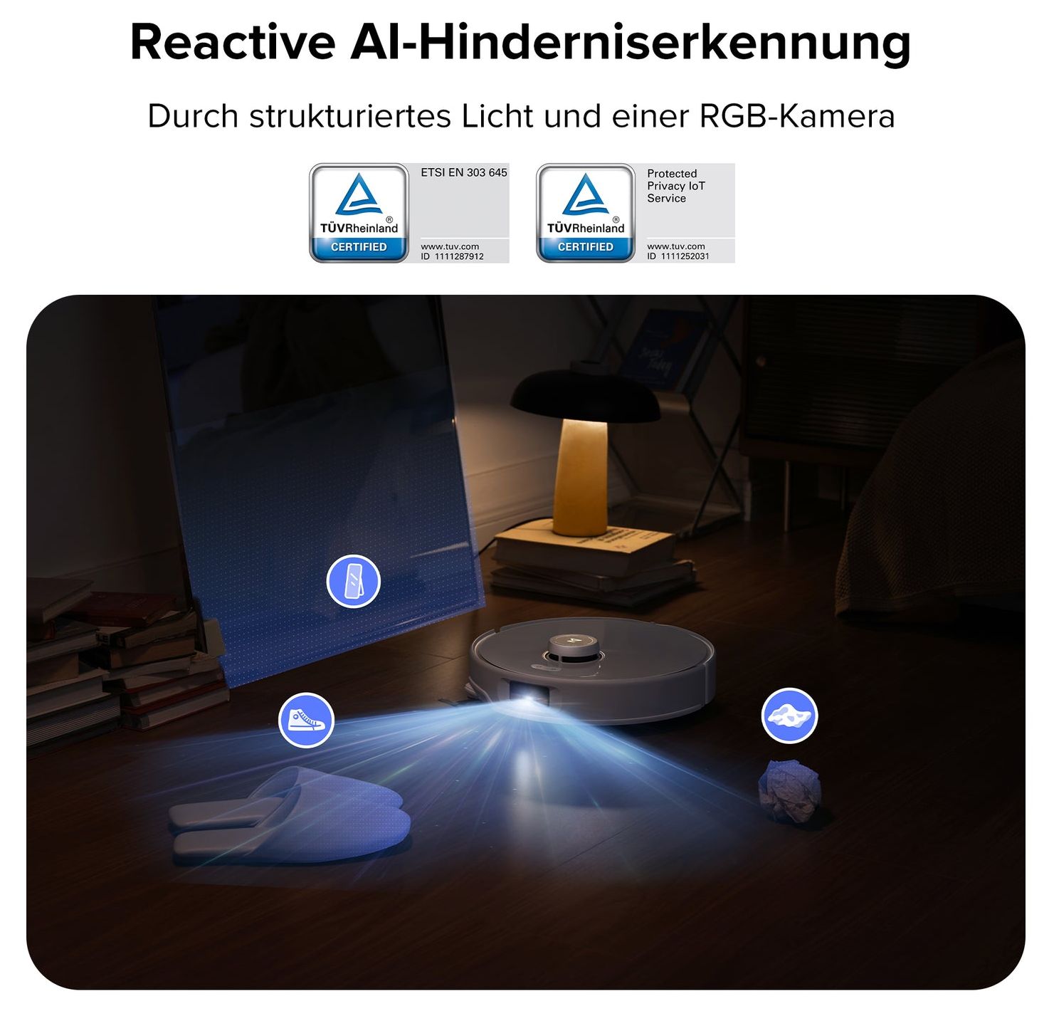 Durch strukturiertes Licht und einer RGB-Kamera identifiziert und vermeidet der Roboter 62 Objekttypen in 20 Kategorien. Er navigiert gleichermaßen in hellen und dunklen Umgebungen geschmeidig um Hindernisse herum und verringert die Notwendigkeit manueller Eingriffe.