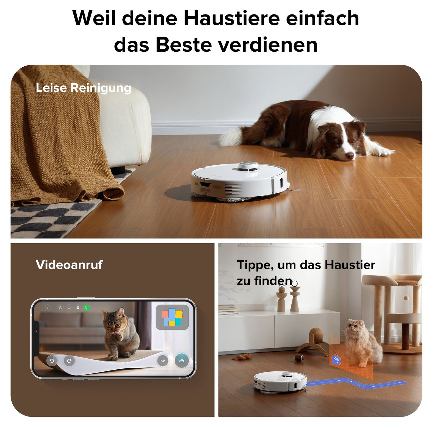 Der Roboter kann automatisch nach Haustieren suchen und findet sie auch in ihren Verstecken. Du kannst auch Aufenthaltsort und Status deiner Tiere überprüfen, wenn du nicht zuhause bist.