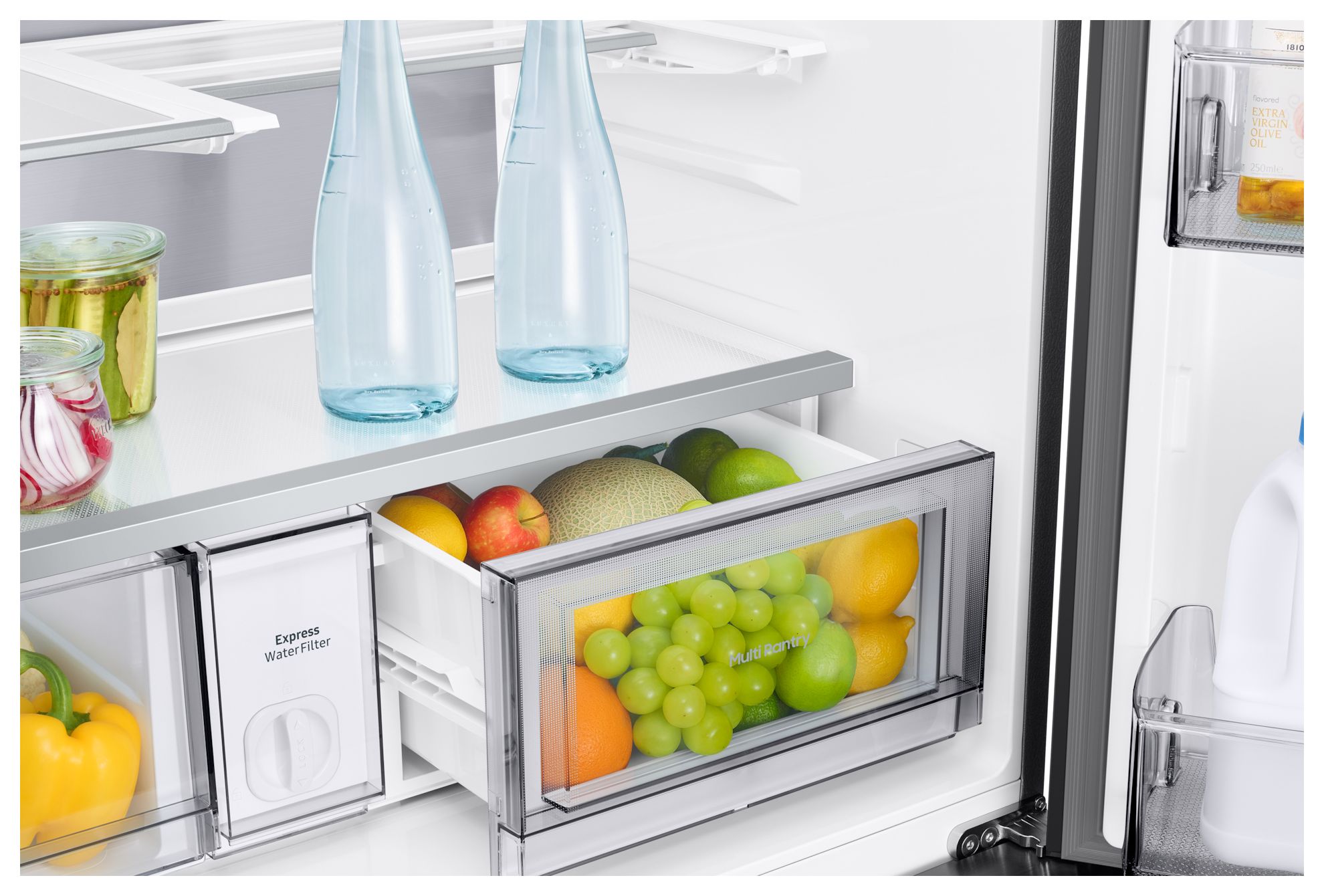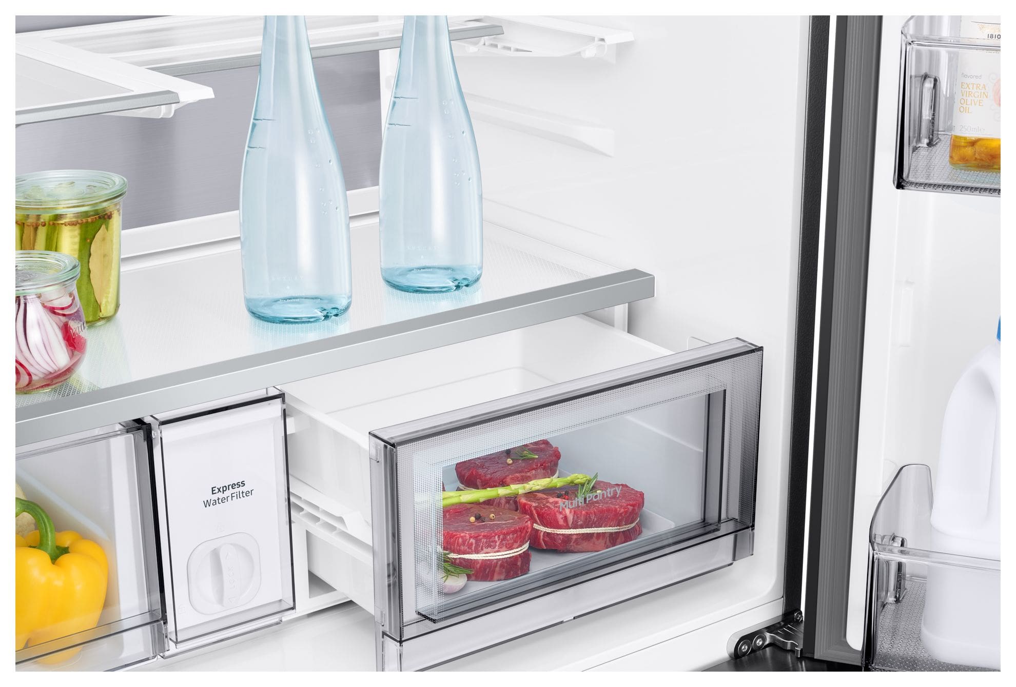 Die Multi-Pantry Schublade schafft eine angepasste Temperatur zur Lagerung unterschiedlicher Lebensmittel und ist über das Außen-Display einstellbar. Bei Einstellung "Fruits & Veggie" kannst du Obst und Gemüse mit der gleichen Temperatur wie im Kühlteil eingestellt aufbewahren. Mit der Einstellung "Beverage" wird die Temperatur auf ca. 1°C passend für kalte Getränke eingestellt und "Meat & Fish" (ca. -1°C) ist ideal für Fleisch, Fisch und frische Meeresfrüchte.