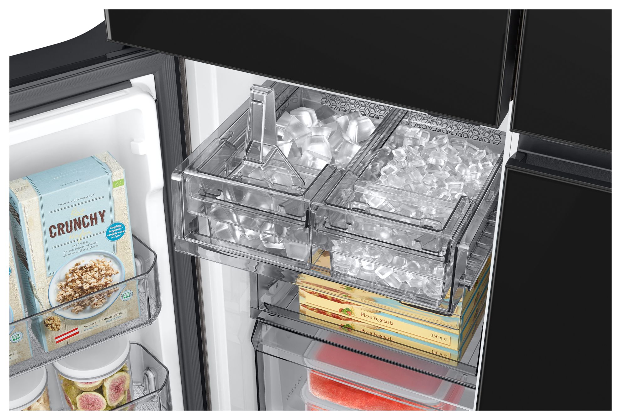 Zwei verschiedene Eiswürfeltypen für unterschiedliche Gelegenheiten. Der Dual Auto Ice Maker produziert zwei Arten von Eis: Ice Bites und Eiswürfel für unterschiedliche Arten von Getränken. Er produziert 1,6kg Eis[15] pro Tag und speichert 1,9kg Eis[15] für ausreichende Vorräte.