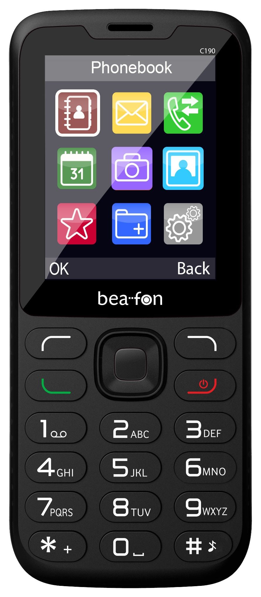 Beafon C190 LTE. Formfaktor: Balken. SIM-Kartensteckplätze: Dual-SIM. Bildschirmdiagonale: 6,2 cm (2.44"), Display-Auflösung: 240 x 320 Pixel. Bluetooth. FM-Radio. Akku-/Batterietechnologie: Lithium-Ion (Li-Ion), Akku-/Batteriekapazität: 1000 mAh, Standby-Zeit (2G): 180 h. Gewicht: 67 g. Produktfarbe: Schwarz