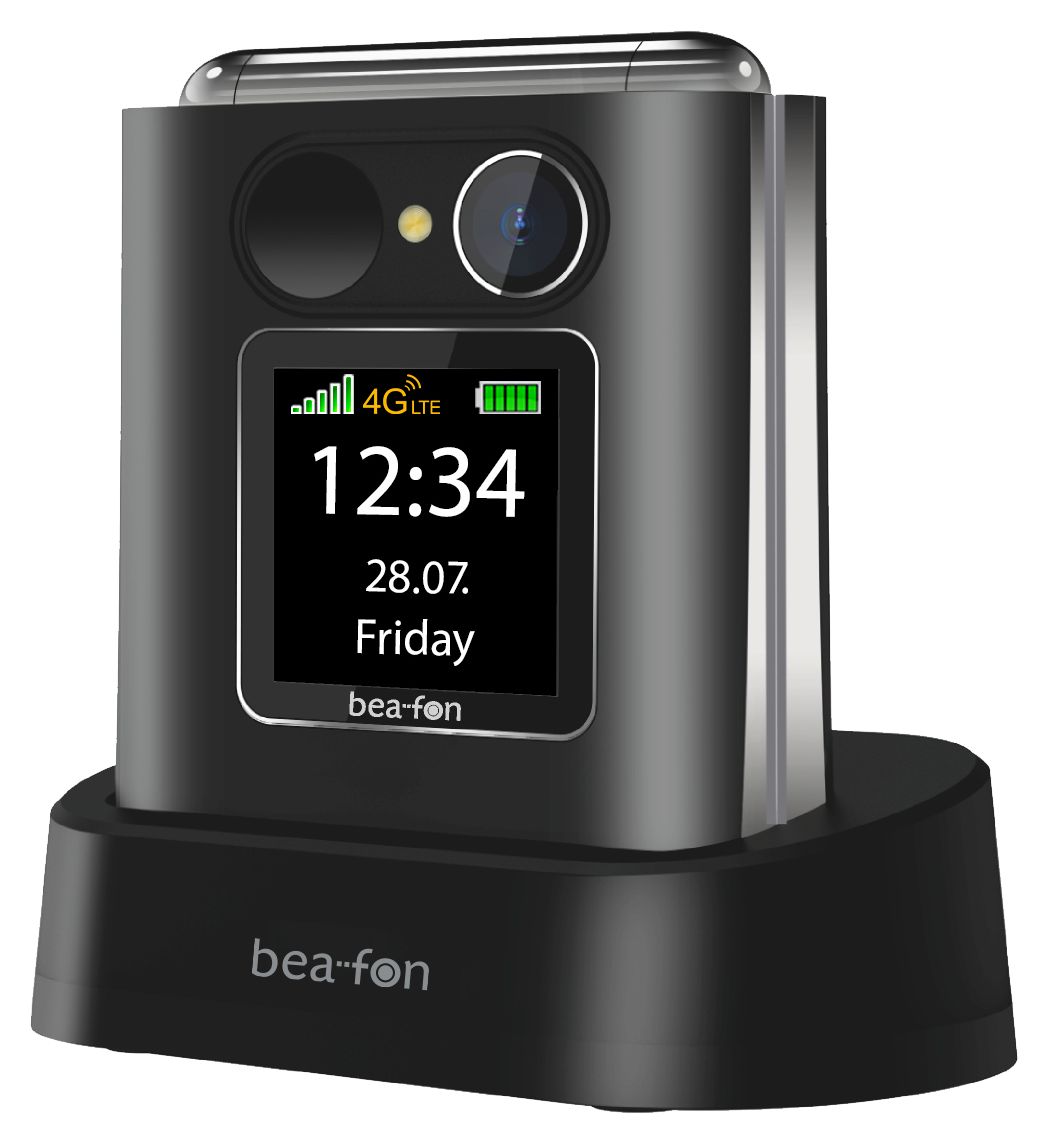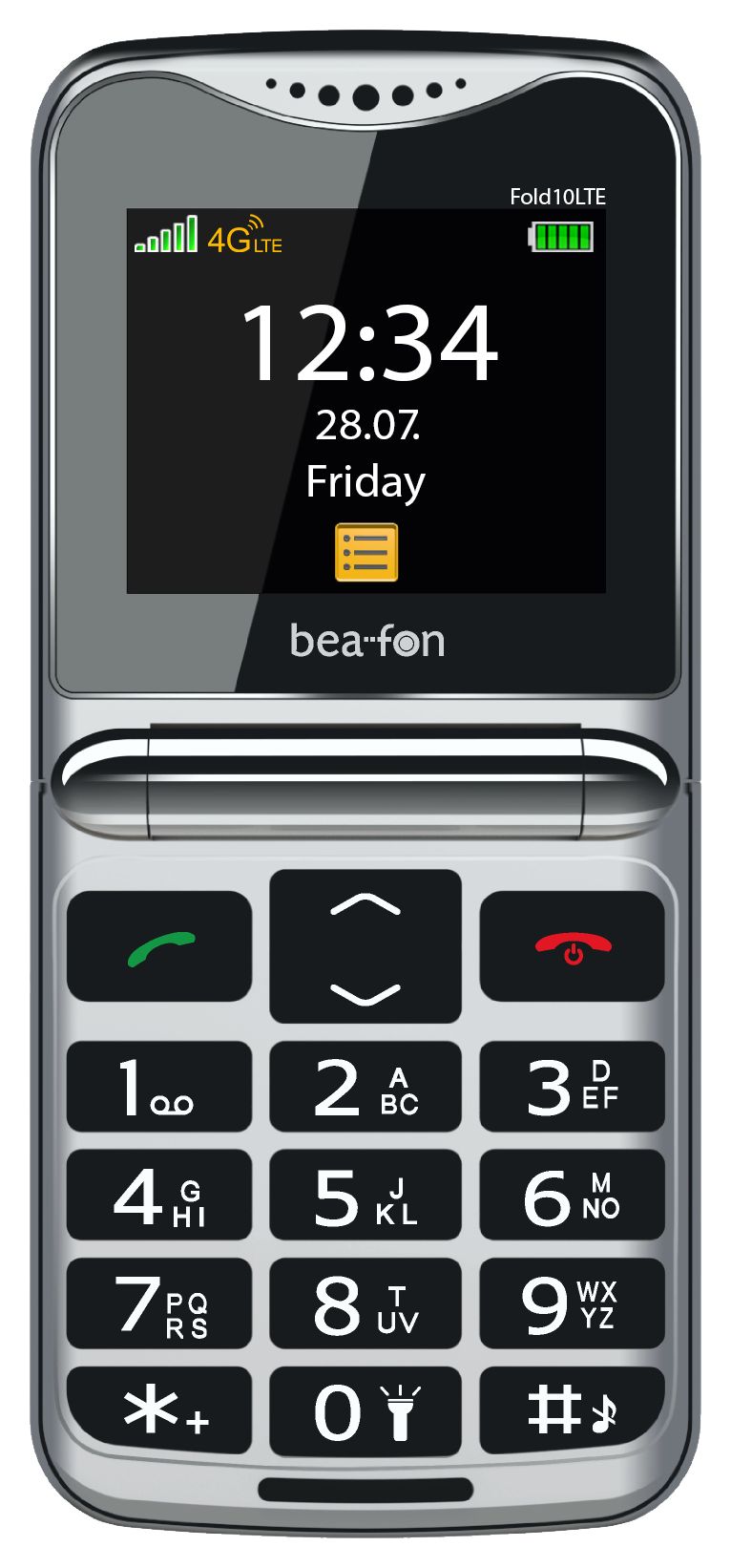 Beafon Fold 10 LTE. Formfaktor: Klappgehäuse. SIM-Kartensteckplätze: Single SIM. Bildschirmdiagonale: 5,59 cm (2.2"), Display-Auflösung: 177 x 220 Pixel, Externe Anzeige: TFT. Bluetooth. FM-Radio. Akku-/Batterietechnologie: Lithium-Ion (Li-Ion), Akku-/Batteriekapazität: 1350 mAh, Standby-Zeit (2G): 250 h. Gewicht: 95 g. Produktfarbe: Schwarz, Silber
