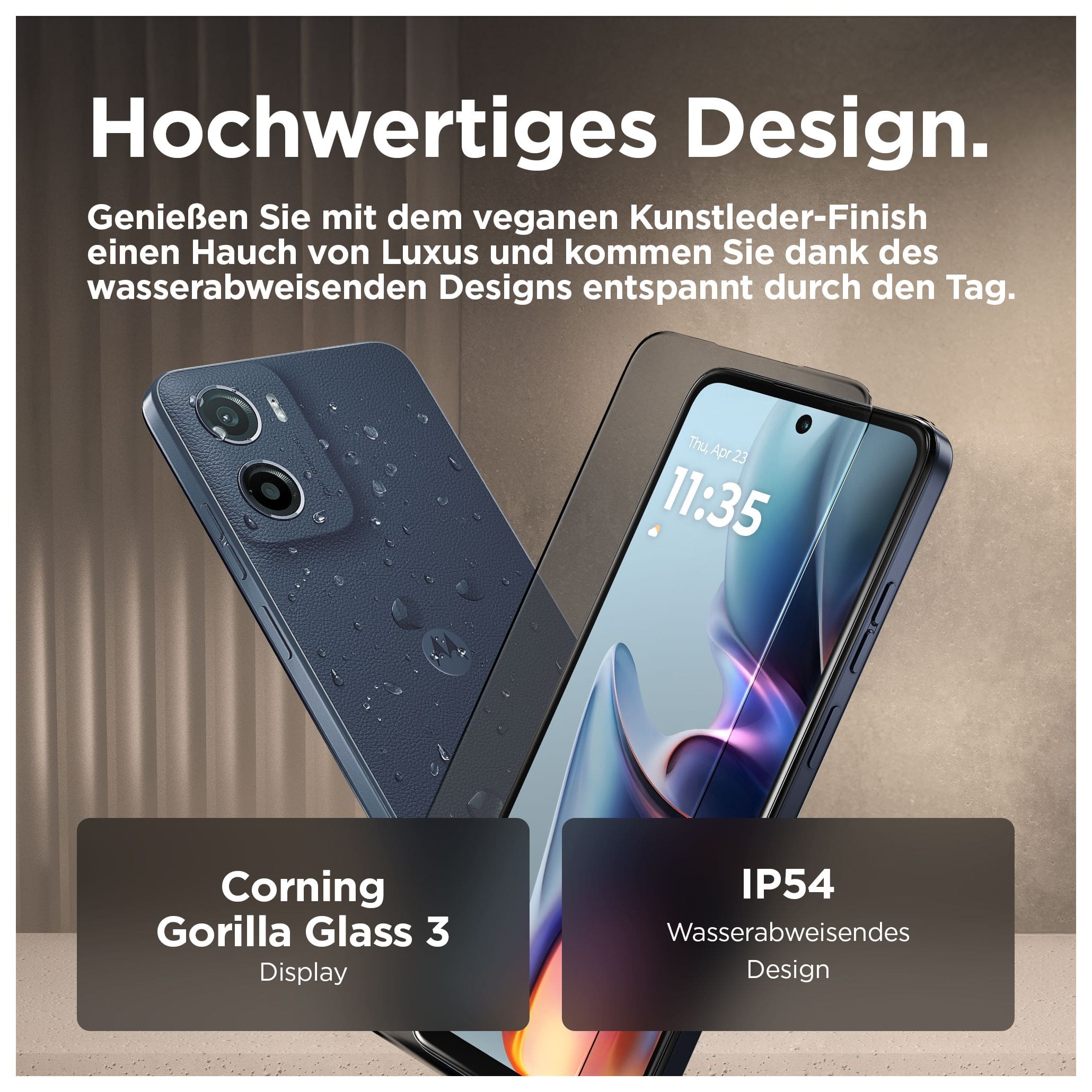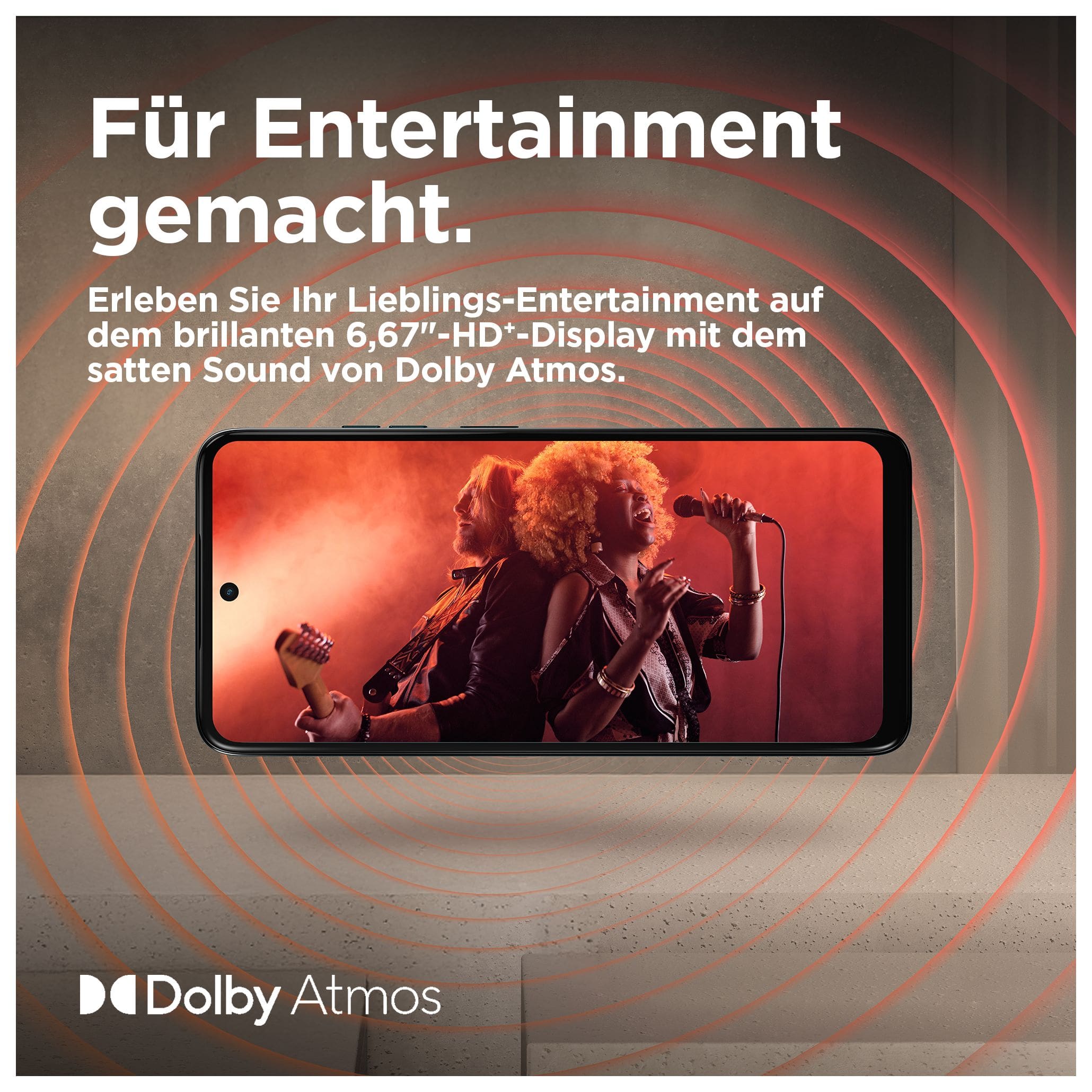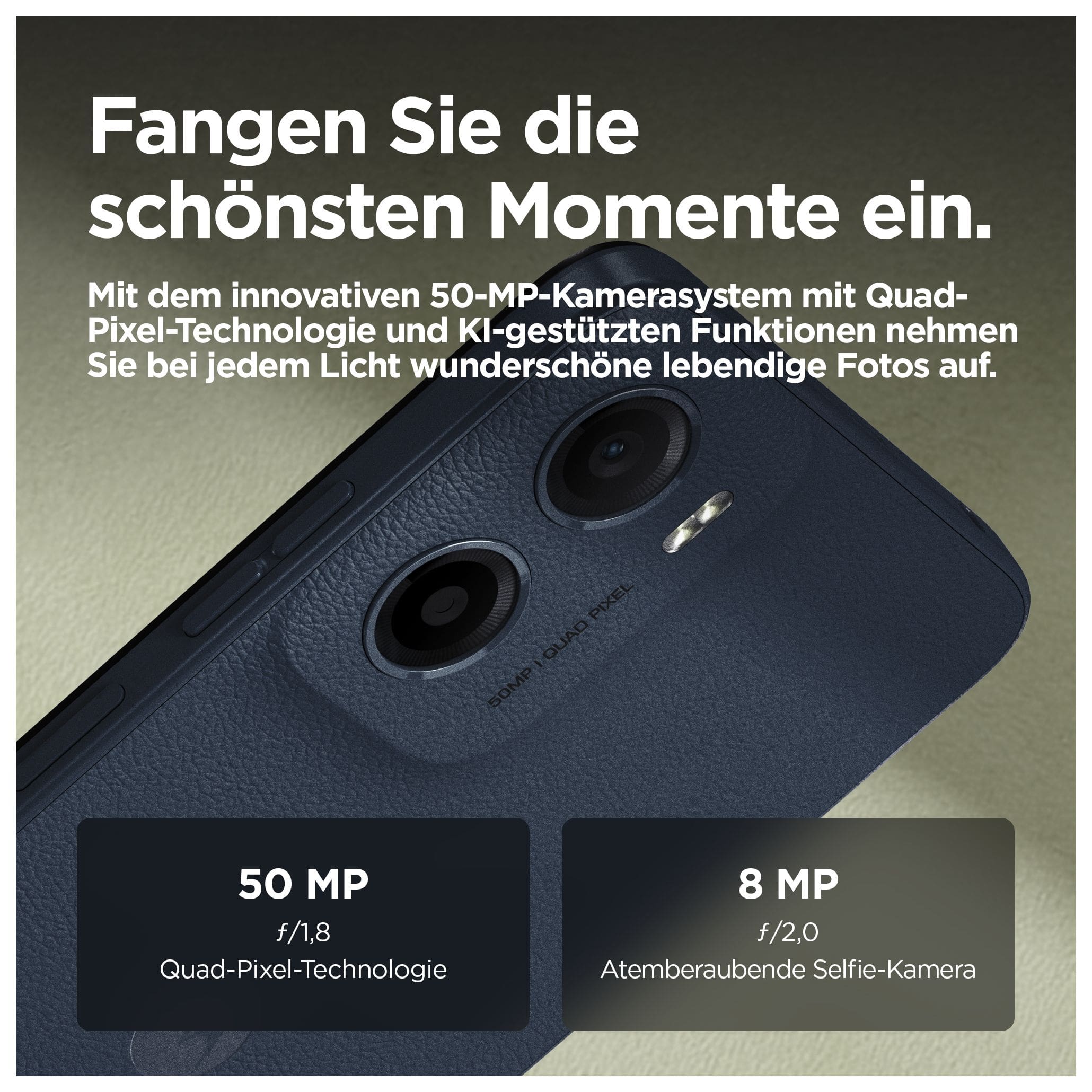 Erlebe eine ausgezeichnete Bild- und Tonqualität mit dem neuen moto g05. Schau deine Lieblingsserien und -filme auf dem gestochen scharfen und brillanten 6,67" Display – selbst bei Sonnenschein. Genieße Rundum-Sound dank Stereo-Lautsprechern mit Bass-Boost. Nimm mit dem 50-MP-Quad-Pixel-Kamerasystem(2) mit KI-gestützter Porträt-Funktion bei Tag und Nacht wunderschöne, gestochen scharfe Fotos auf. Und freu dich auf noch mehr Speed, ultraeffiziente Performance und bis zu 12 GB RAM mit RAM-Boost(5). Mit seinem Finish aus veganem Kunstleder, dem wasserabweisenden Design(4) und Corning® Gorilla® Glass 3 bietet das moto g05 Style und Langlebigkeit zugleich. Der 5200-mAh-Akku hält lange durch und dank TurboPower™ ist dein Smartphone blitzschnell wieder aufgeladen. Außerdem bietet es jede Menge Speicherplatz für deinen Content. Das moto g05 – in jeder Hinsicht beeindruckend.