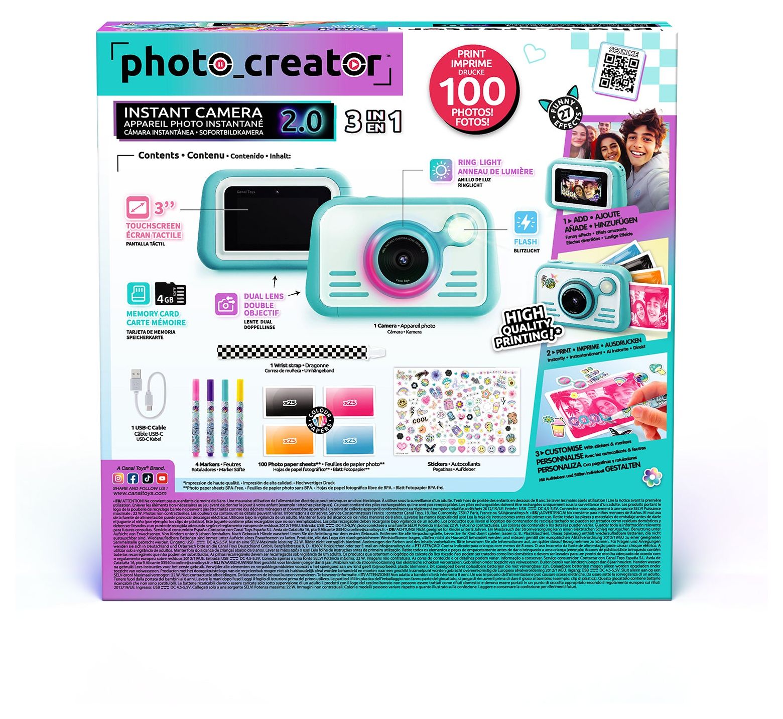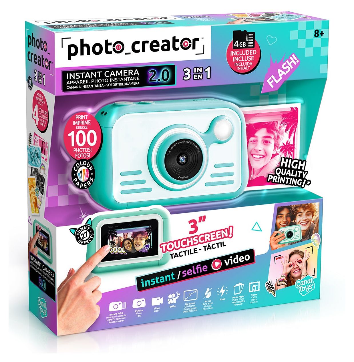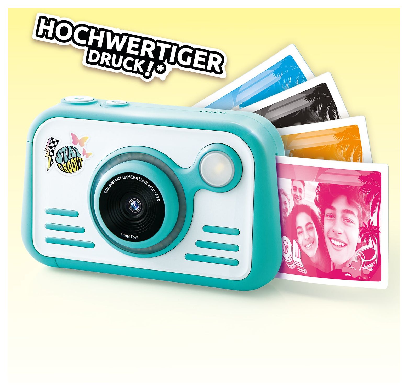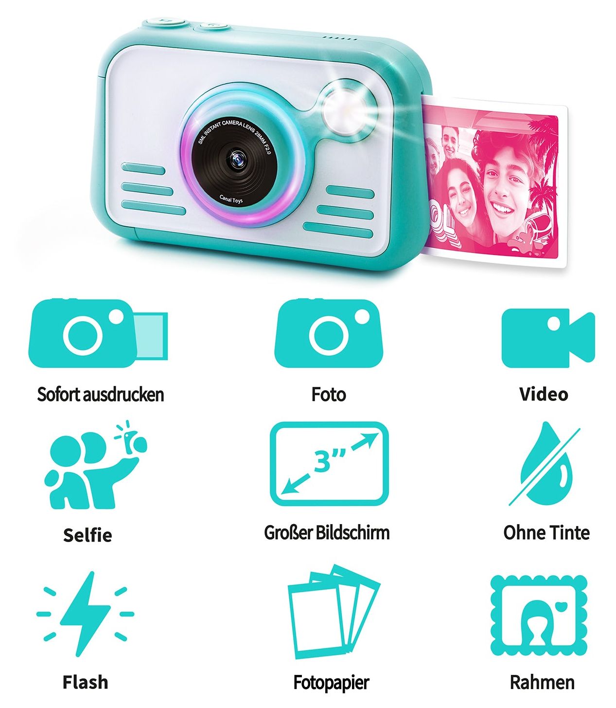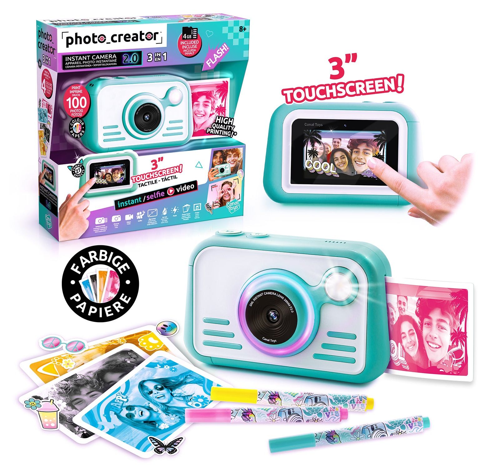 Eine innovative, trendige, hochauflösende High-Quality Digital-Kamera mit einem 8cm HD-Touchscreen, die auf richtigem Fotopapier druckt! Sie benötigt dazu keine Tinte, sondern nutzt praktisches Thermo-Fotopapier. Nimm Fotos, Selfies oder Videos auf und drucke sie sofort auf diesem hochwertigem Hochglanzpapier in 4 verschiedenen Farben aus, nachdem du sie dir in der Galerie alle nochmals angesehen hast! Die Kamera verfügt über ein integriertes Ringlicht, Blitz, Farbfilter, Rahmen und einen 8cm Touchscreen. Sie hat zusätzlich eine Timerfunktion, für Aufnahmen nach 3 oder 10 Sekunden. Gestalte deine ausgedruckten Fotos zusätzlich mit Aufklebern und den speziellen Farbmarker-Stiften! 100 Blatt Fotopapier sind gleich dabei. Ebenso eine 4 GB SD-Speicherkarte. Ideal für fotografie-begeisterte Kinder und Jugendliche und solche, die es werden wollen!