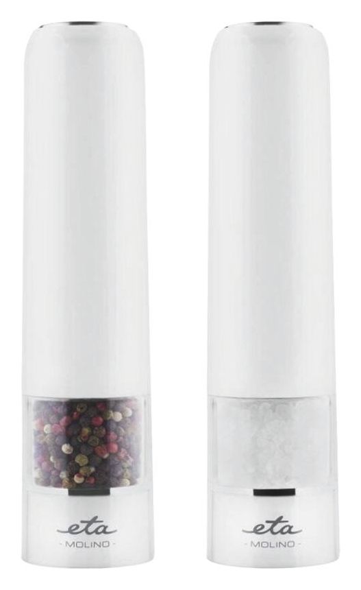 Eta Molino. Produkttyp: Salz- & Pfeffermühle, Produktfarbe: Weiß, Gehäusematerial: Kunststoff. Akku-/Batterietyp: AAA. Breite: 55 mm, Tiefe: 55 mm, Höhe: 210 mm. Verpackungsbreite: 115 mm, Verpackungstiefe: 60 mm, Verpackungshöhe: 225 mm