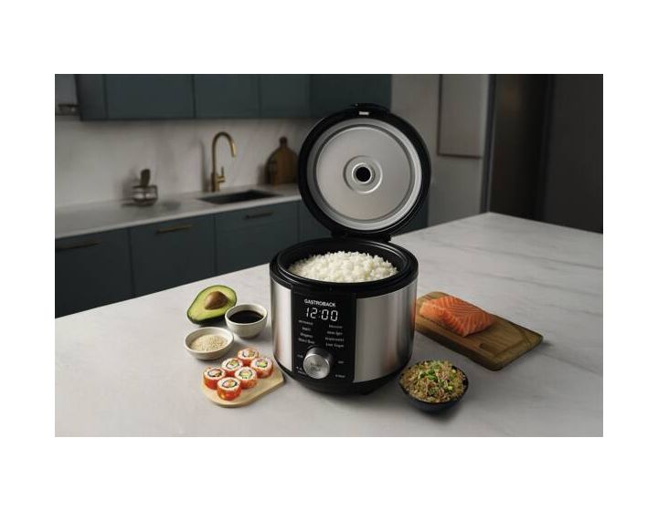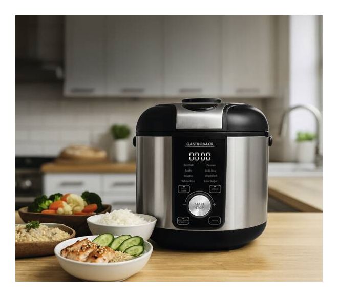 Gastroback Rice Control Low Carb & Steam. Produktfarbe: Schwarz, Edelstahl, Volumen (l): 3 l, Warmhaltefunktion-Zeit: 24 h. Leistung: 450 W, AC Eingangsspannung: 220 - 240 V, AC Eingangsfrequenz: 50 Hz. Breite: 245 mm, Tiefe: 242 mm, Höhe: 255 mm