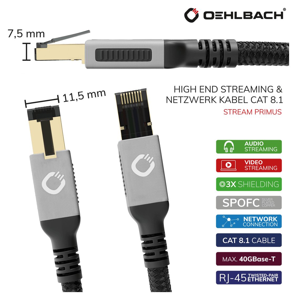 Das State of the Art Netzwerkkabel für höchste Ansprüche beim Gaming, Audio- oder Videostreaming, dem Anschluss von hochwertigen HiFi Netzwerkplayern, NAS-Systemen und vielem mehr. Umhüllt von einem herausragenden, flexiblen Gewebemantel zeigt dieses Oehlbach Cat-8.1-Netzwerkkabel seine Extraklasse. Die setzt sich im Inneren mit Leitern aus versilbertem sauerstofffreiem Kupfer (SPOFC) für audiophilen Genuss nahtlos fort. 3-fach abgeschirmt sind die Twisted-Pair-Leiter optimal vor Nebensignalen und Störungen geschützt. 24 Karat vergoldete Steckkontakte sorgen zusätzlich für 100% Kontaktsicherheit. Dieses Kabel ist bereit für 40-GBit-Ethernet und macht den Weg frei für höchste Ansprüche an Audio- und Video-Streaming sowie maximale Performance im Gamingbereich. RJ-45-Stecker sorgen zuletzt für volle Abwärtskompatibilität zu anderen Komponenten der Kategorien Cat 6, 6A und 5.