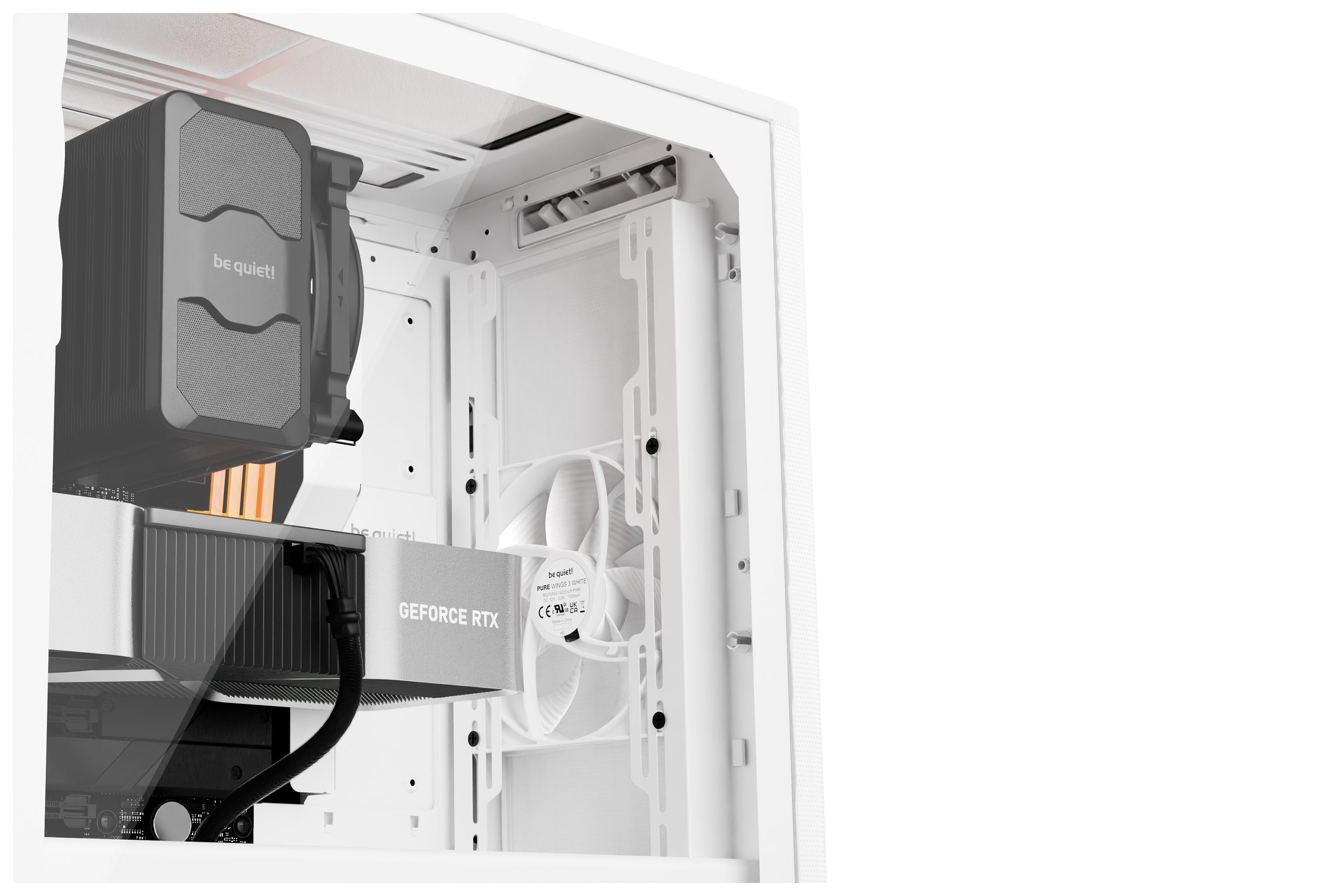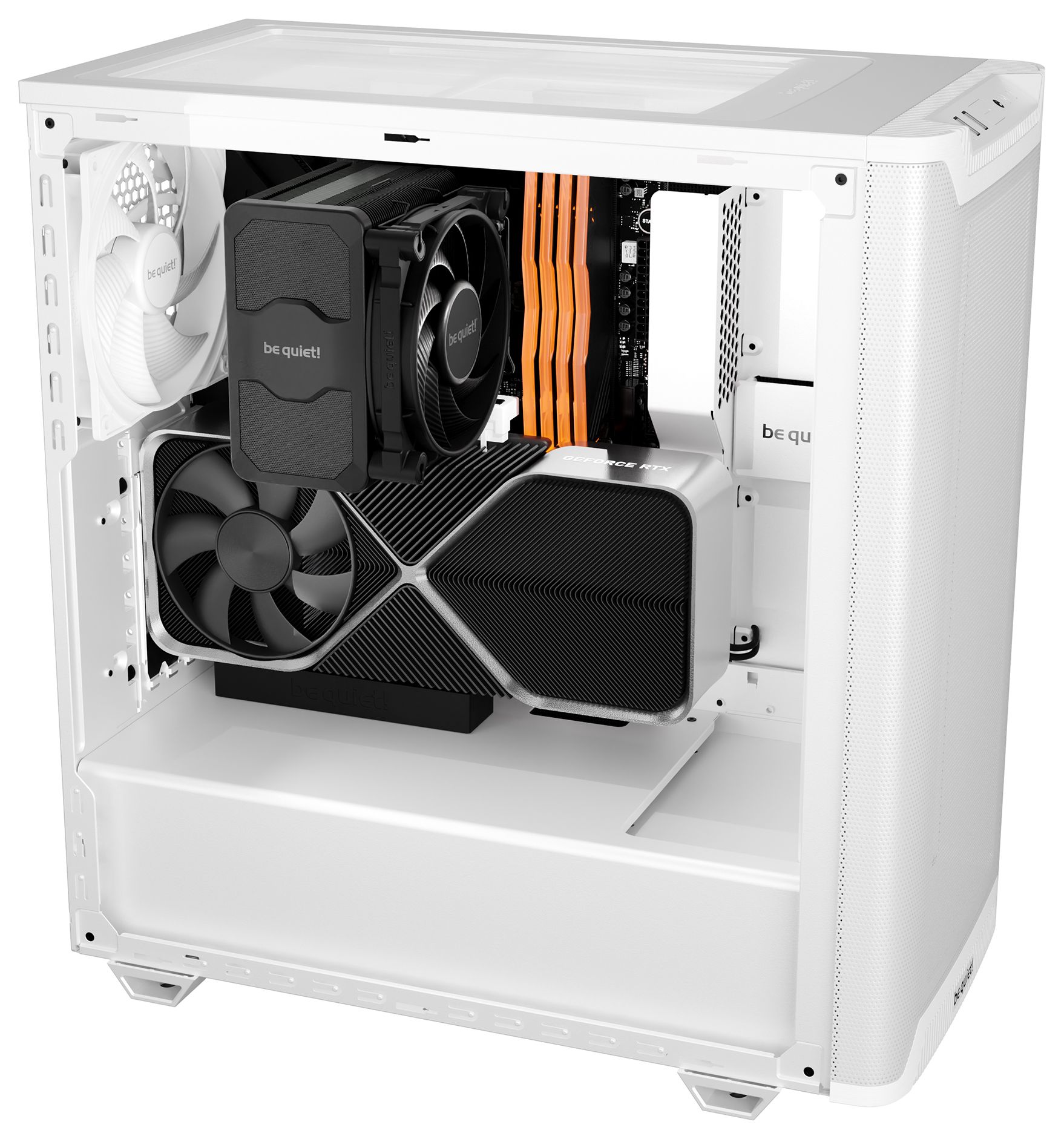 Trotz seiner kompakten Abmessungen bietet Pure Base 501 Airflow Window White genug Platz für High-End Grafikkarten und große Kühler. Die Front fasst bis zu 3 Lüfter oder einen 360mm-Radiator, während im Deckel ebenso entweder 2 Lüfter oder ein Radiator bis zu 240mm Platz finden.