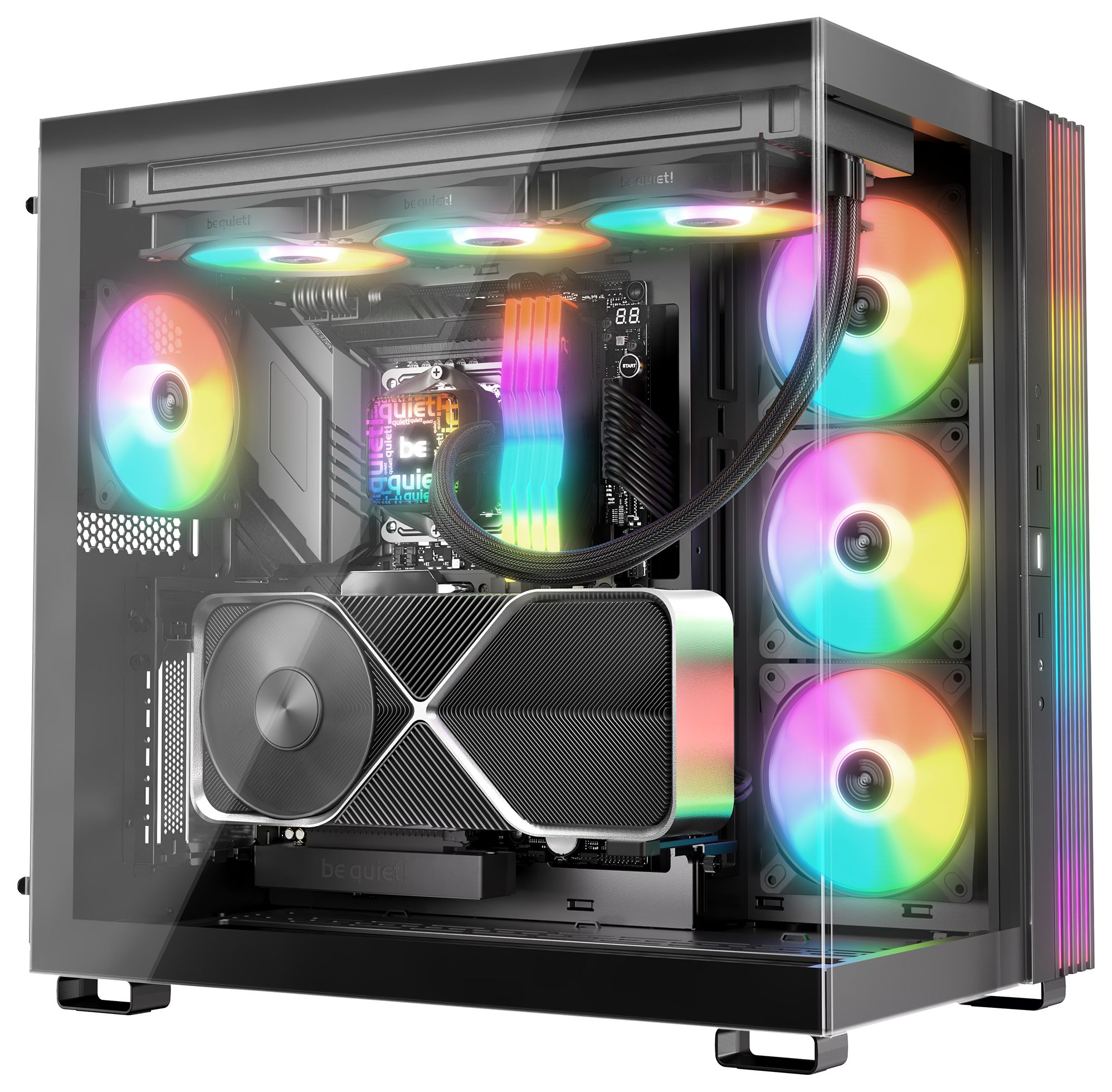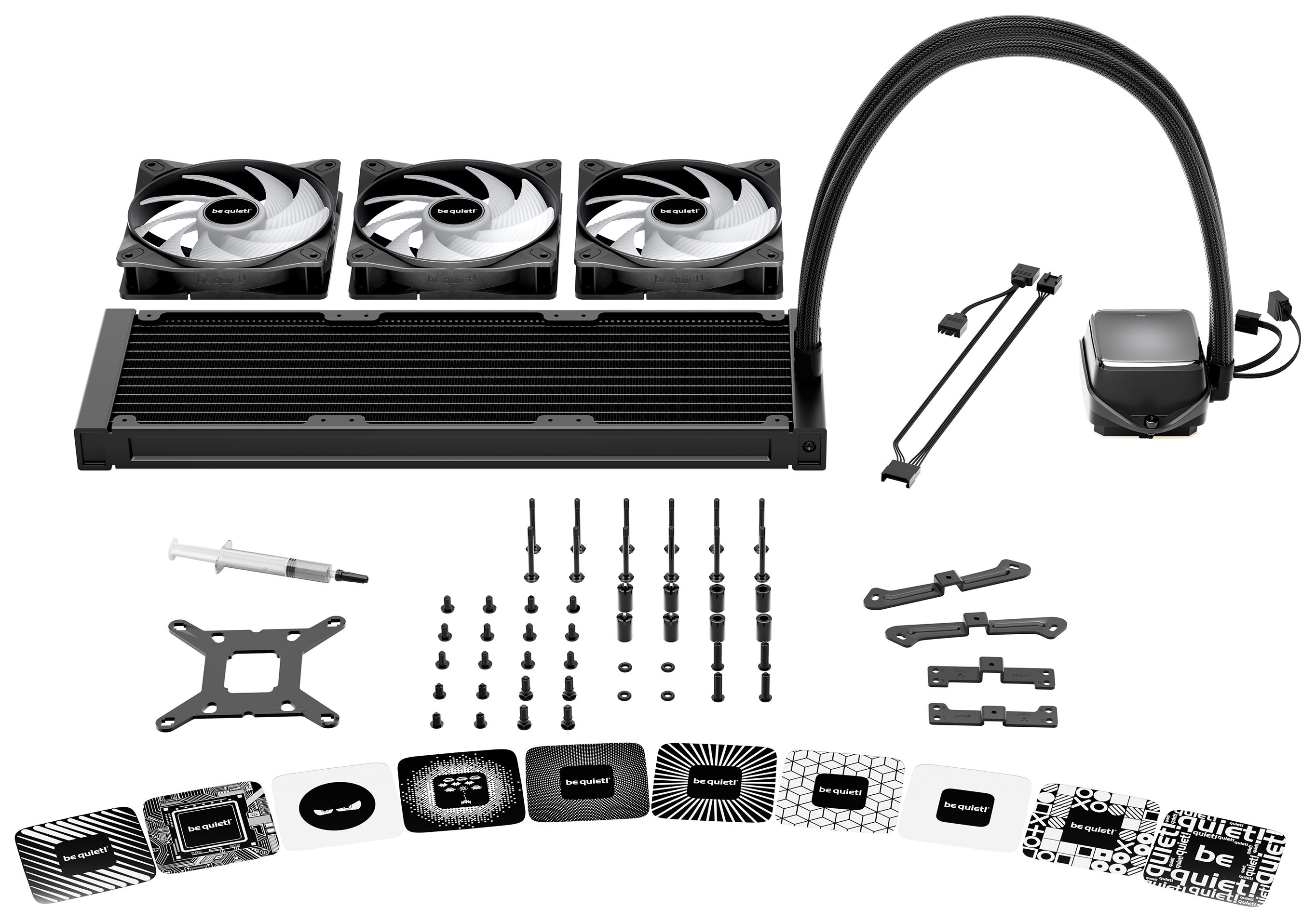 Eine Wasserkühlung mit Pumpe und 3 Lüftern zusätzlich zu den Gehäuselüftern bringt ein Mainboard schnell an seine Grenzen. Die Daisy Chain-Funktion der Pure Loop 3 LX 360mm erlaubt es alle Lüfter in Reihe zu schalten. Wir liefern außerdem nur so viele und so lange Kabel wie unbedingt nötig, um bei einem aufgeräumten Case zu helfen.