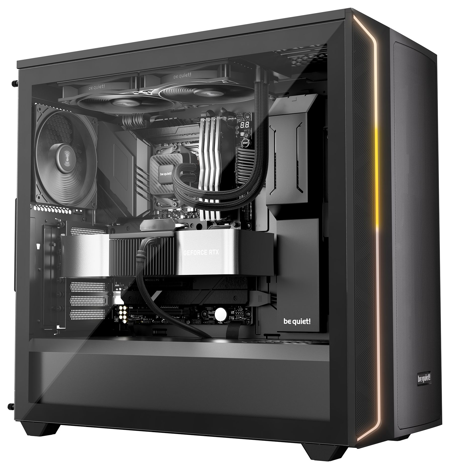Eine Wasserkühlung mit Pumpe und 2 Lüftern zusätzlich zu den Gehäuselüfter bringt ein Mainboard schnell an seine Grenzen. Die Daisy Chain-Funktion der Pure Loop 3 280mm erlaubt es alle Lüfter in Reihe zu schalten. Wir liefern außerdem nur so viele und so lange Kabel wie unbedingt nötig, um bei einem aufgeräumten Case zu helfen.