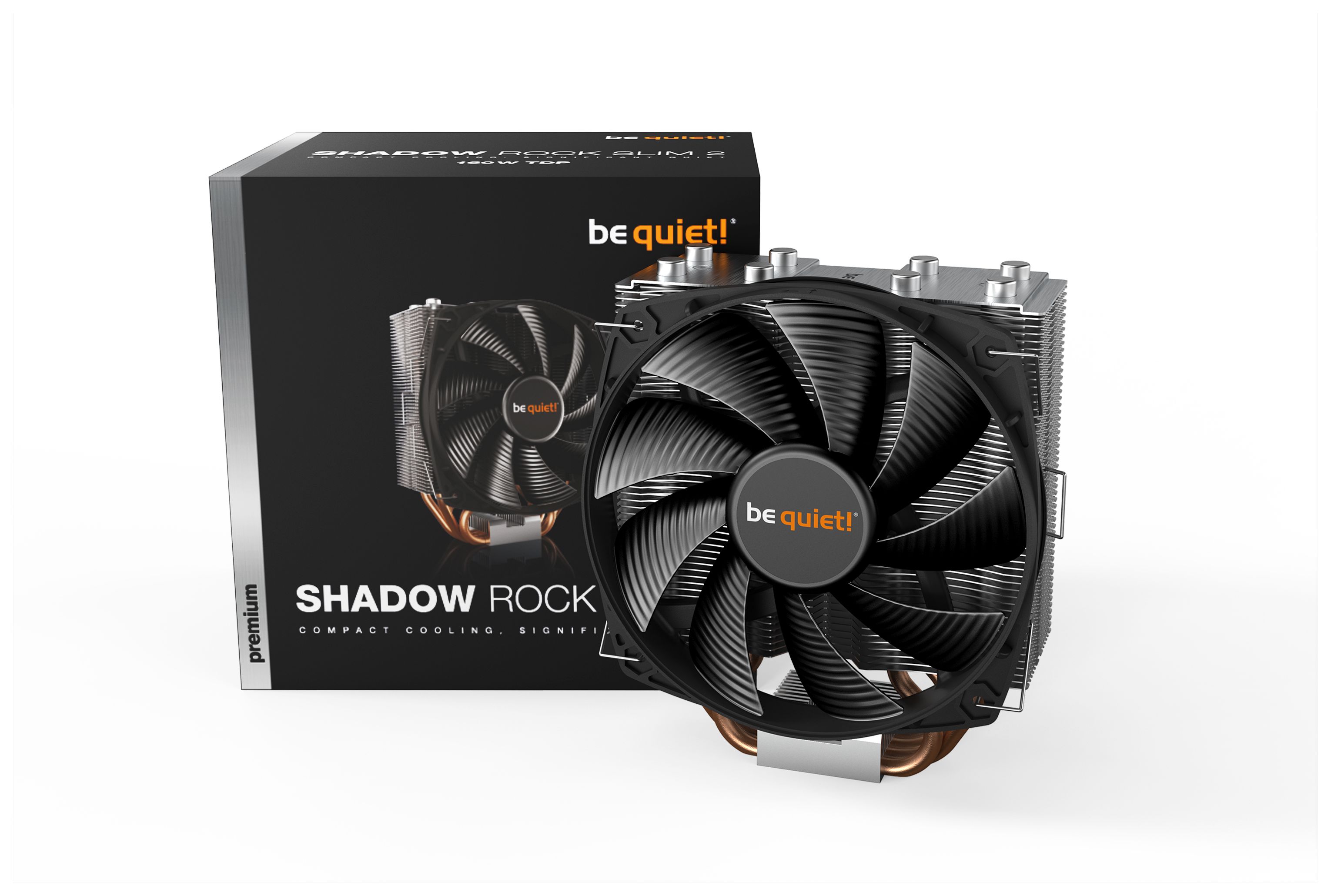 be quiet! SHADOW ROCK SLIM 2. Typ: Kühler, Lüfterdurchmesser: 13,5 cm, Rotationsgeschwindigkeit (max.): 1400 RPM, Lagertyp: Gewehrlager. Breite: 137 mm, Tiefe: 74 mm, Höhe: 161 mm. Produktfarbe: Aluminium, Schwarz, Kupfer
