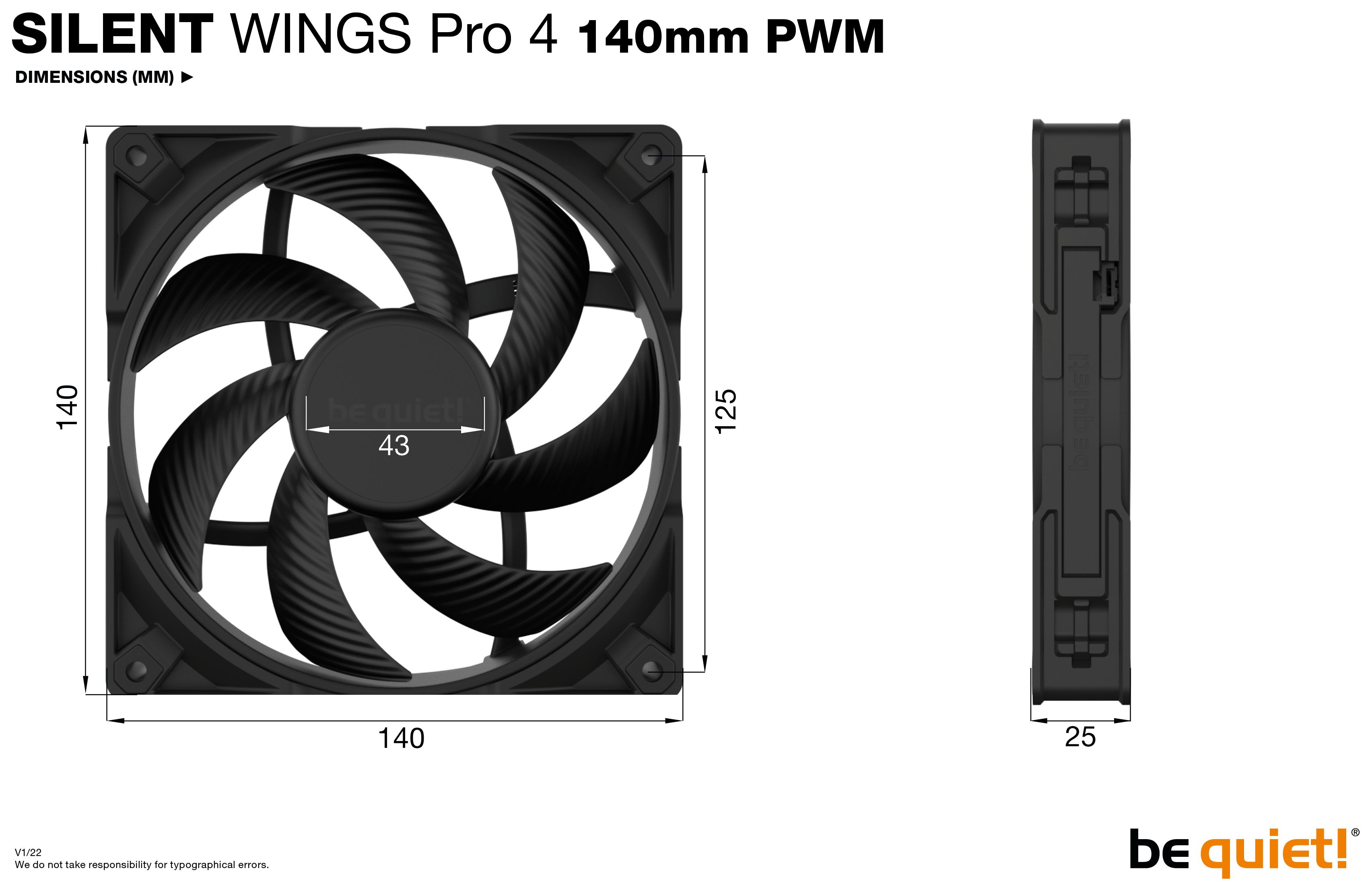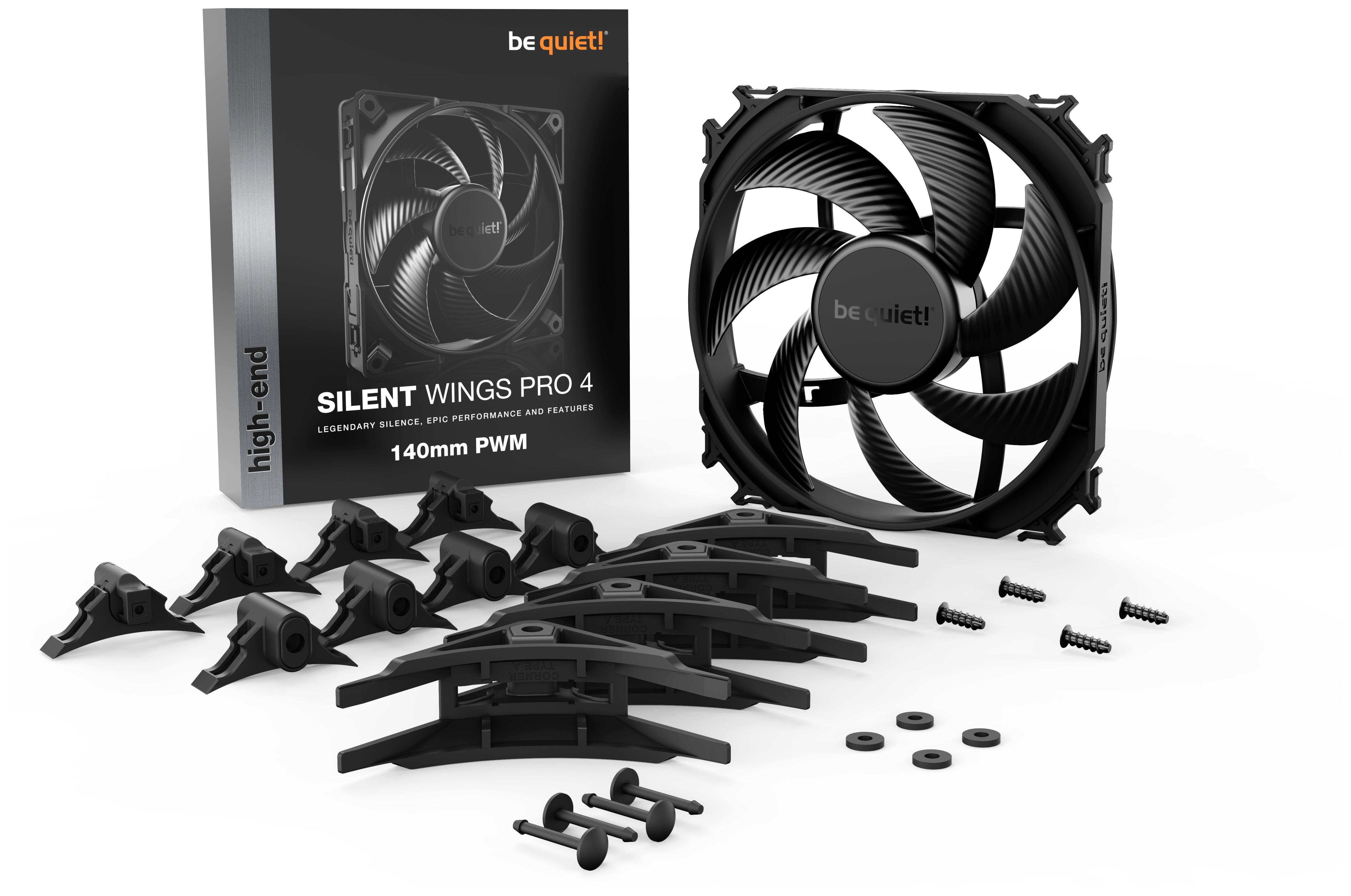be quiet! SILENT WINGS PRO 4 | 140mm PWM. Typ: Ventilator, Lüfterdurchmesser: 14 cm, Rotationsgeschwindigkeit (max.): 2400 RPM, Luftstrom: 165,5 m³/h, Maximum Luftdruck: 3,64 mmH2O, Lagertyp: Fluiddynamisches Lager (FDB). Spannung: 7 - 13.2 V. Breite: 140 mm, Tiefe: 140 mm, Höhe: 25 mm. Produktfarbe: Schwarz