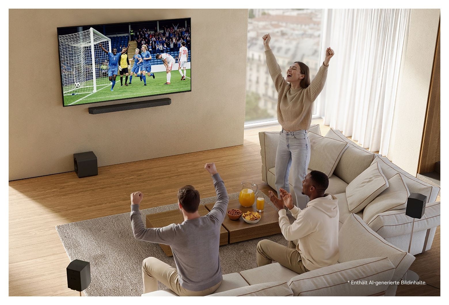 Genieße ein beeindruckend räumliches Sounderlebnis durch die AI-gestützte Harmonie von TV und Soundbar. Unabhängig Von der Quelle erzeugen die beiden Geräte im Zusammenspiel für jede Szene einen Surround Sound, der begeistert.