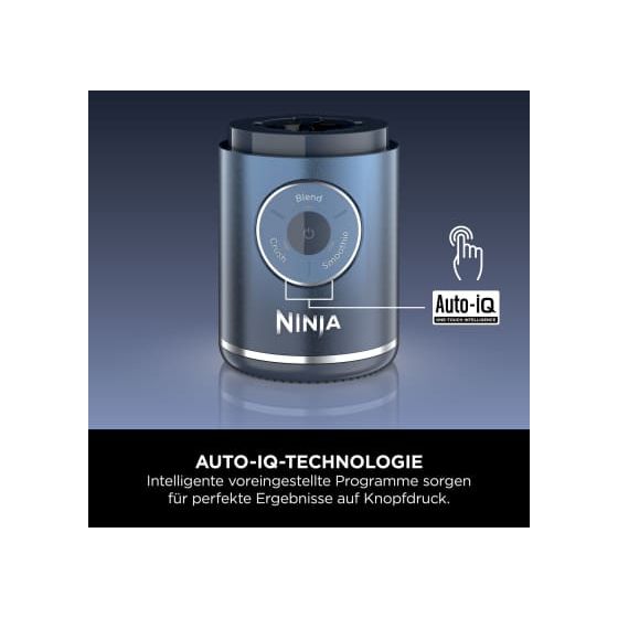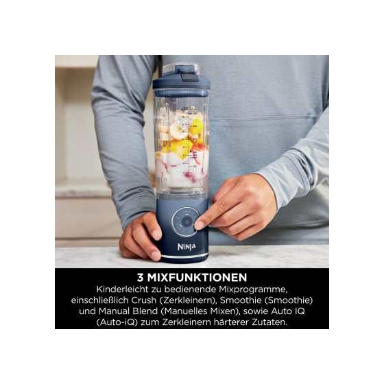 Zwei automatische Auto-iQ-Programme zerkleinern und verarbeiten Zutaten in Sekundenschnelle. Durch einfaches Drehen können Sie den Mixbecher und den auslaufsicheren Deckel entfernen – ideal zum Trinken unterwegs während einer Fitnesseinheit oder bei einem Outdoor-Abenteuer. Und sein trendiges Finish in Blau bedeutet: Mixen mit Stil.