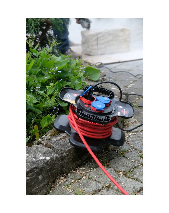 Die 10m Gummi-Kabeltrommel, bestehend aus einer Spezial-Gummimischung für Dauerbelastungen, eignet sich ideal für die ständige Verwendung im Außenbereich dank der Schutzart IP44 und dem robusten RN-Kabel. Die Kabeltrommel für den professionellen Einsatz mit 3 spritzwassergeschützten Schutzkontakt-Steckdosenmit selbstschließenden Deckeln ist beständig gegen diverse Öle, Fette, Benzin und Säuren, UV- und Ozonstrahlung. Die Gummi-Kabeltrommel überzeugt außerdem durch folgende Eigenschaften:
