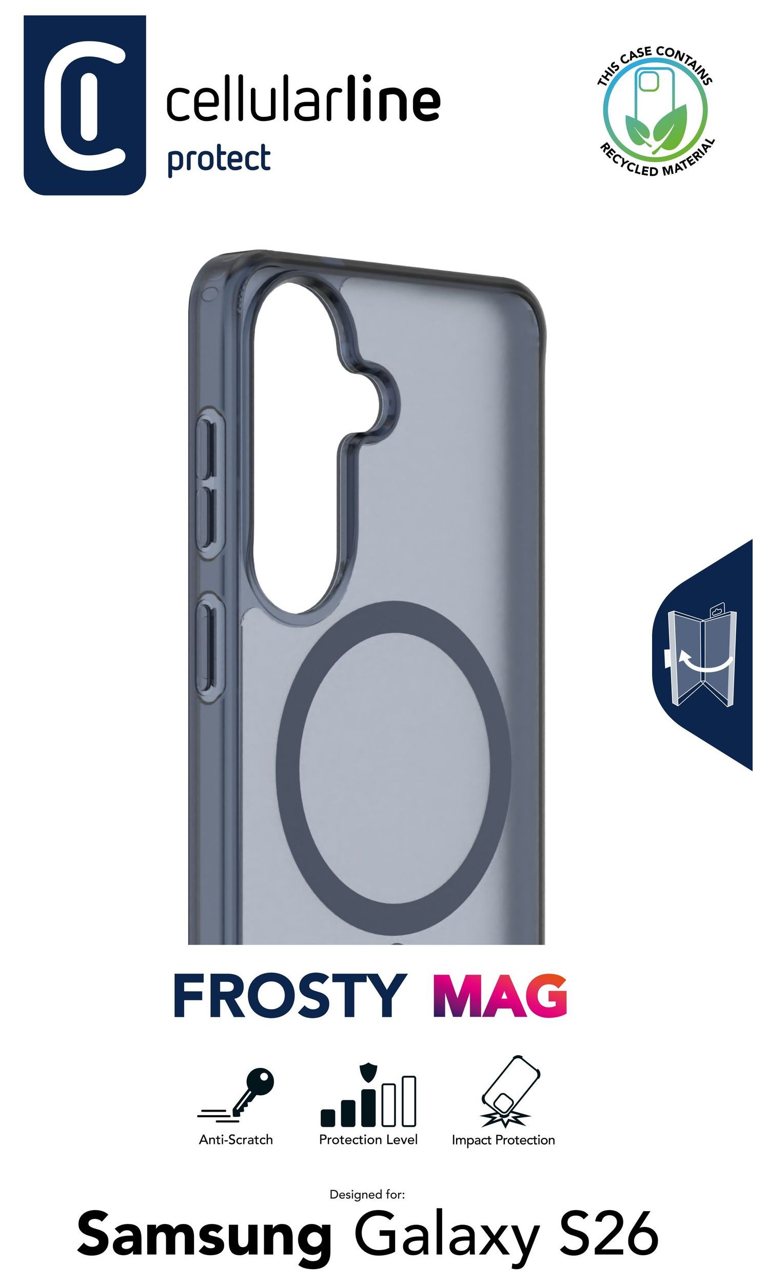 FROSTY MAG von Cellularline ist die ideale Hülle für alle, die Schutz, Stil und Magnetfunktion für Samsung suchen. Die Hybridstruktur mit Hartschale und Gummirahmen bietet zertifizierten Schutz gemäß Military Test Standard. Die matte Oberfläche reduziert Fingerabdrücke und verleiht dem Smartphone ein modernes Aussehen. Dank Qi2-Kompatibilität können magnetische Zubehörteile wie Wallets, Halterungen und Ladegeräte verwendet werden. Teilweise aus recyceltem Kunststoff gefertigt – für eine bewusstere Wahl.