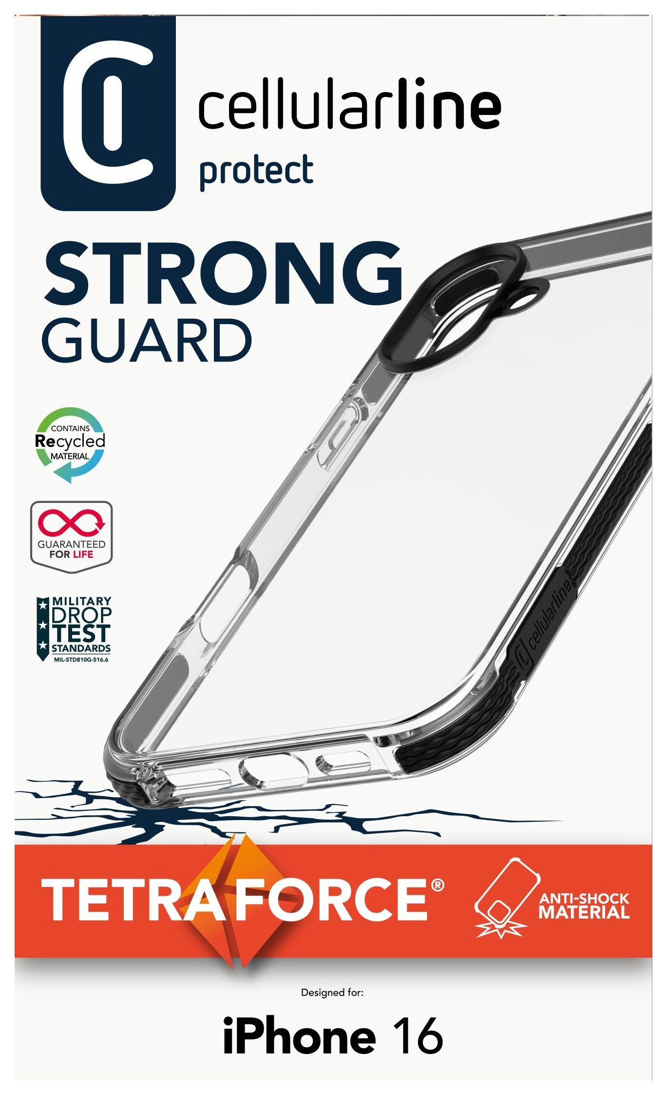 TETRA FORCE STRONG GUARD ist die flexible, ultraschützende Hülle mit erhöhten Rändern und verstärkten Ecken aus technologisch fortschrittlichen Materialien, welche die durch einen Aufprall erzeugten Erschütterungen absorbieren und ableiten können. Die von Cellularline entwickelte IDS (Impact Dissipating System)™-Technologie verwendet das innovative Versaflex™-Material, das die durch den Aufprall erzeugte Energie verteilt und mögliche Schäden an den äußeren und inneren Bauteilen des Smartphones vermeidet. Es wird mit der antibakteriellen Microban®-Technologie kombiniert, die bis zu 99,9% des Bakterienwachstums auf der Oberfläche der Hülle verhindert, und fortlaufend aktiv bleibt, da sie in das Material der Tetra Force Strong Guard integriert ist.Die Tetra Force Strong Guard hat eine lebenslange Garantie: Weitere Informationen finden Sie im Bereich Guaranteed For Life von Cellularline