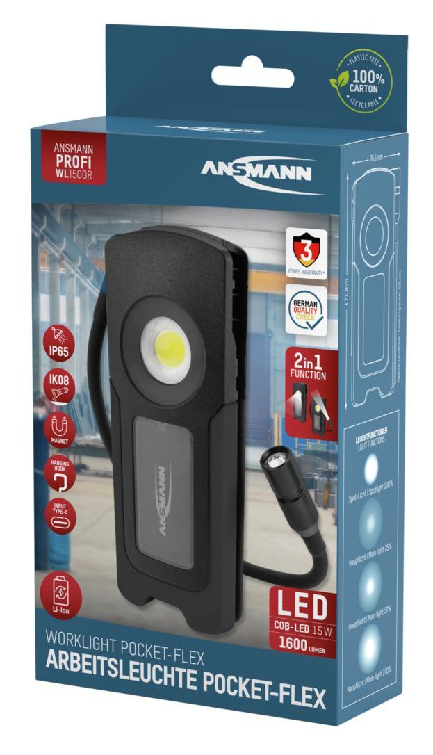 Ansmann Arbeitsleuchte WL1500R Pocket Flex. Lampentechnologie: LED, Anzahl an Lampen: 2 Glühbirne(n), Lampenleistung: 15 W. Produktfarbe: Schwarz, Grau, Internationale Schutzart (IP-Code): IP65, Code mechanischer Aufprallschutz: IK08. Energiequelle: Akku, Akku-/Batterietechnologie: Lithium-Ion (Li-Ion), Akku-/Batteriekapazität: 4400 mAh. Länge (cm): 30 cm, Breite: 76,5 mm, Tiefe: 40,7 mm. Anzahl Produkte pro Versandkarton: 20 Stück(e), Länge des Versandkartons: 362 mm, Breite des Versandkartons: 226 mm